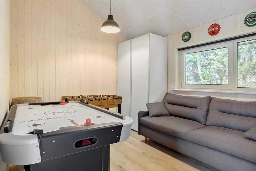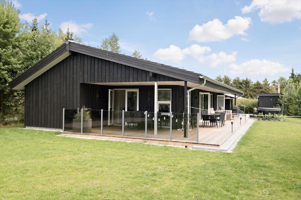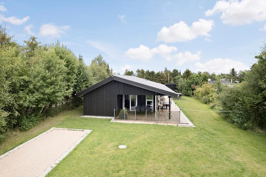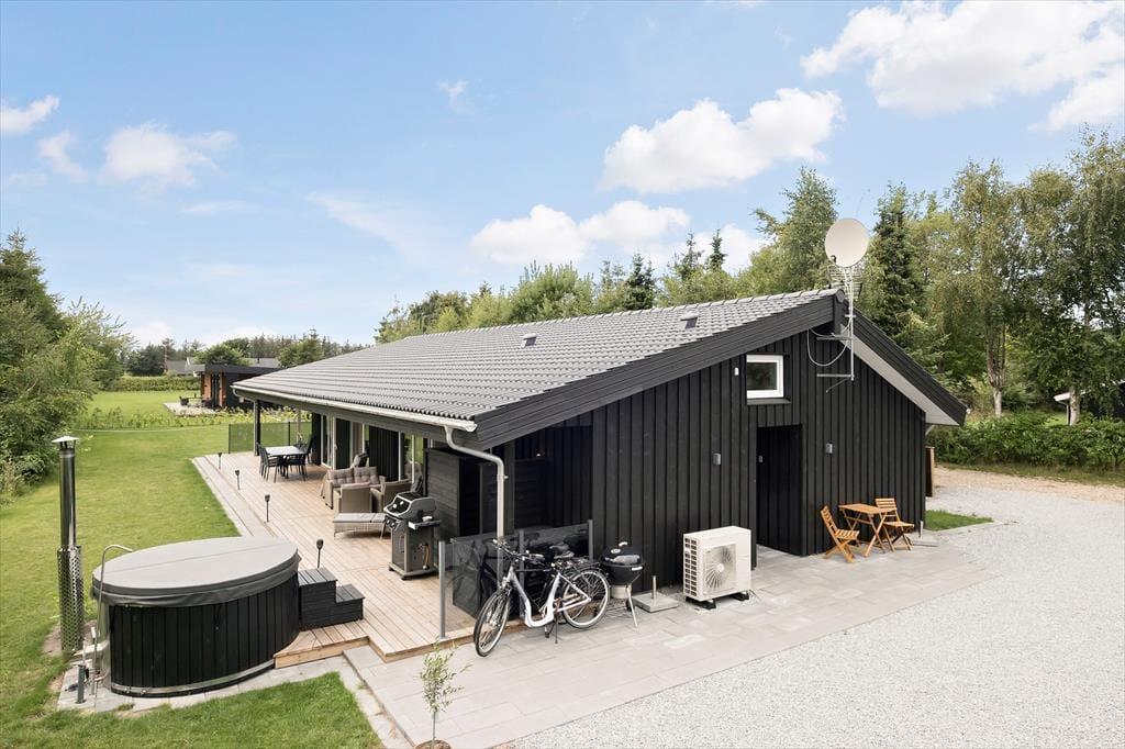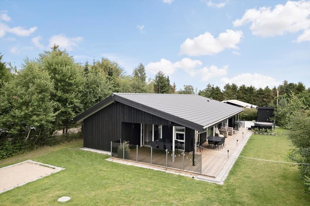 Med sin mørke facade og flotte træterrasse kan man straks fra ankomsten se, at der er tale om et hus af høj kvalitet. Det kan bestemt også fornemmes inden døre i de pæne og velindrettede rum – blandt andet i det store opholdsrum, der byder på stue og køkken i åben forbindelse. Trænger I til at slappe af, er det største af de to badeværelse på lækker vis udstyret med spabad og sauna, og skal der være mere gang i den, kan I spille airhockey og dart i aktivitetsrummet. Her står der for øvrigt en dobbelt sovesofa, der ved nattetid fungerer som et godt supplement til de fire soveværelsers komfortable senge.