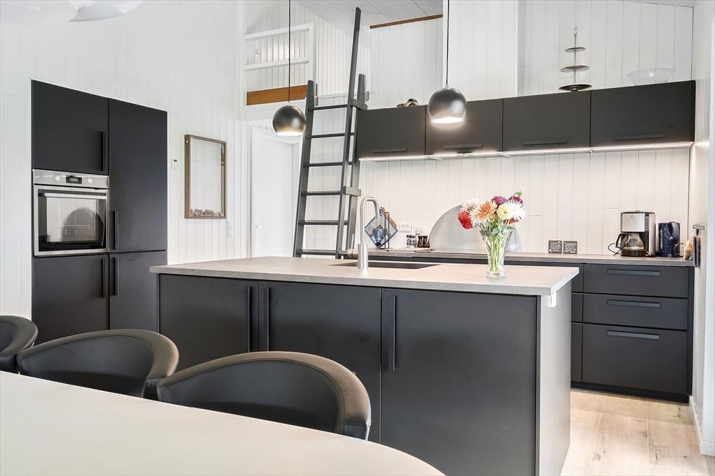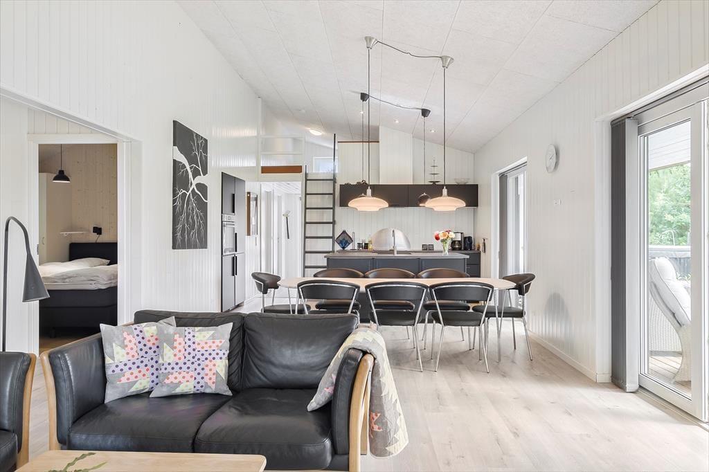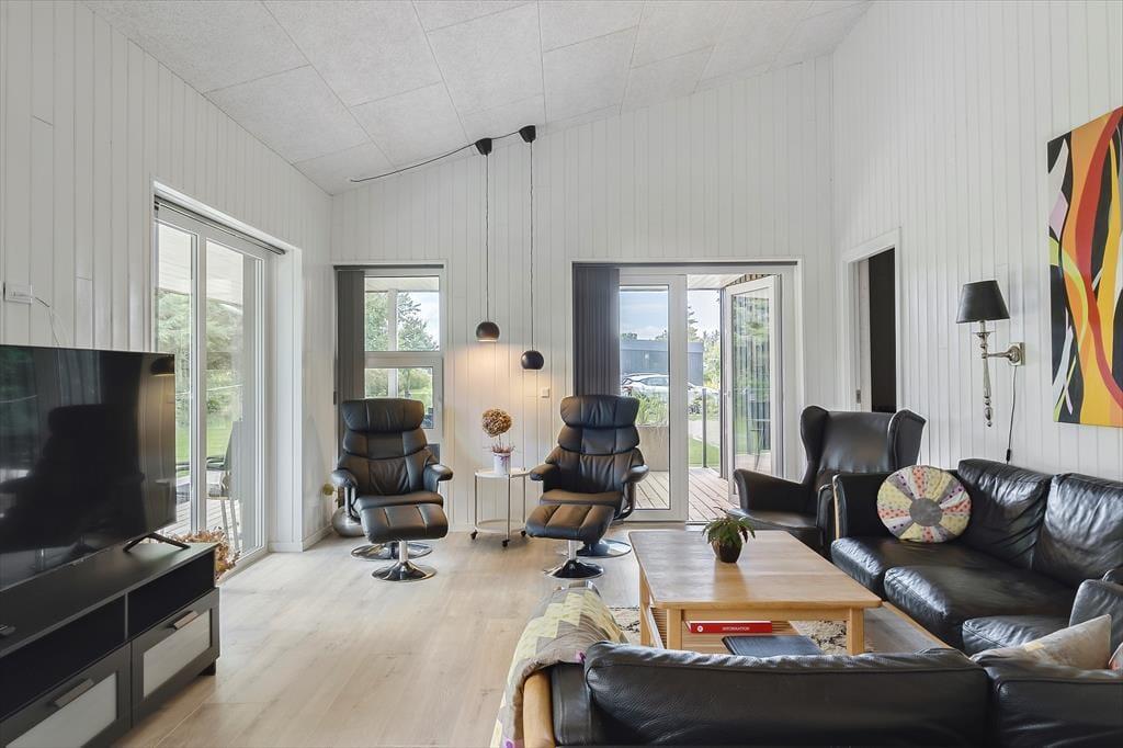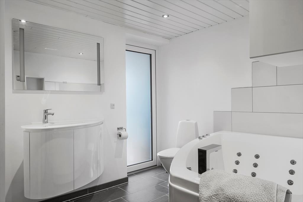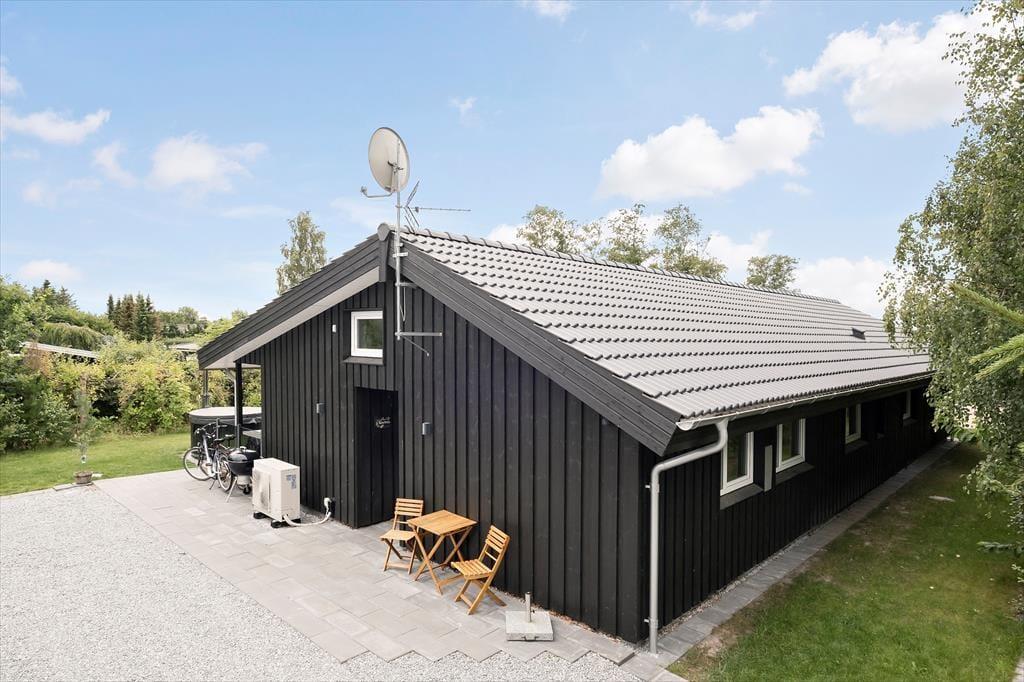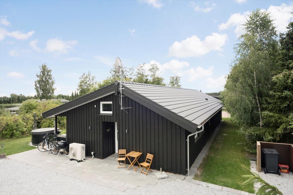 Med sin mørke facade og flotte træterrasse kan man straks fra ankomsten se, at der er tale om et hus af høj kvalitet. Det kan bestemt også fornemmes inden døre i de pæne og velindrettede rum – blandt andet i det store opholdsrum, der byder på stue og køkken i åben forbindelse. Trænger I til at slappe af, er det største af de to badeværelse på lækker vis udstyret med spabad og sauna, og skal der være mere gang i den, kan I spille airhockey og dart i aktivitetsrummet. Her står der for øvrigt en dobbelt sovesofa, der ved nattetid fungerer som et godt supplement til de fire soveværelsers komfortable senge.