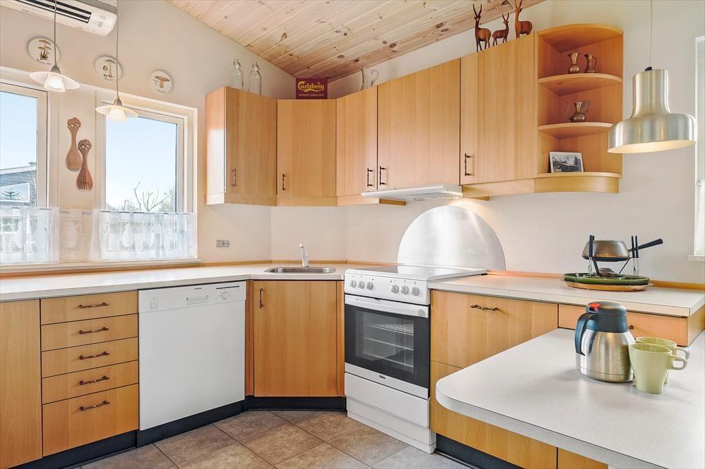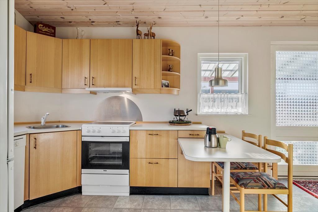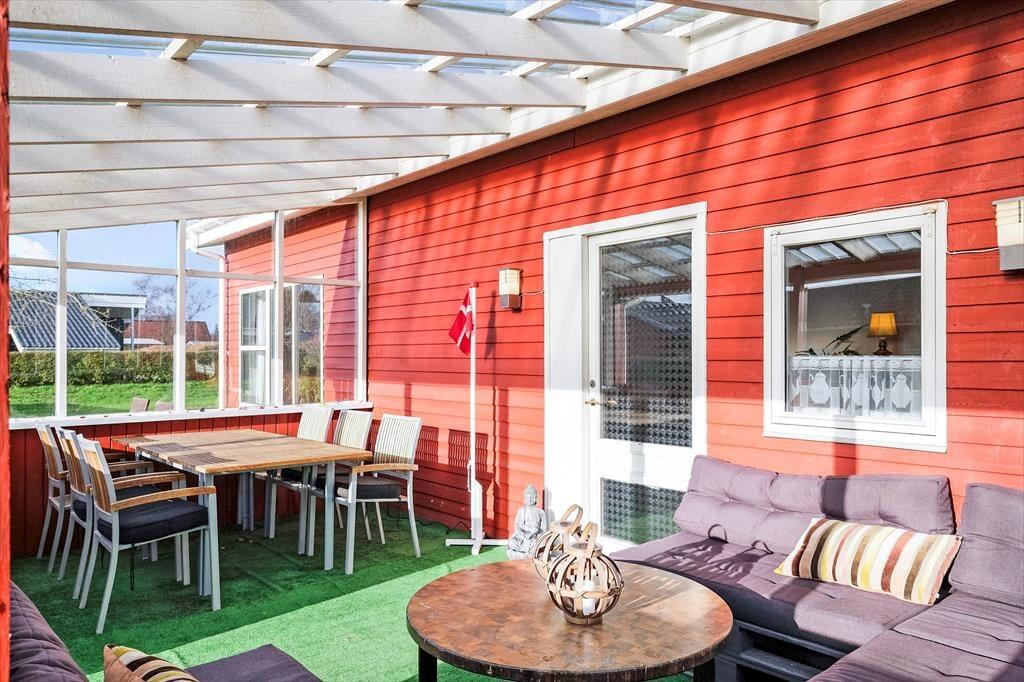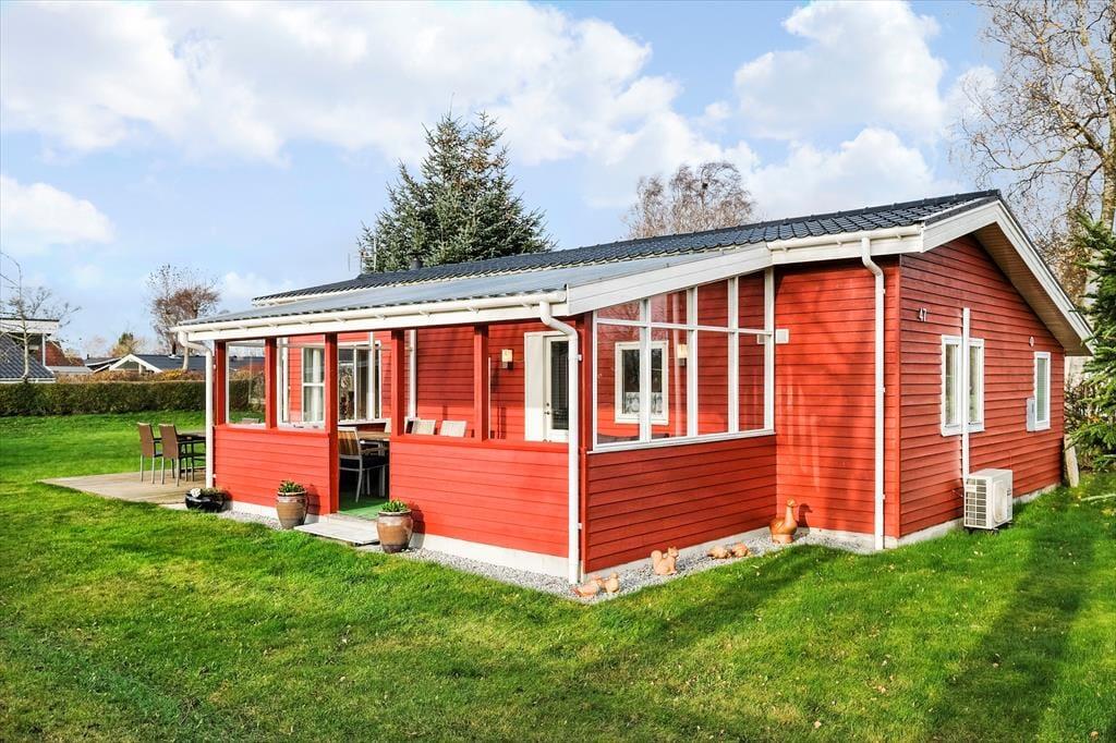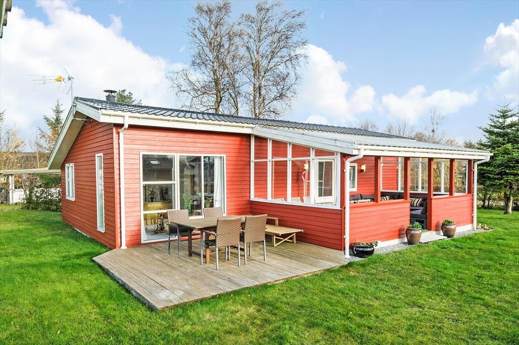 Sommerhuset har et pænt og klassisk udseende med sin røde træfacade og en hyggelig, lukket terrasse. Herfra kan I fortsætte lige ind i opholdsafdelingen, hvor stue og køkken ligger i åben forbindelse. Spisebordet er en dejlig siddeplads, uanset om der er brætspil eller aftenmad på programmet, og når der rigtigt skal slappes af, kan det ske i sofakrogen – eventuelt med ild i brændeovnen og en god film på fladskærms-tv’et, der har Chromecast tilsluttet. Et pænt badeværelse og et lille depotrum med vaskemaskine hører også med til planløsningen foruden to gode soveværelser, hvor I kan se frem til at sove længe.