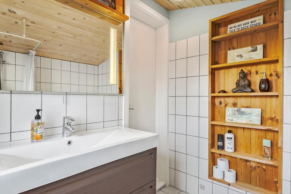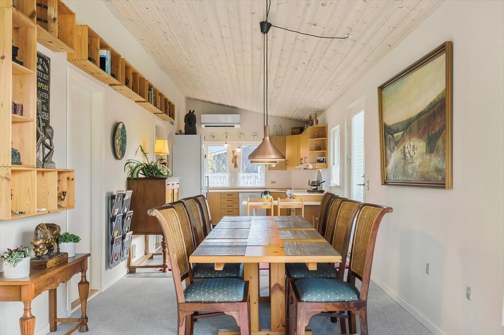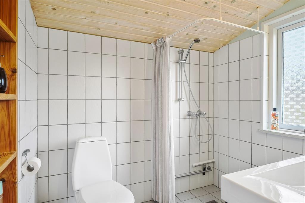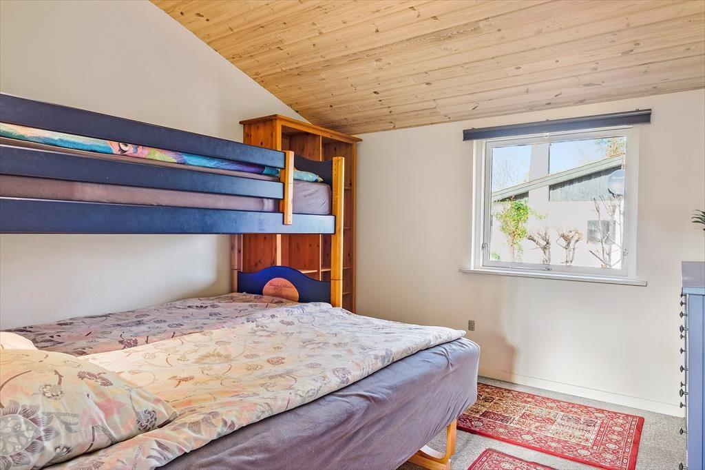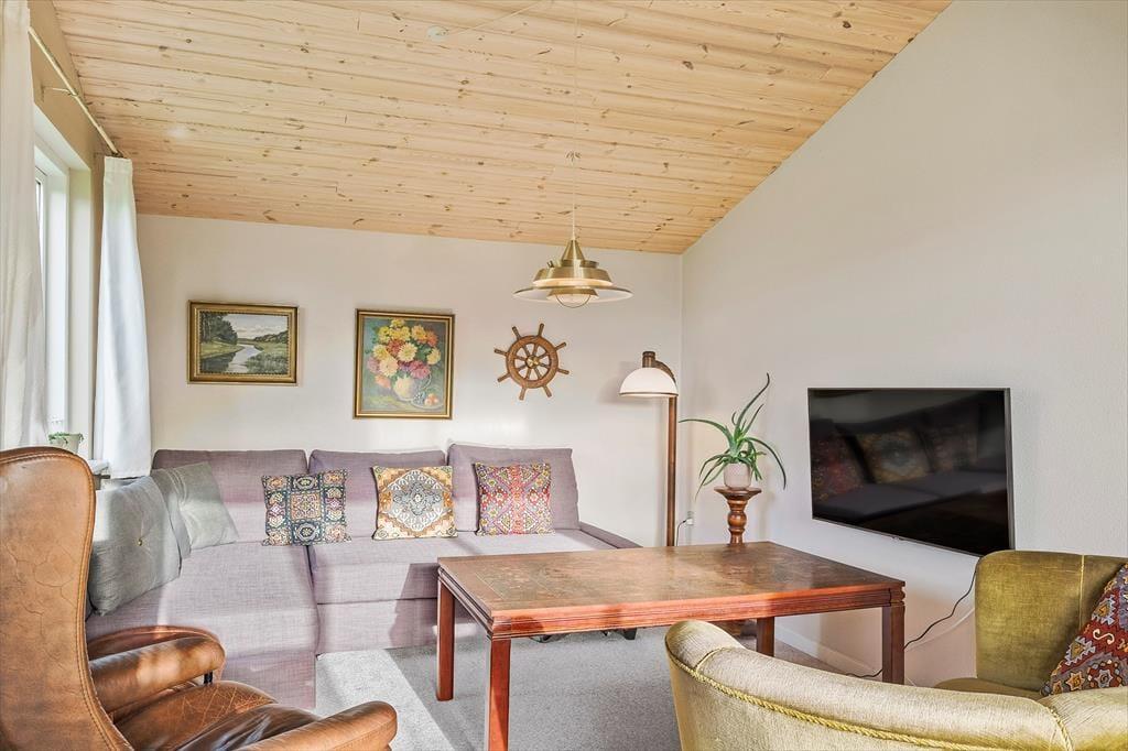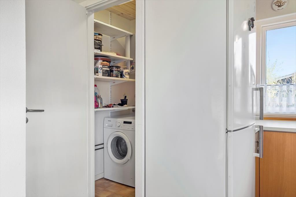 Sommerhuset har et pænt og klassisk udseende med sin røde træfacade og en hyggelig, lukket terrasse. Herfra kan I fortsætte lige ind i opholdsafdelingen, hvor stue og køkken ligger i åben forbindelse. Spisebordet er en dejlig siddeplads, uanset om der er brætspil eller aftenmad på programmet, og når der rigtigt skal slappes af, kan det ske i sofakrogen – eventuelt med ild i brændeovnen og en god film på fladskærms-tv’et, der har Chromecast tilsluttet. Et pænt badeværelse og et lille depotrum med vaskemaskine hører også med til planløsningen foruden to gode soveværelser, hvor I kan se frem til at sove længe.