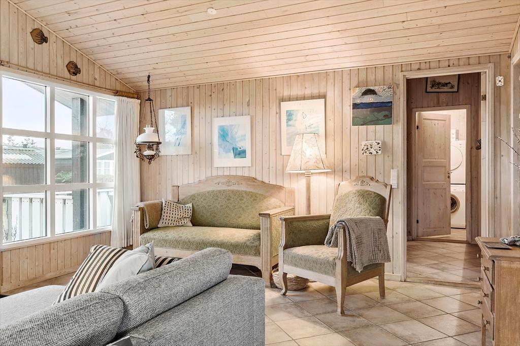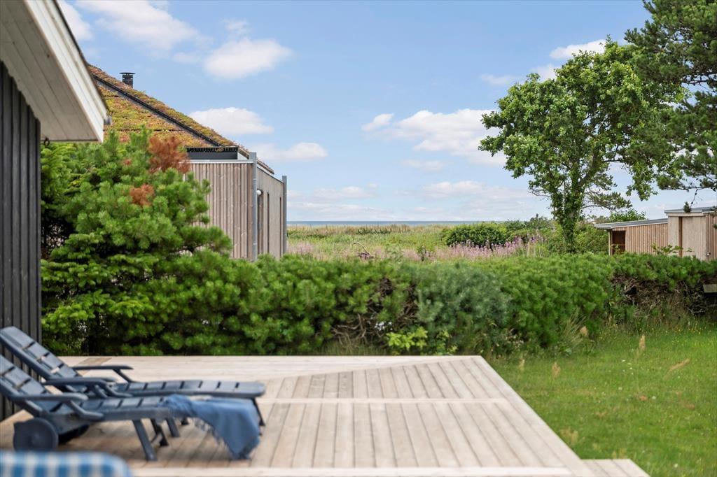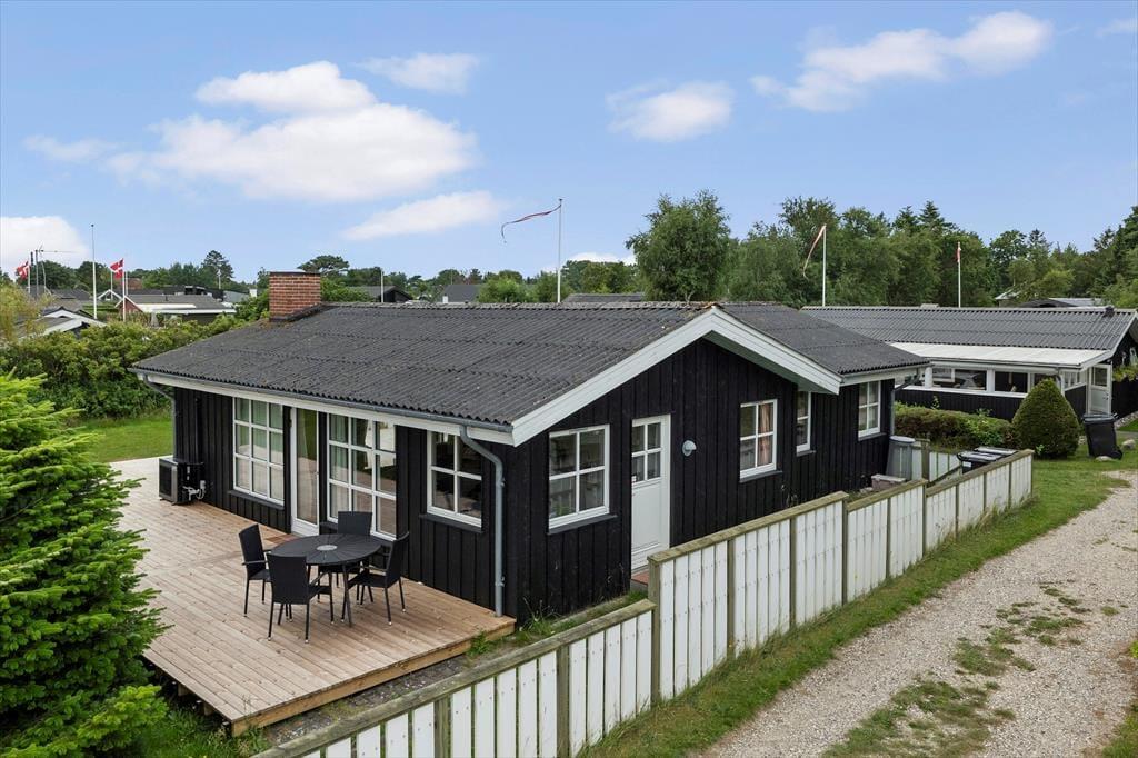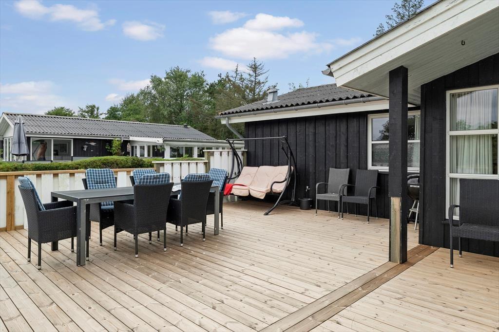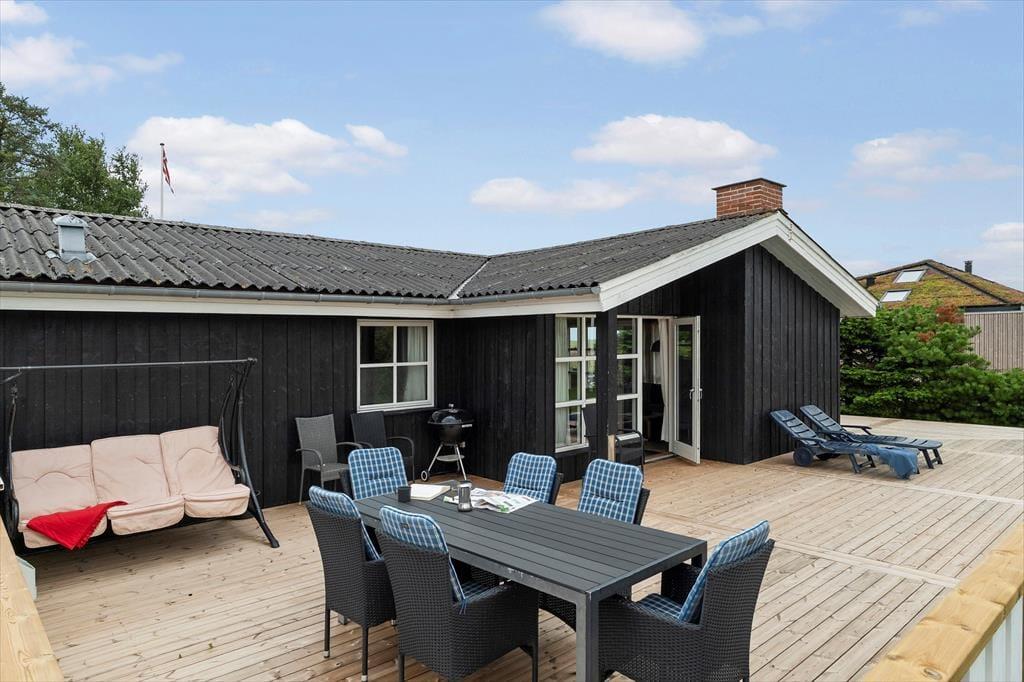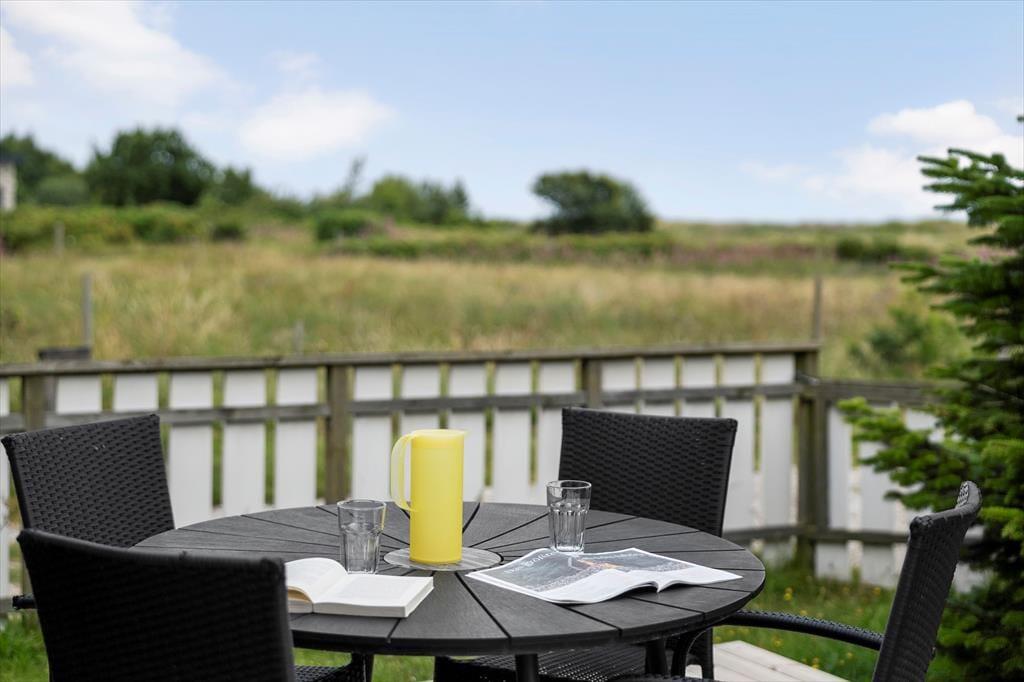 Fra opholdsrummet har I direkte adgang til de to terrasser, der breder sig øst og syd for sommerhuset. Der er også et bord-og-bænkesæt på grundens græsplæne – hvor I også kan lege og spille bold med de yngste familiemedlemmer. Ud over havemøbler og liggestole har I en grill til rådighed, så om aftenen kan I forkæle jer selv med et friskgrillet festmåltid under åben himmel.