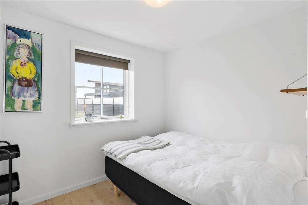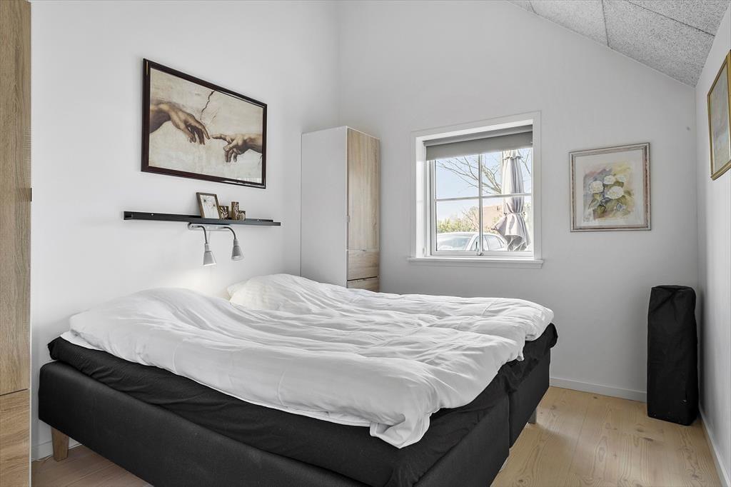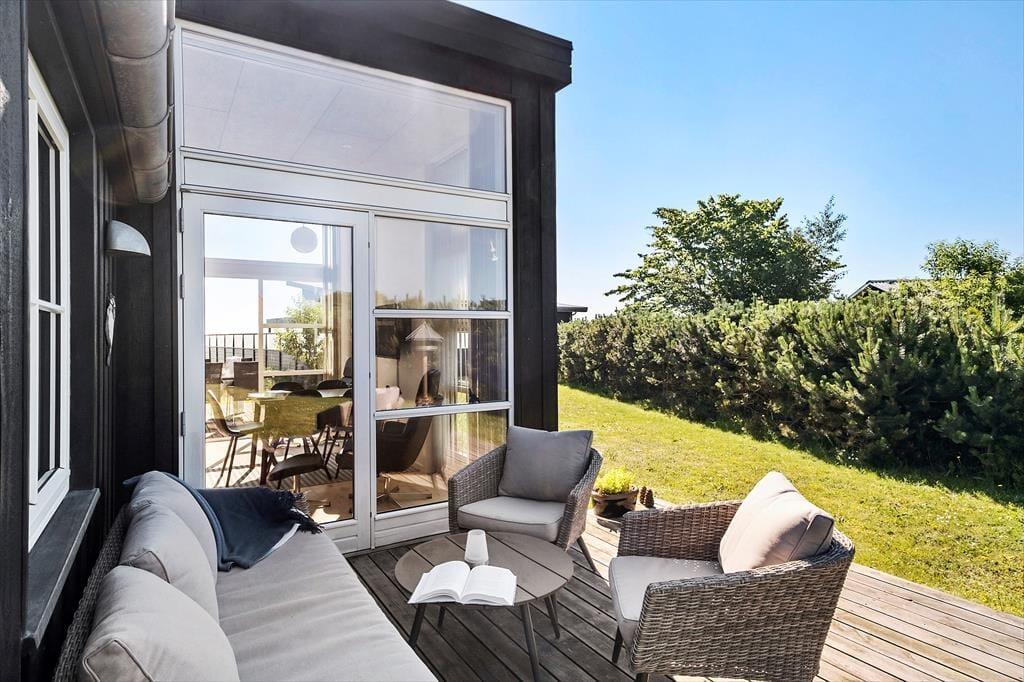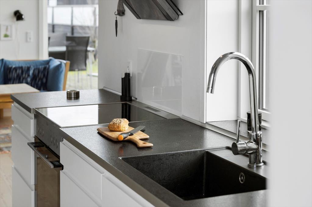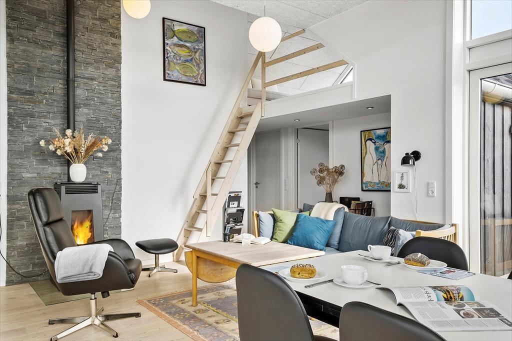 Inde bag sommerhusets mørke træfacade venter der dig en lys og venlig feriebolig med god plads til det tilbagelænede driverliv. Stuen er et herligt sted at slå sig ned med en spændende bog og en varm kop kaffe, og hvis du kan lide at lave mad, skal du glæde dig til at finde lækre råvarer frem fra køleskabet og gå i gang i det åbne køkken. Gennem de høje stuevinduer kan du se vandet, og havudsigten bliver kun endnu bedre, hvis du tager den stejle trappe op til hemsen. Her er der en sovesofa, hvis du vil blive siddende eller måske ligefrem overnatte – selvom husets tre værelser bestemt også er rare steder at sove.