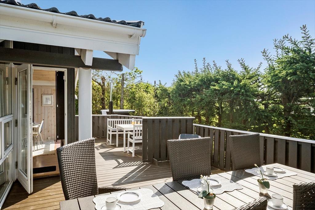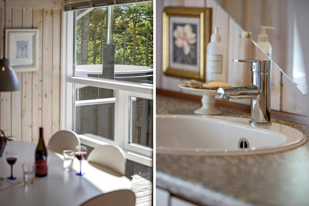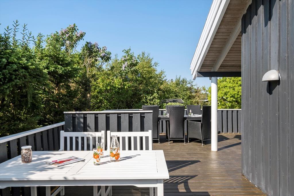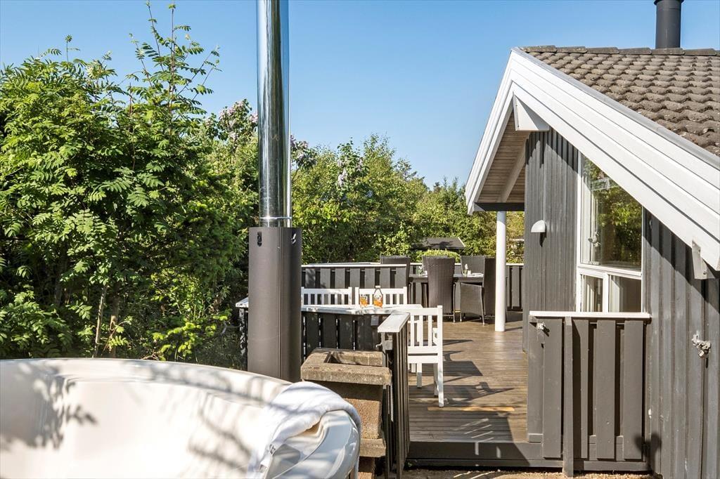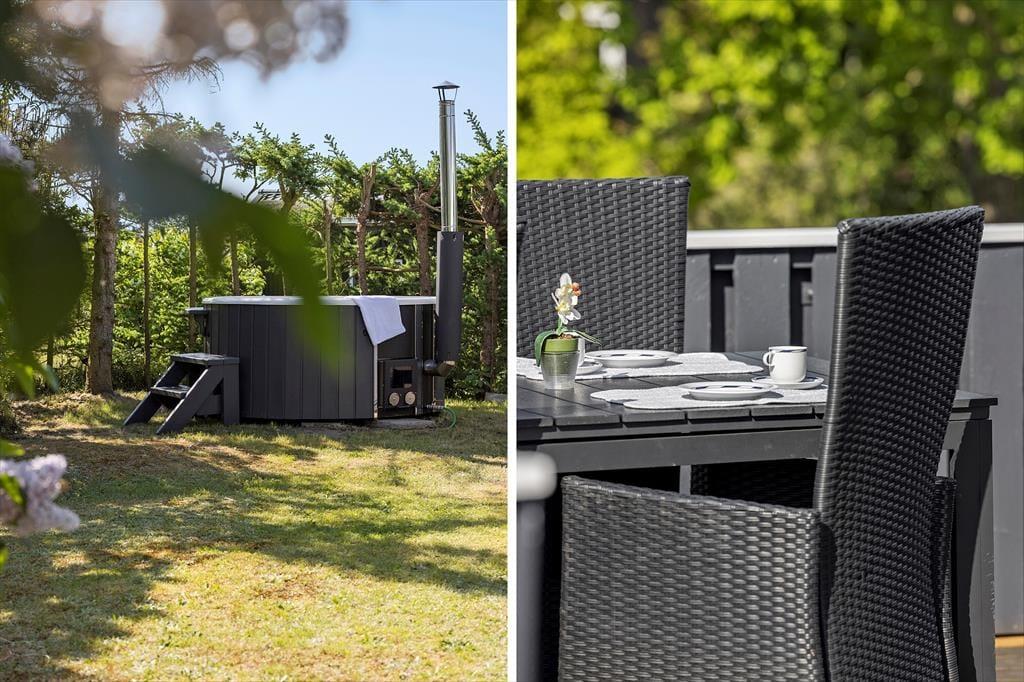Fra stuen har du direkte adgang til en dejligt stor træterrasse, der kysses af solen fra morgen til aften. På den grønne naturgrund finder du også en overdækket terrasse såvel som en flisebelagt terrasse – så mon ikke du finder den helt perfekte opholdsplads, når du trænger til at nyde livet i det fri? Måske især om aftenen vil vildmarksbadet sikkert også vække glæde: Her er der plads til 5-6 personer, og vandet kan opvarmes med den tilhørende brændeovn, så du og dine kære kan se frem til at have det skønt under stjernehimlen.