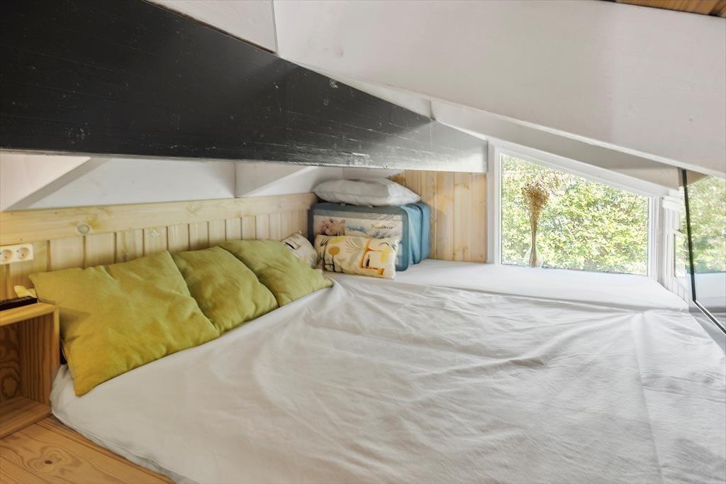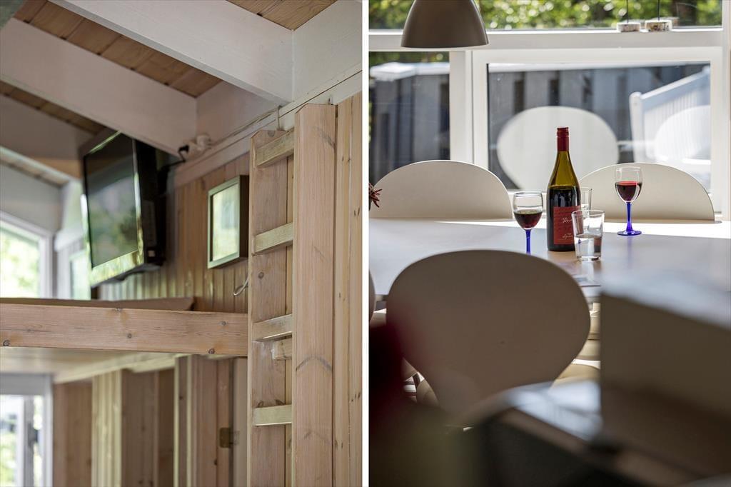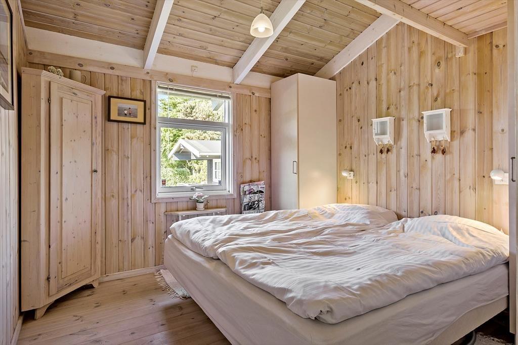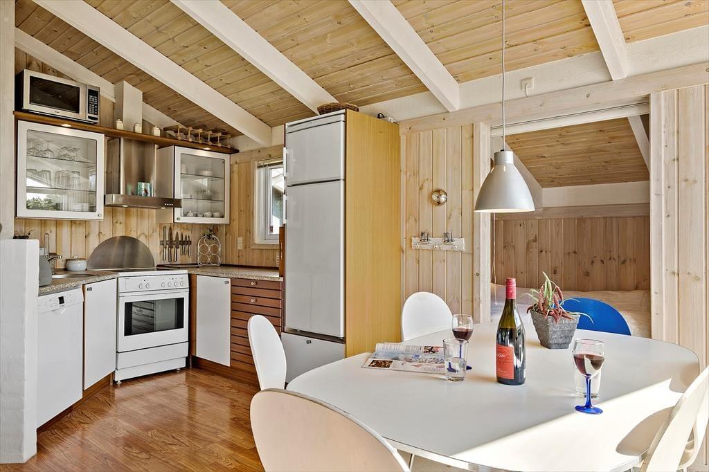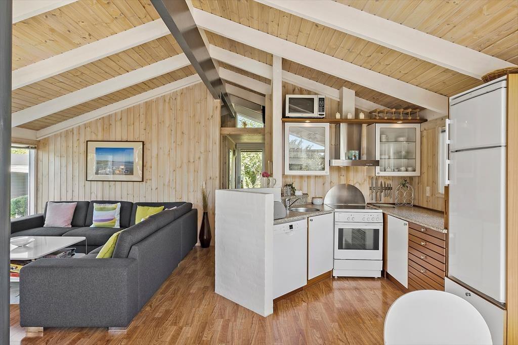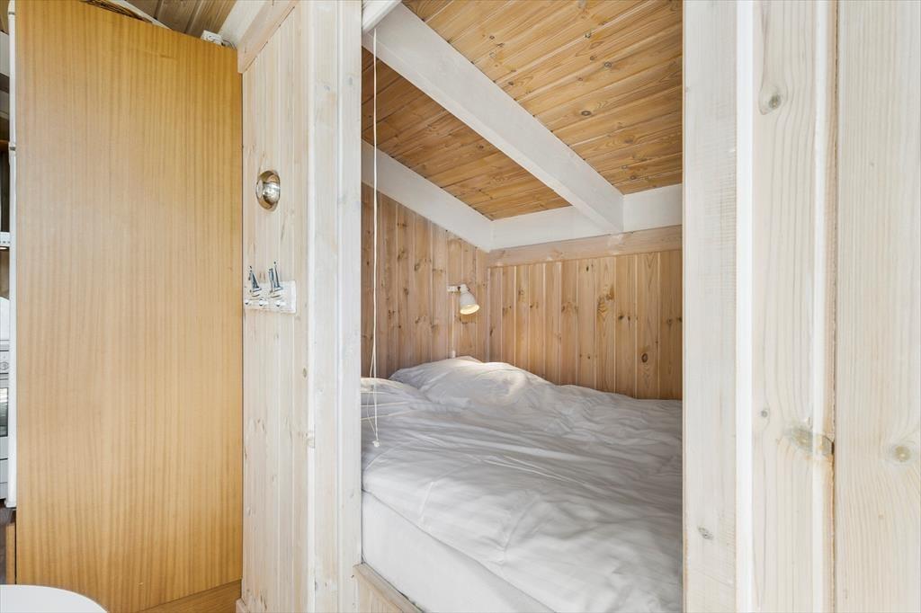 Sommerhusets velgennemtænkte indretning og rare atmosfære betyder, at her er skønt at være – uanset om du er her med din bedre halvdel eller har hele familien med. Det lyse køkken ligger i åben forbindelse med husets dejlige spise- og opholdsstue, og her er der på helt klassisk manér loft til kip, brændeovn og komfortabelt møblement. Sofaafdelingen er god at slænge sig i, og alkoven indbyder til, at du tager en time på langs efter frokosten. Sådan noget er der nemlig tid til, når det endelig er ferie! Om natten fungerer både alkoven og hemsen som et godt supplement til de to soveværelser.