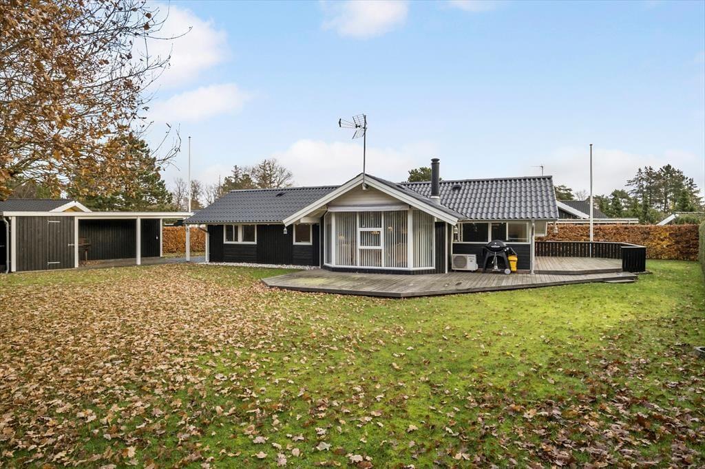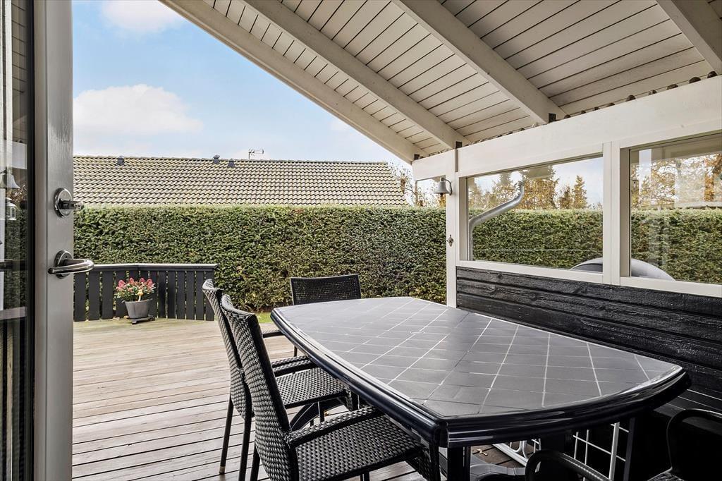 Når vejret er godt, er det svært at modstå den skønne overdækkede terrasse. Her kan du nyde morgenkaffen i ro og mag eller tilbringe timevis med gode samtaler og lækker grillmad. Terrassen fungerer som en naturlig forlængelse af husets opholdsrum og skaber en perfekt ramme for udendørs hygge. Med udsigt til den grønne natur og den fredelige beliggenhed får du en helt særlig ferieoplevelse. I haven er der både plads til afslapning og leg, og du kan f.eks. nyde solen på en af havemøblerne eller lade børnene løbe rundt på græsset.