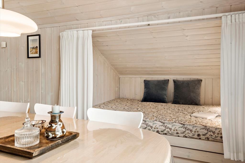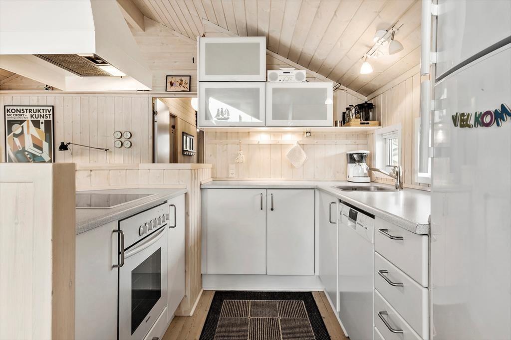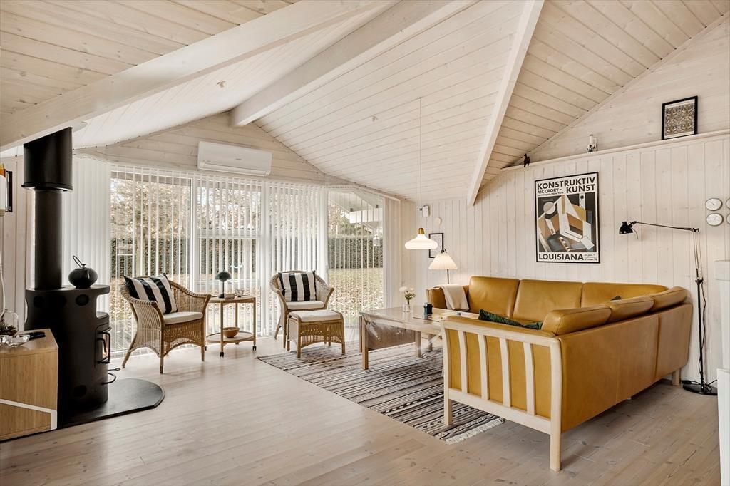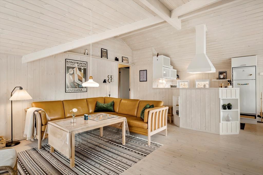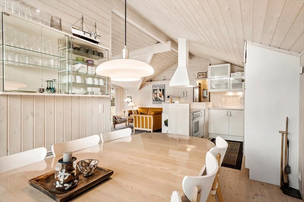 Indenfor i sommerhuset bliver du mødt af et lyst og åbent rum, hvor den varme træindretning og de lette, lyse farver skaber en indbydende atmosfære. Her er der lagt stor vægt på hygge, og den charmerende alkove indbyder til afslapning med en god bog eller en stille stund. Stuen og køkkenet er forbundet i et åbent rum, så der er god plads til både fælles måltider og samvær. De store vinduer lukker masser af lys ind og giver et flot kig ud til den grønne have, så du føler dig tæt på naturen. Når aftenen falder på, kan du tænde op i brændeovnen og nyde den hyggelige stemning, mens du ser en film eller slapper af efter en dag fyldt med ferieaktiviteter.