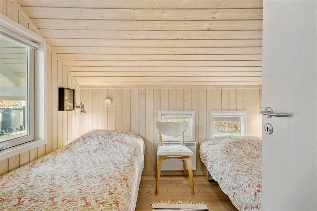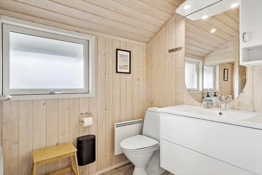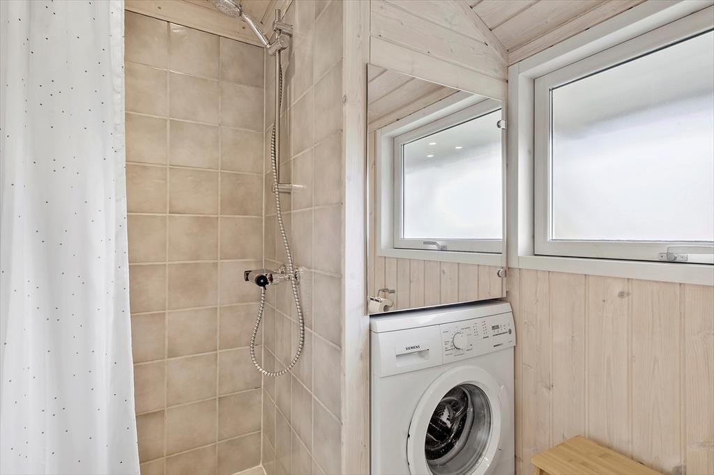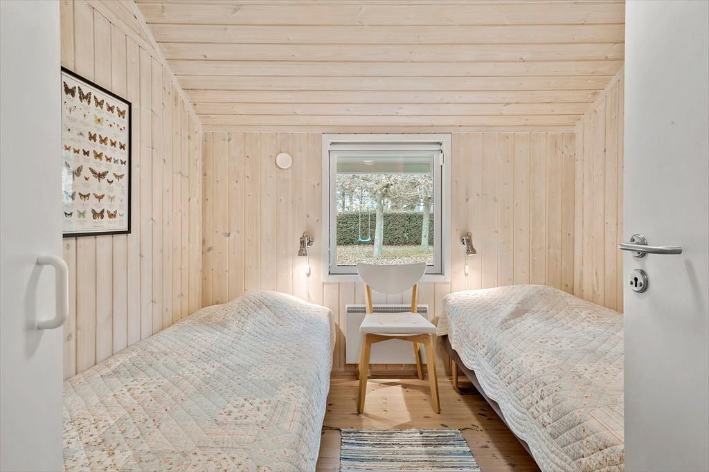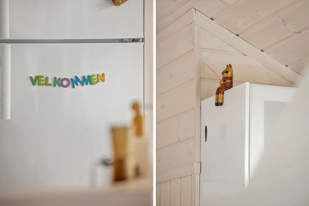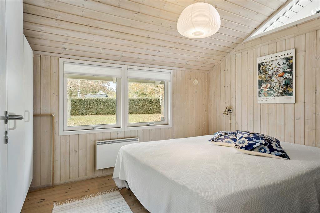 Indenfor i sommerhuset bliver du mødt af et lyst og åbent rum, hvor den varme træindretning og de lette, lyse farver skaber en indbydende atmosfære. Her er der lagt stor vægt på hygge, og den charmerende alkove indbyder til afslapning med en god bog eller en stille stund. Stuen og køkkenet er forbundet i et åbent rum, så der er god plads til både fælles måltider og samvær. De store vinduer lukker masser af lys ind og giver et flot kig ud til den grønne have, så du føler dig tæt på naturen. Når aftenen falder på, kan du tænde op i brændeovnen og nyde den hyggelige stemning, mens du ser en film eller slapper af efter en dag fyldt med ferieaktiviteter.