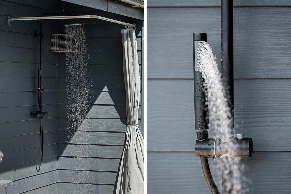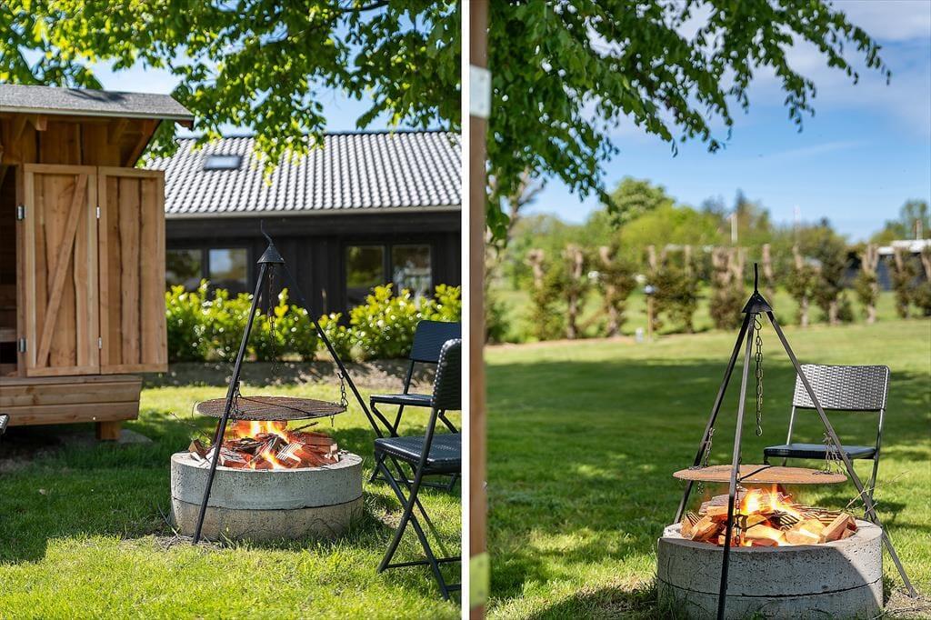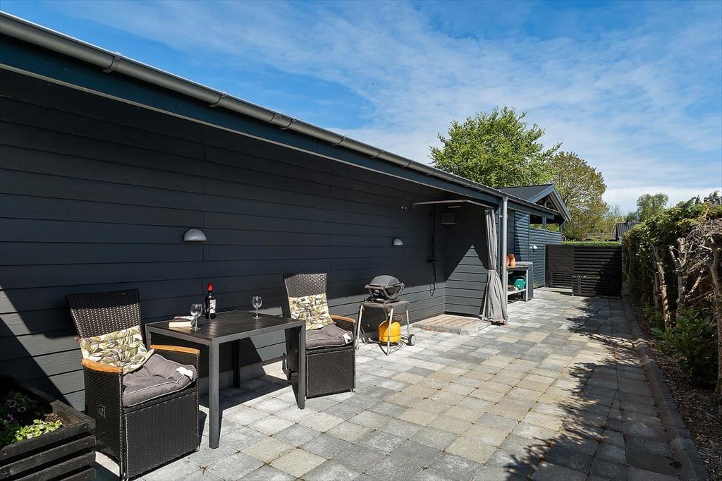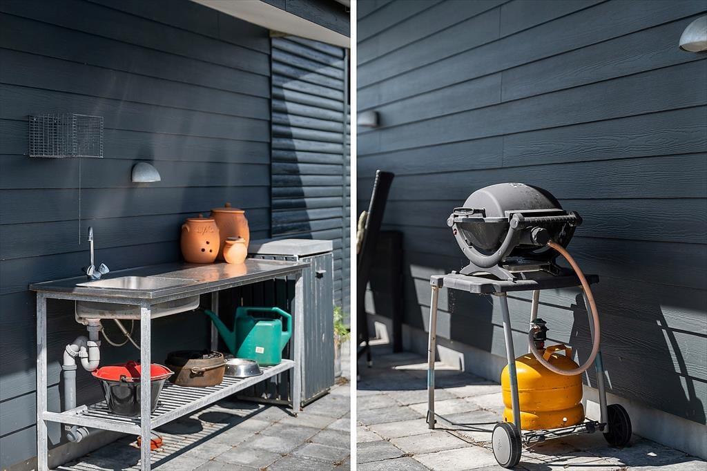 Det er ikke kun indenfor, at huset skaber rum for nærvær og gode stunder. Udenfor fortsætter de fine oplevelser på to skønne terrasser, hvor der både er sol og læ, alt efter tidspunkt og vejr. Det udendørs køkken sætter en ekstra prik over i’et – forestil dig at tilberede dagens frokost i det fri, mens børnene leger på græsset eller måske snupper en hurtig dukkert under den udendørs bruser. Nederst i haven venter en særlig overraskelse: Et shelter, som inviterer til ægte friluftsoplevelser under stjernerne. Det er det perfekte sted til at læse godnathistorier med pandelampe eller blot lytte til nattens lyde med en varm sovepose omkring sig. Hver kvadratmeter i haven er skabt til at blive brugt – hvad enten I vil spille bold, nyde eftermiddagskaffen i solen eller bare slappe af og kigge op i trætoppene.