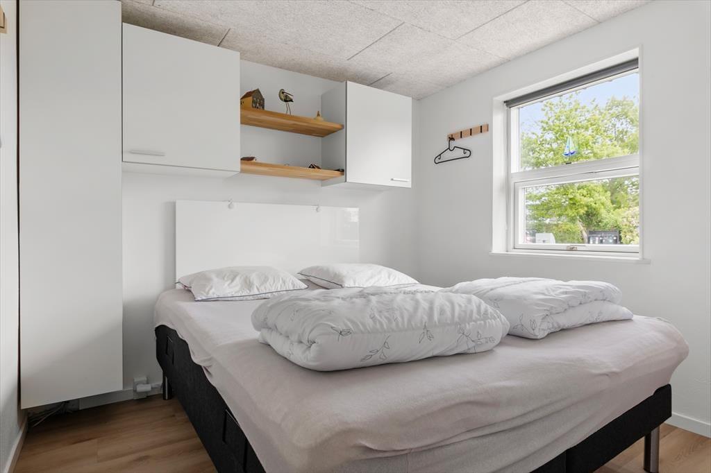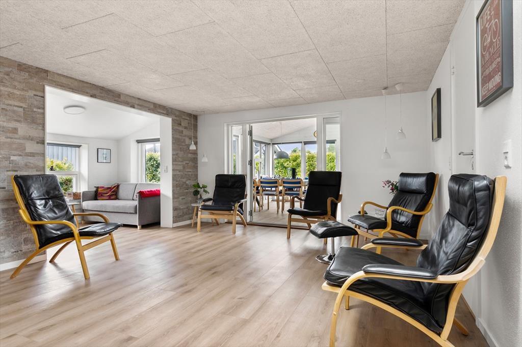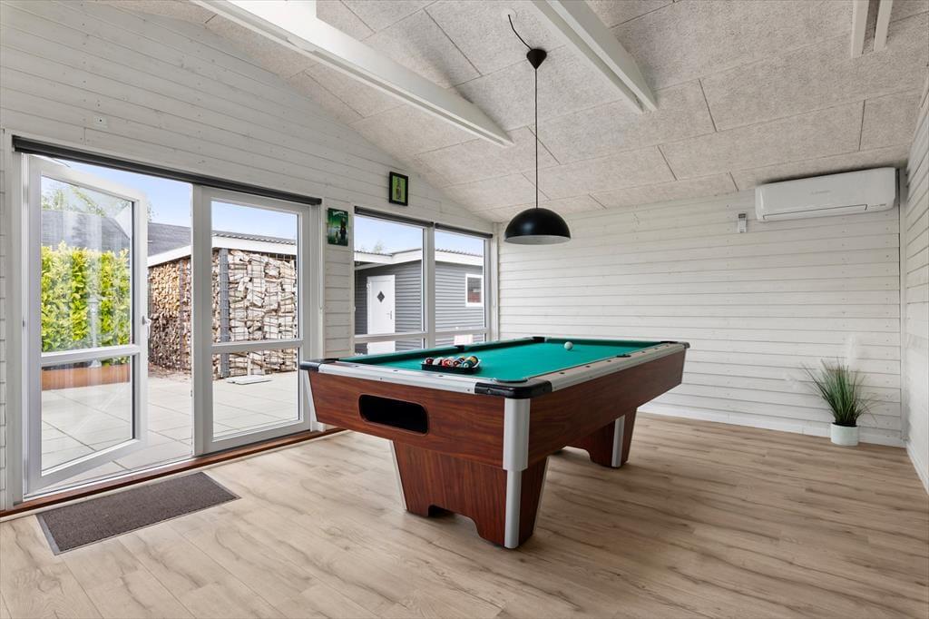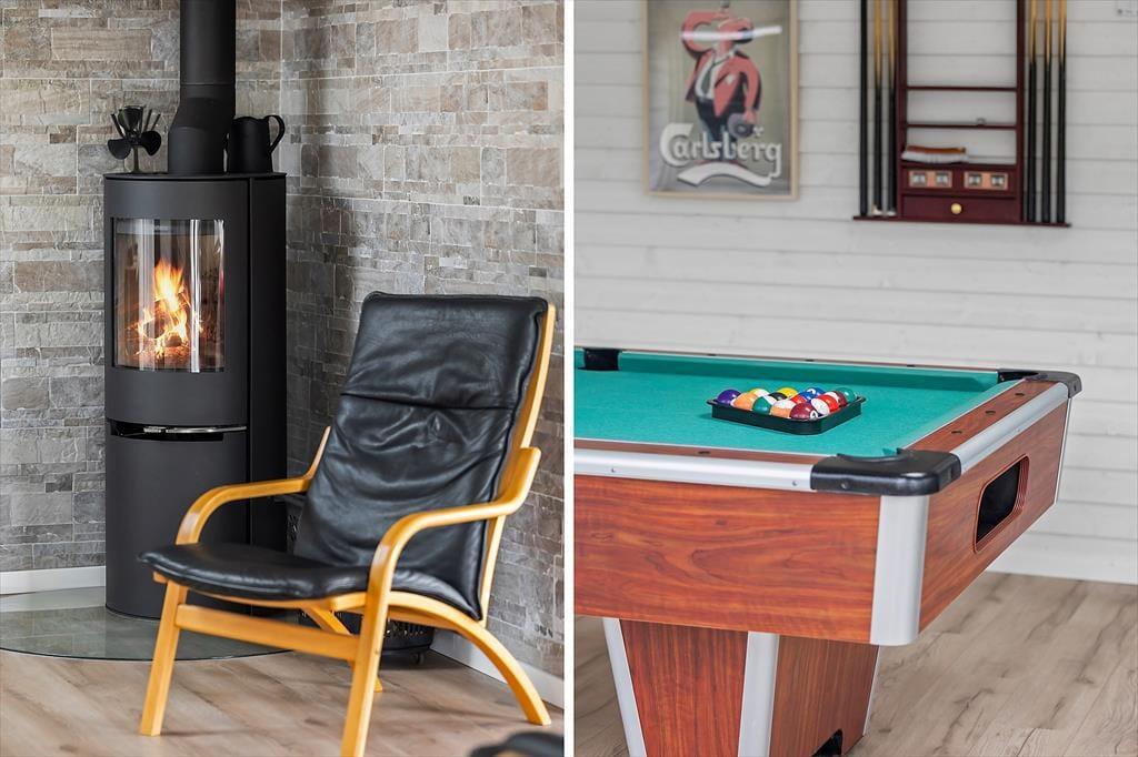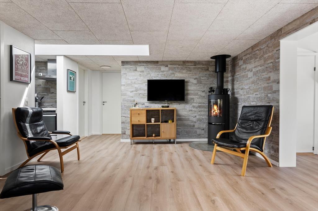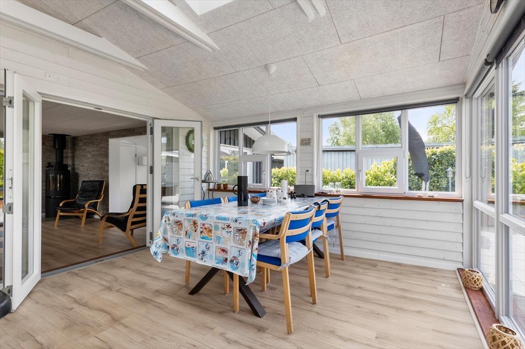 Når du træder ind i sommerhuset, bliver du mødt af en lys og venlig atmosfære, hvor moderne stil går hånd i hånd med hjemlig hygge. De lyse farver, de store vinduespartier og den åbne planløsning skaber en rar rummelighed, og uanset om solen skinner udenfor, eller regnen trommer let på ruderne, er det let at finde sig til rette her. I opholdsrummet kan du nyde samværet med familie eller venner omkring spisebordet, mens duften af aftensmad breder sig fra det velindrettede køkken. Den komfortable sofakrog indbyder til filmaftener eller gode snakke foran brændeovnen, og når dagen går på hæld, venter der hyggelige soveværelser, hvor du kan falde til ro efter en lang dag ved stranden. En særlig luksus er det skønne aktivitetsrum, som hurtigt bliver familiens samlingspunkt til sjove stunder.