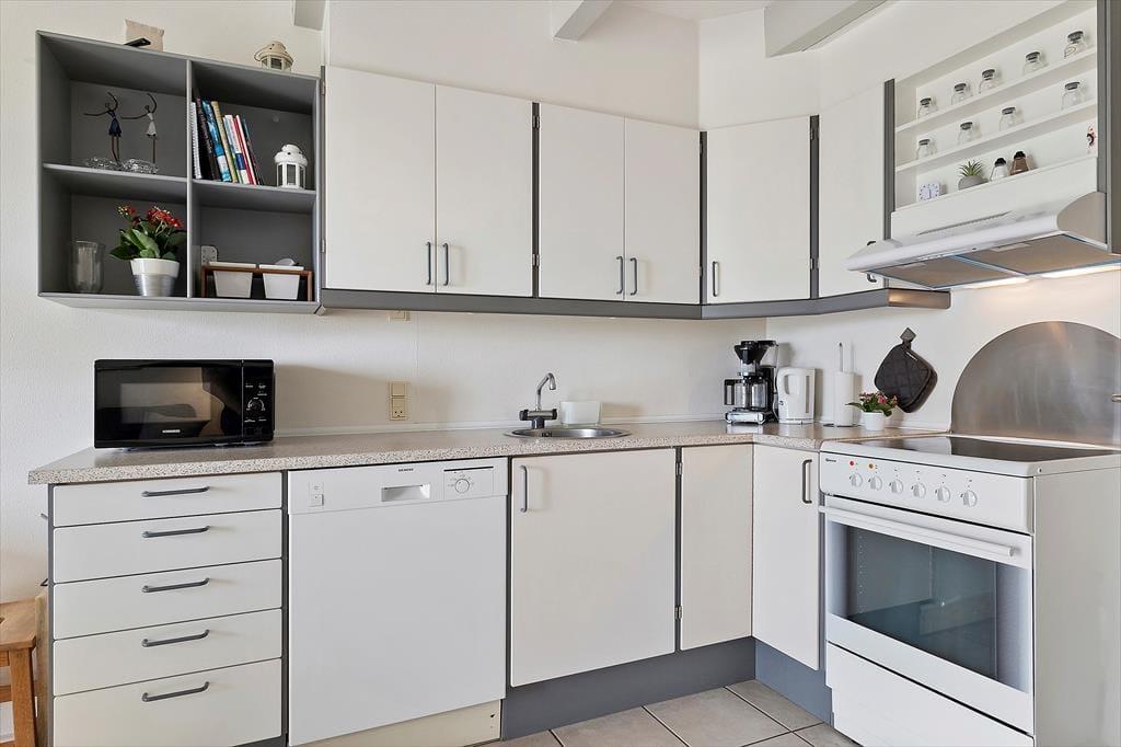 Indenfor i sommerhuset mødes du af en lys og indbydende atmosfære, hvor de hyggelige detaljer skaber en varm og rar stemning. Rummene er indrettet med fokus på komfort og afslapning, og opholdsstuen indbyder til rolige stunder med god læsning eller samtaler med familien. Fra stuen er der fri udsigt til havet, så selv når I opholder jer indendørs, kan I nyde bølgernes skvulp og den friske havluft. Ferielejlighedens indretning er ideel til både par og familier, og med mulighed for at børnene kan lege sikkert udenfor, kan de voksne nyde kaffepauser, madlavning og hyggelige aftener i fred og ro. Det er nemt at føle sig hjemme her, og husets lyse farvetoner og hyggelige detaljer gør det til et sted, man har lyst til at blive i – også selvom dagene byder på sol og strand.