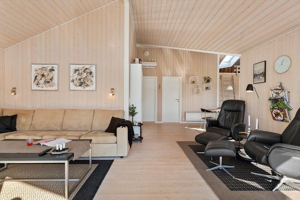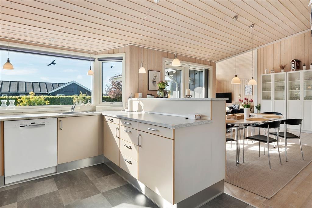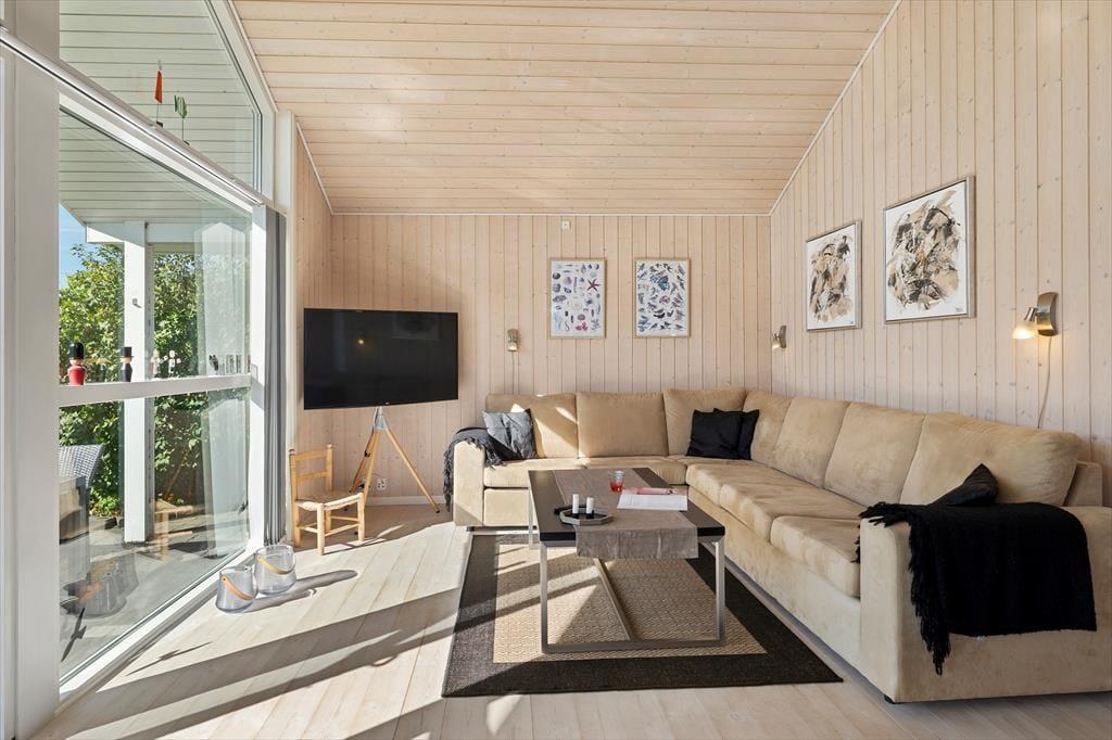 Indenfor mødes du af en lys og venlig atmosfære, hvor store vinduespartier trækker masser af dagslys ind og skaber en naturlig forbindelse til haven udenfor. Den åbne planløsning gør det nemt for hele familien at være sammen om måltider, kortspil eller en god film i sofaen. Indretningen er enkel og funktionel – og samtidig hyggelig og hjemlig, så du straks føler dig godt tilpas. For børnefamilier er hemsen et ekstra plus. Heroppe kan de små (eller lidt større) børn indrette deres helt eget frirum med leg, legetøj eller en hyggelig læsekrog. Og mens børnene boltrer sig på hemsen, kan de voksne nyde roen og fællesskabet i opholdsrummet. Huset er ideelt til både én stor familie eller til to mindre familier, der rejser sammen og ønsker at tilbringe ferien i gode og uformelle rammer.