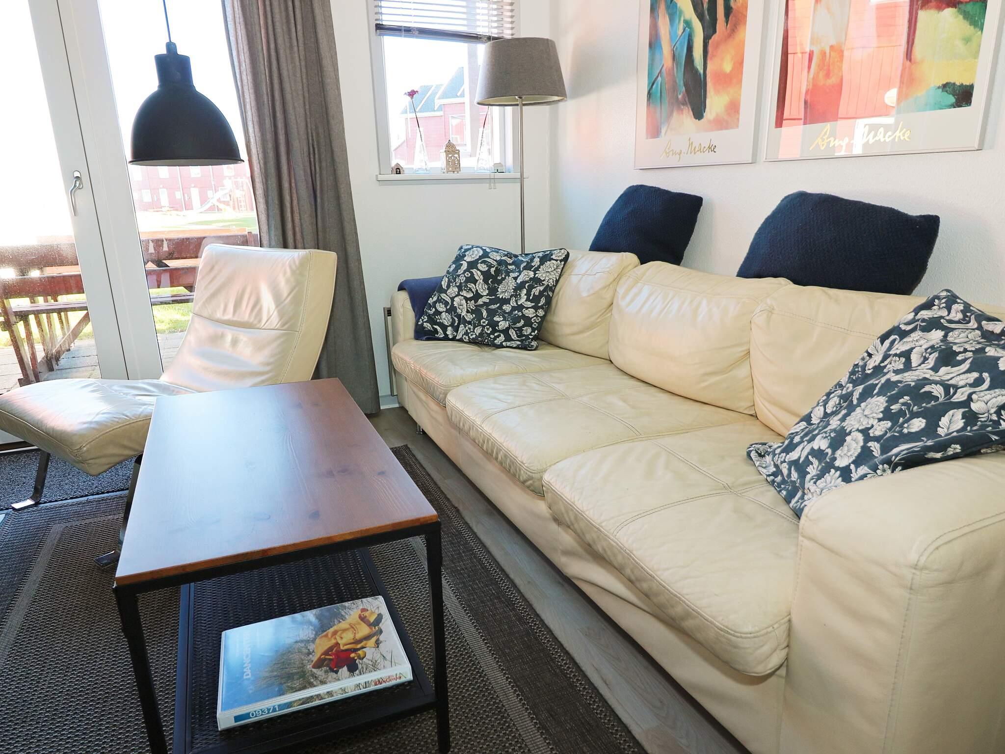 Lejligheden er indrettet med køkken, spisestue med udgang til en terrasse med havudsigt, samt stue i stueetagen. På 1. sal er der soveværelse med dobbeltseng samt soveværelse med 4 køjesengspladser.