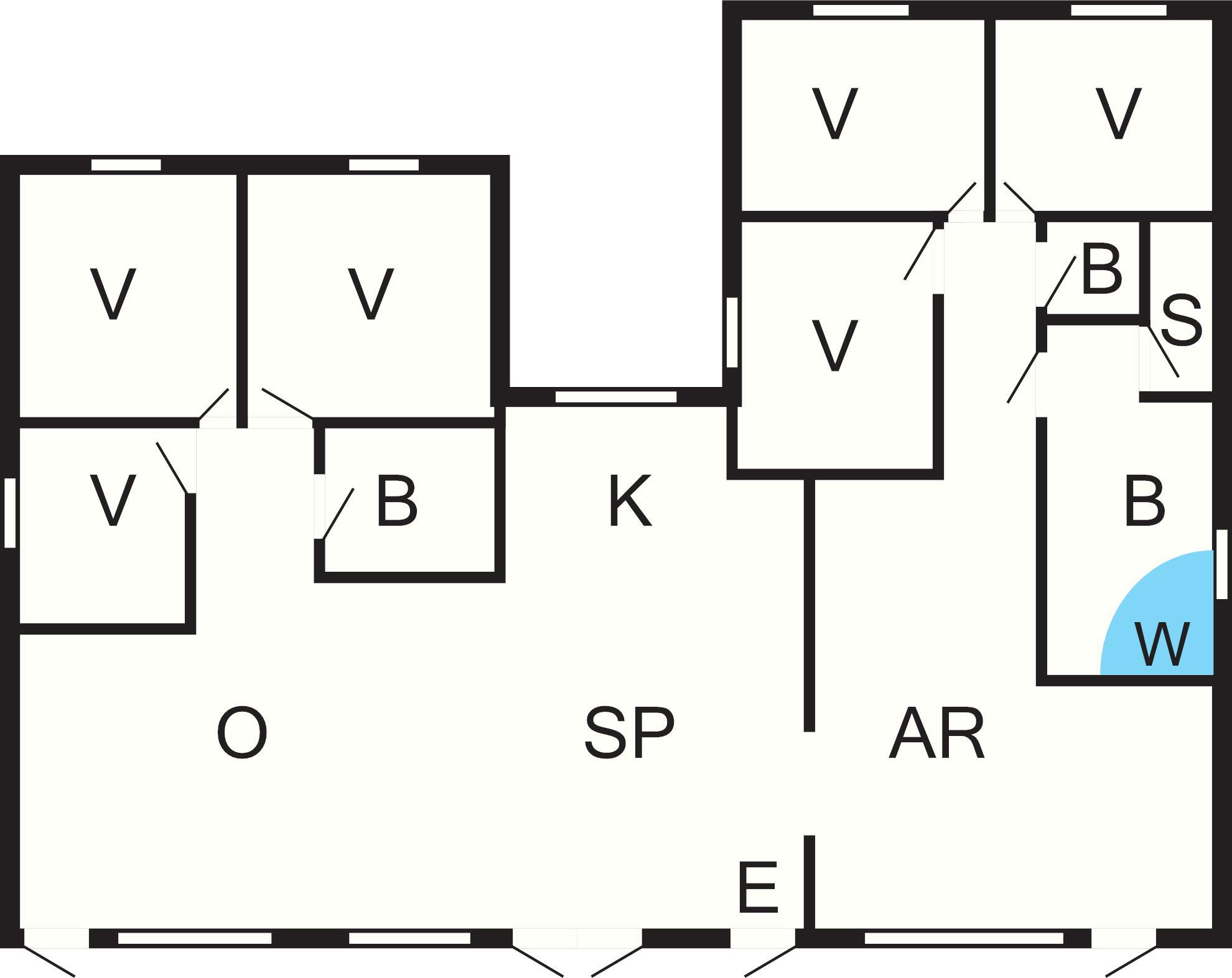 6 Soveværelser: (1DS)+(2S)+(2S)+(2S)+(2S)+(4K), barneseng