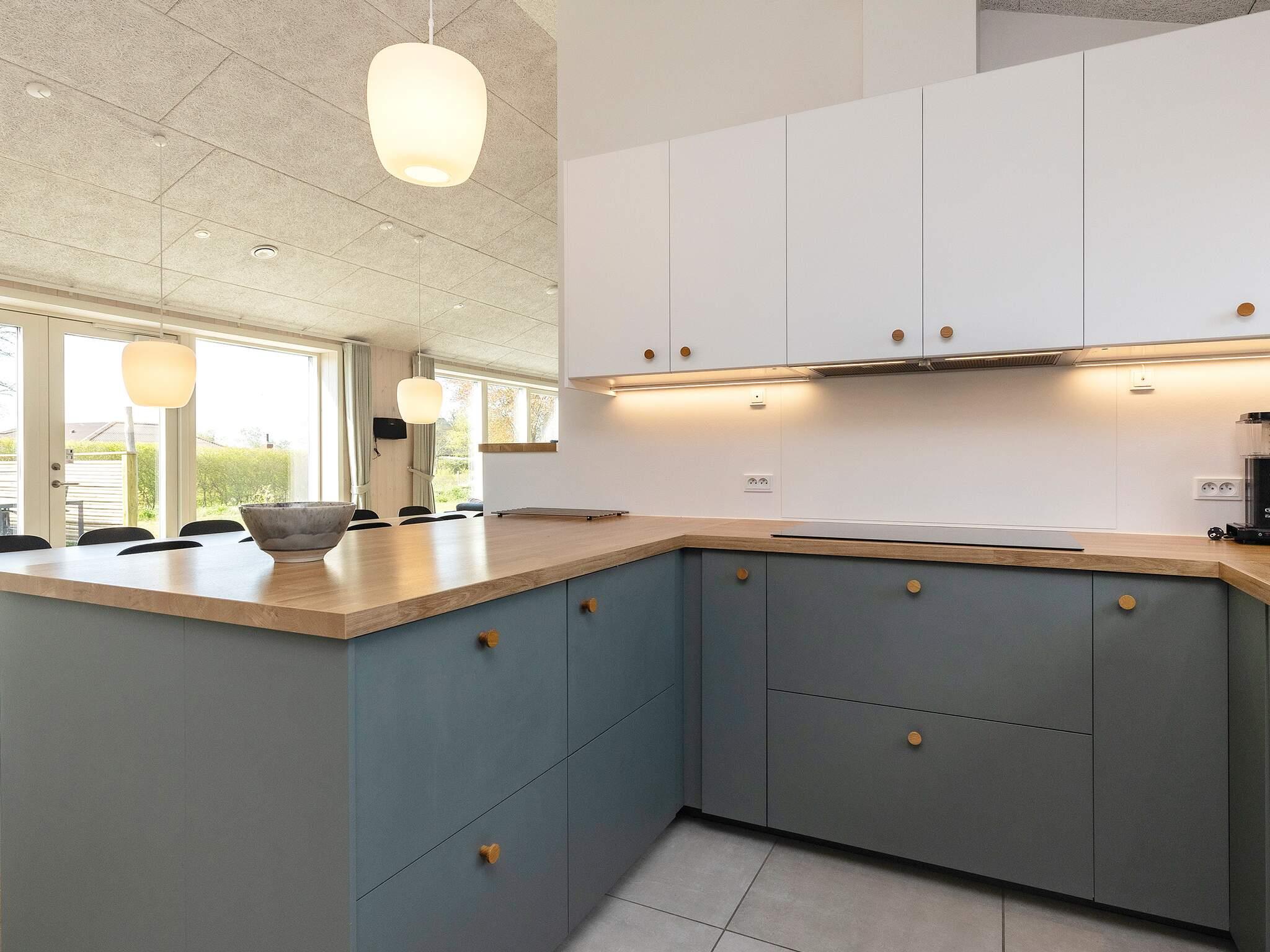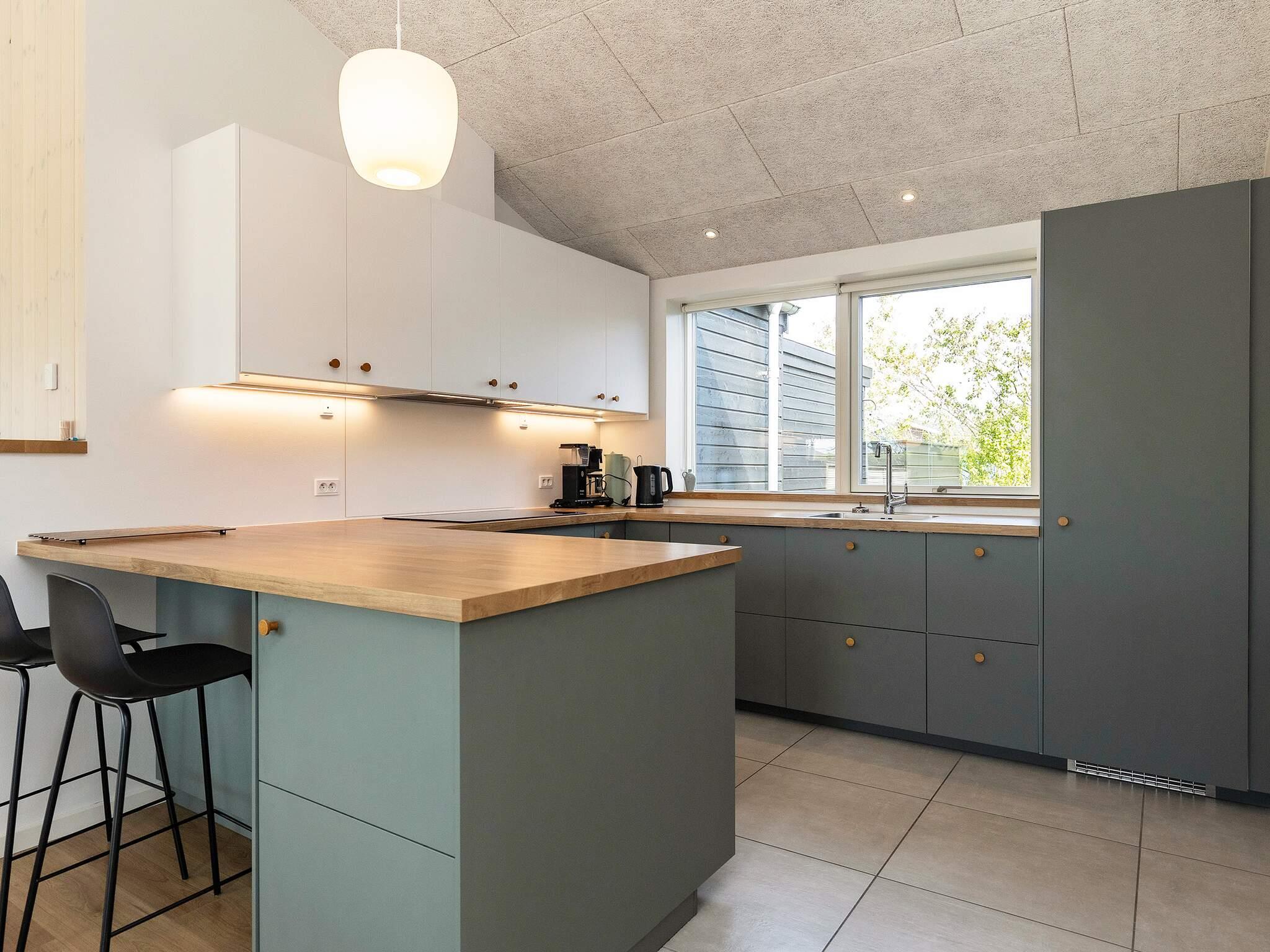 Det åbne køkken og spiseplads går direkte over i stuen og skaber et indbydende rum til måltider, latter og hyggelige aftener. Træd ud på den store terrasse, der er møbleret til udendørs spisning eller blot til at nyde den friske havbrise.