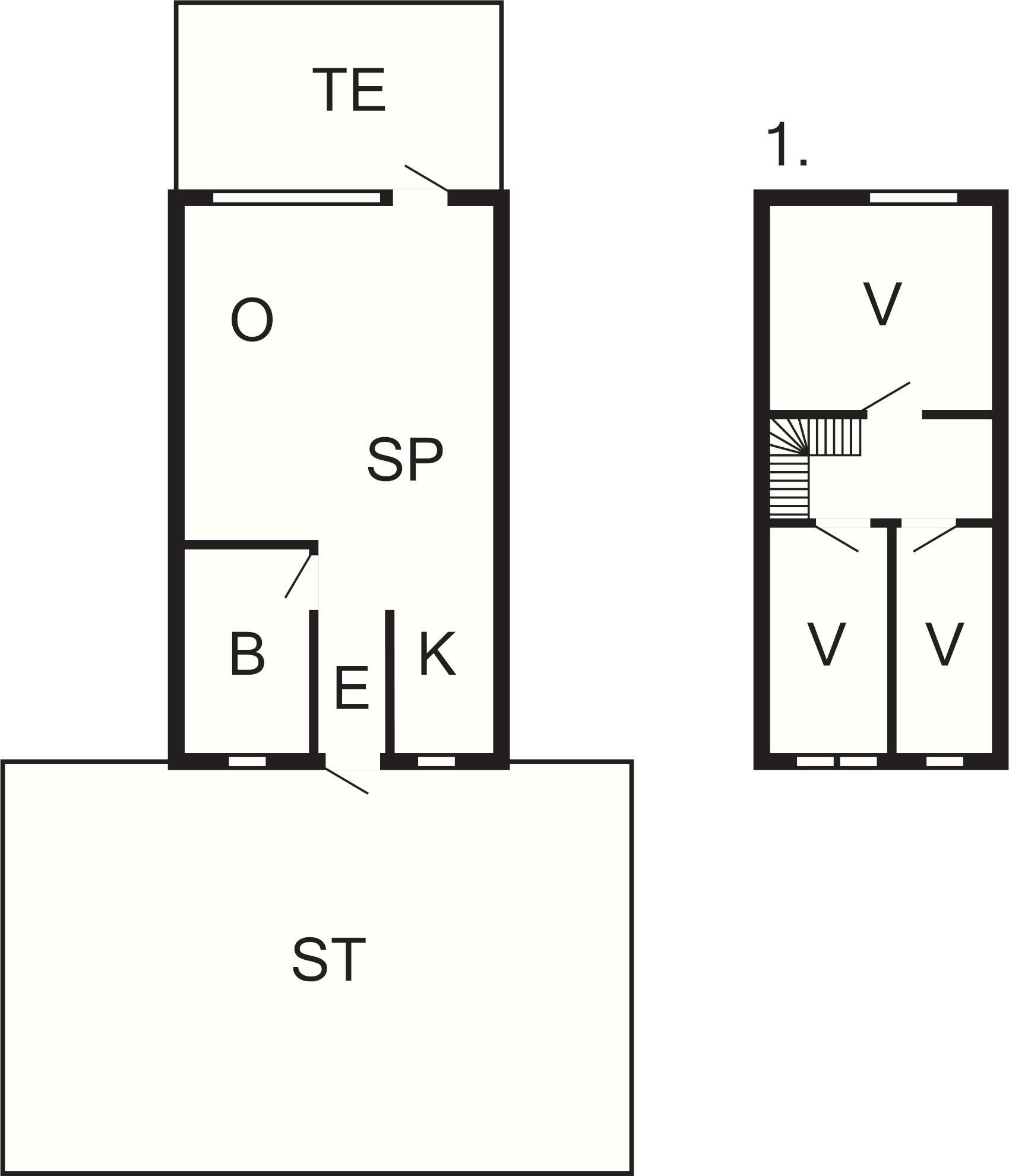 Stuen ligger i åben forbindelse med køkkenet, hvorfra der er udgang til en stor terrasse ud mod vandet og en hyggelig gårdhave. Badeværelse med bruser og toilet.