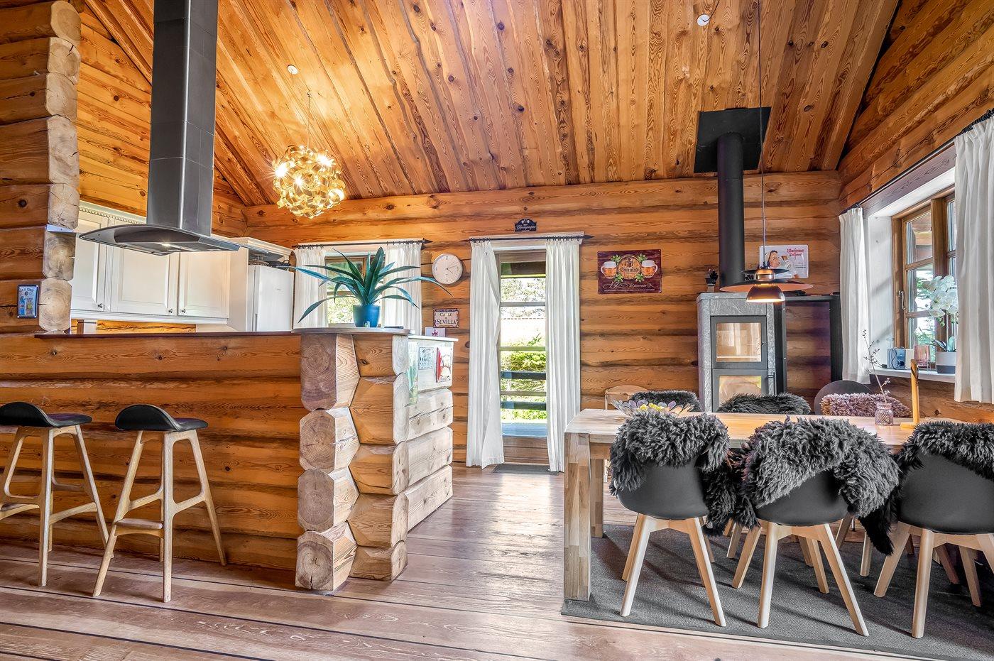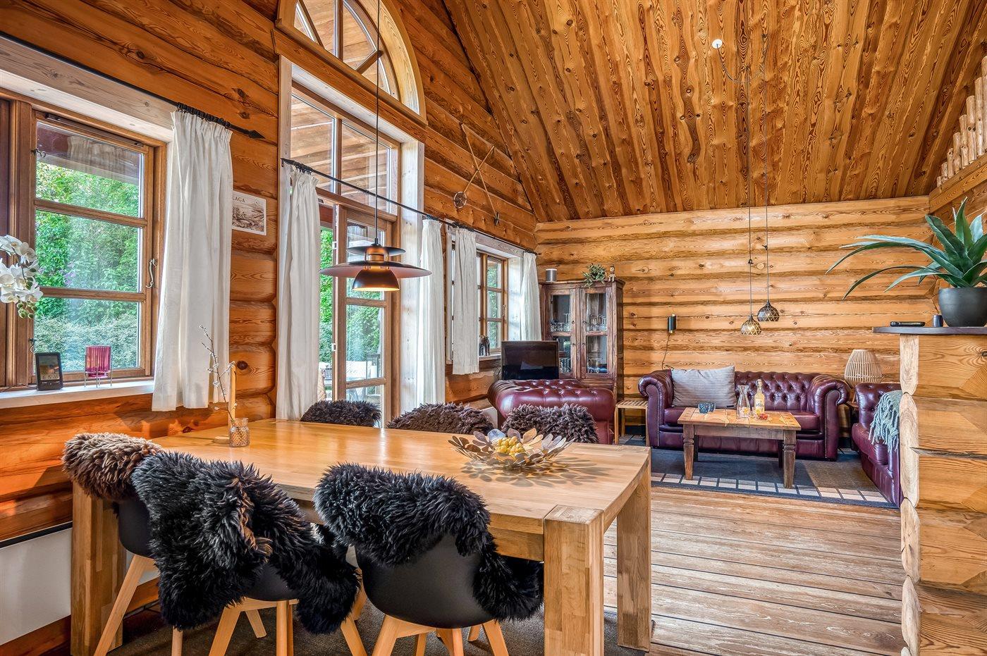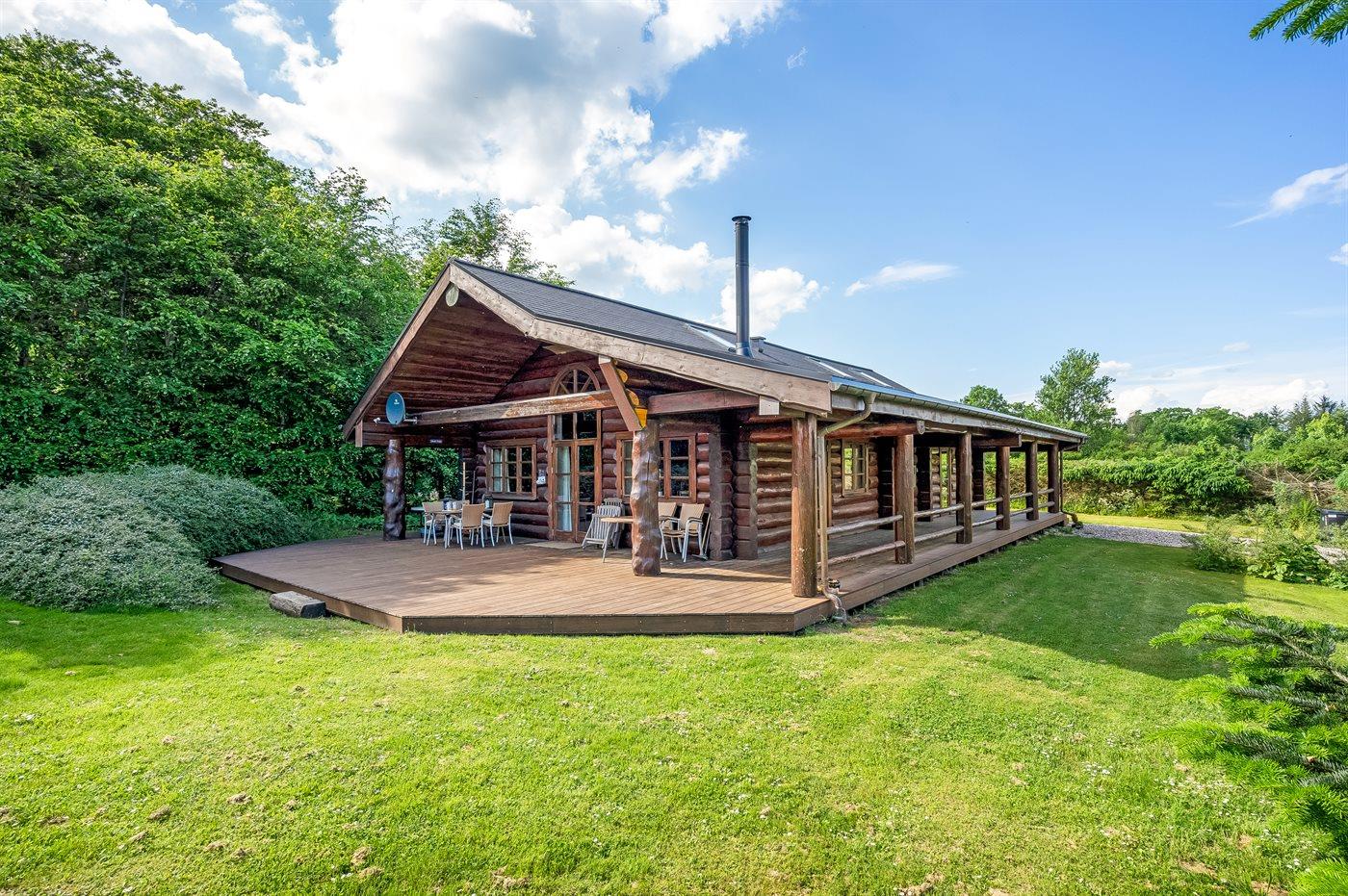 Lækkert bjælkehus med en flot og rusik indretning og hvor der fra såvel hus som grund er udsigt til vandet.