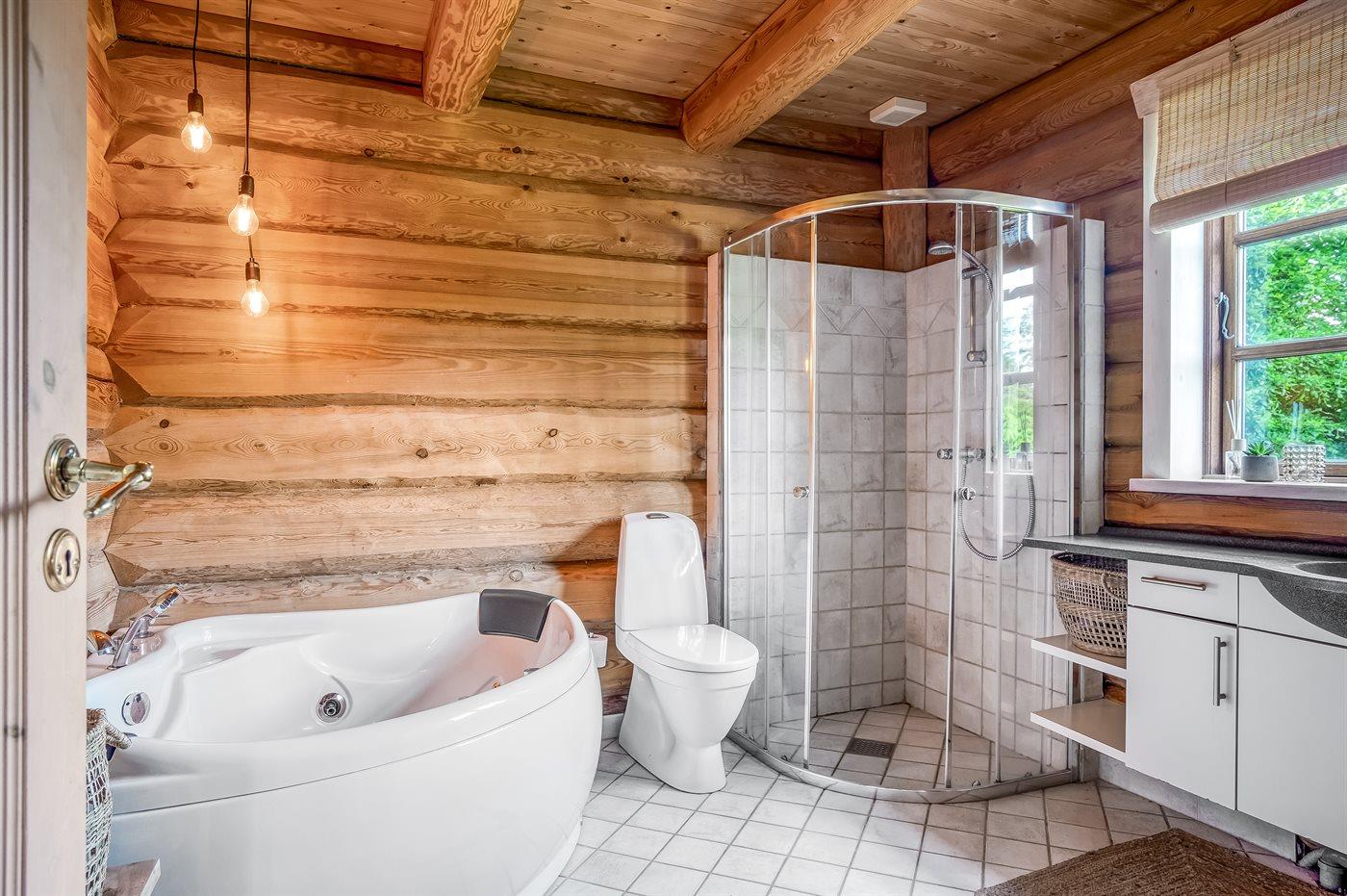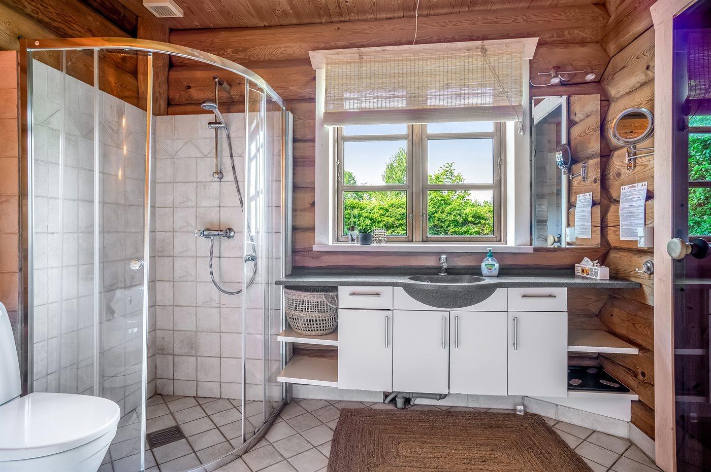 Der er 1 badeværelse med bruseniche og 2 toiletter, heraf 1 gæstetoilet. Der er gulvvarme på 1 badeværelse. I saunaen er der mulighed for afslapning.