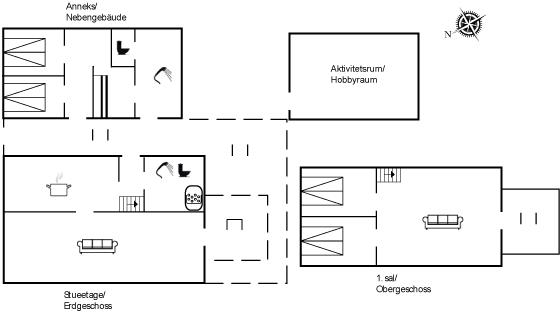 Der er i alt 5 soveværelser. Sovepladserne fordeler sig på: 8 sovepladser i dobbeltsenge. 2 sovepladser i køjeseng. 4 af disse sovepladser fordeler sig på 2 annekser. Derudover er der 1 stk. barneseng.
