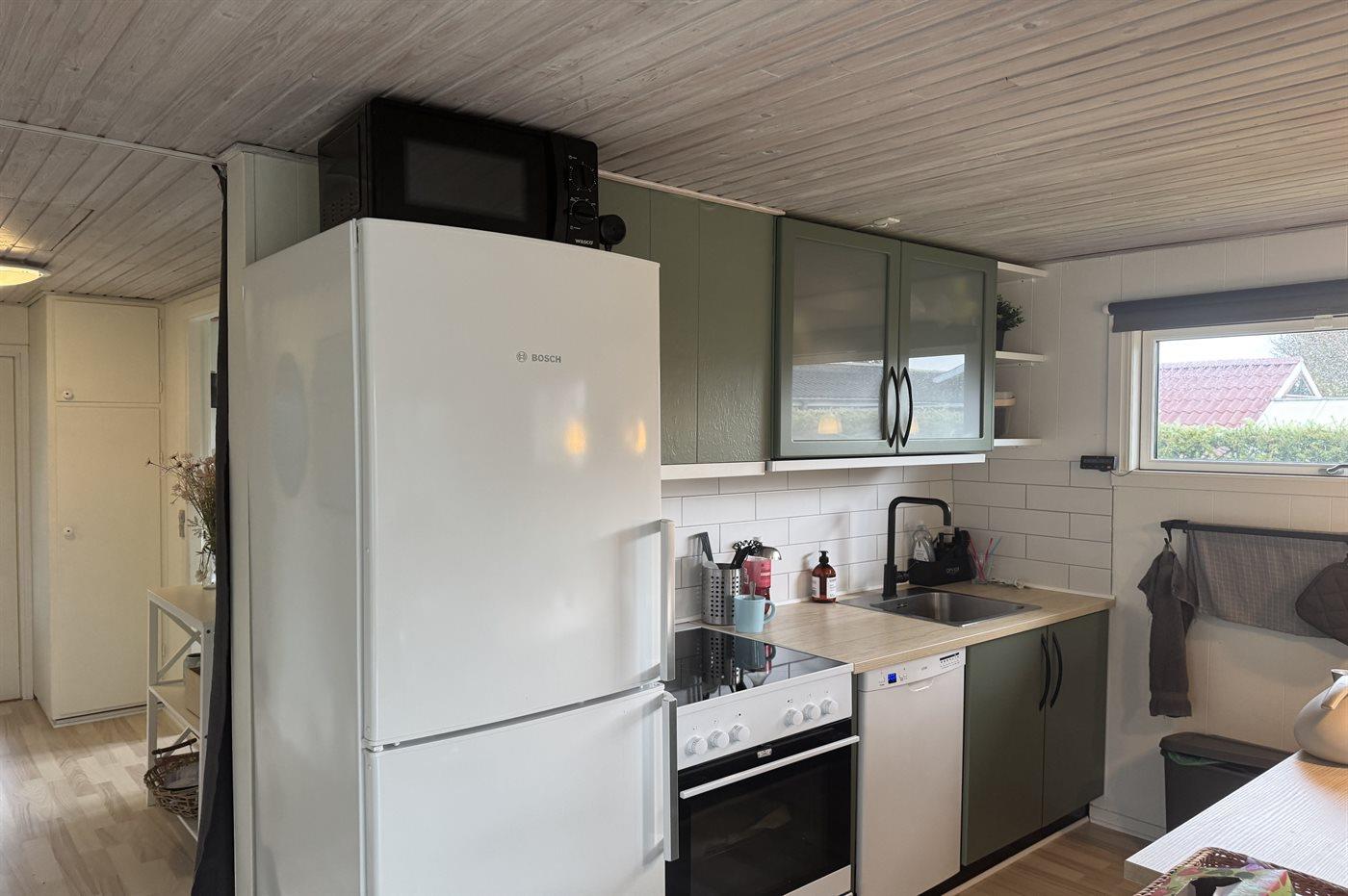 Køkkenet er udstyret med 1 køleskab. Der er 4 keramiske kogeplader, varmluftovn, mikrobølgeovn samt opvaskemaskine.
