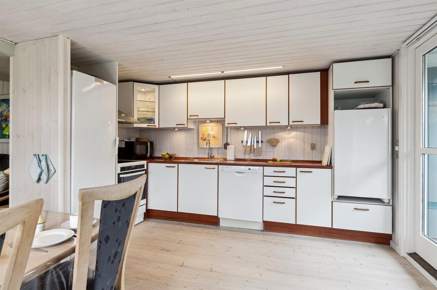 Køkkenet er udstyret med 1 køleskab. Der er 4 keramiske kogeplader, varmluftovn, mikrobølgeovn samt opvaskemaskine.