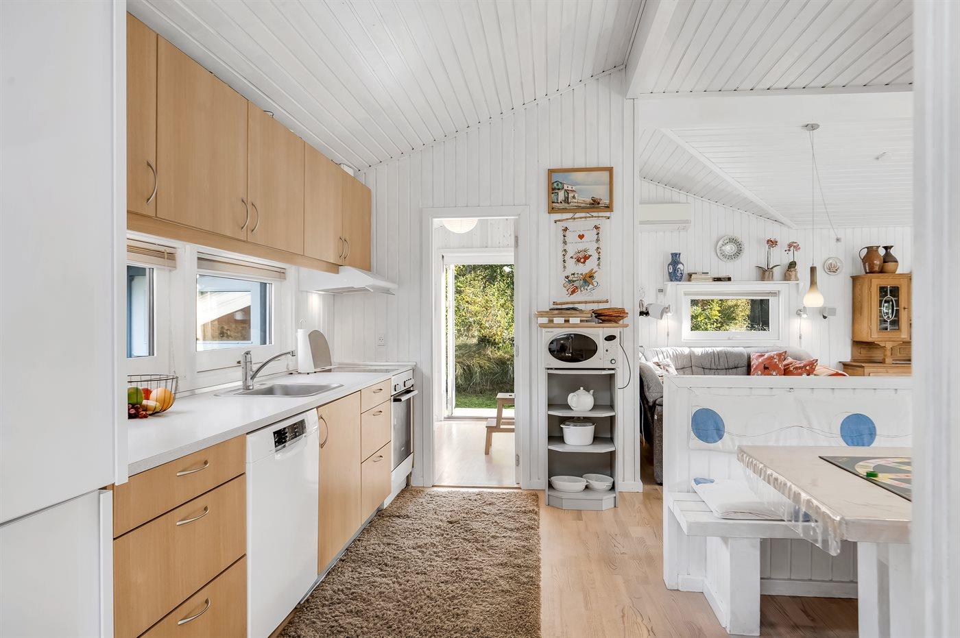 Køkkenet er udstyret med 1 køleskab. Der er 4 keramiske kogeplader, varmluftovn, mikrobølgeovn samt opvaskemaskine.