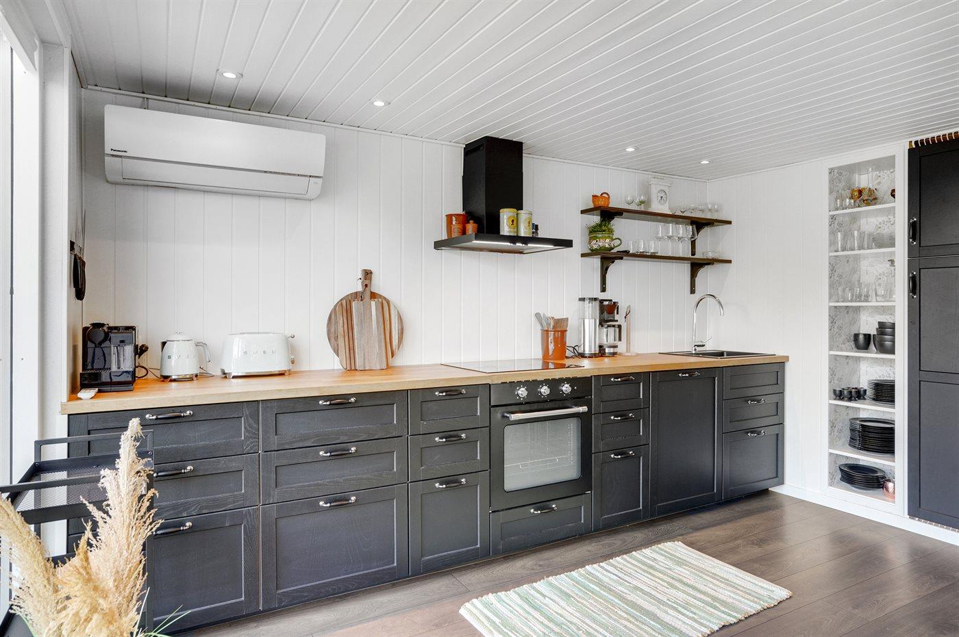 Køkkenet er udstyret med 1 køleskab. Der er 4 keramiske kogeplader, varmluftovn samt opvaskemaskine.