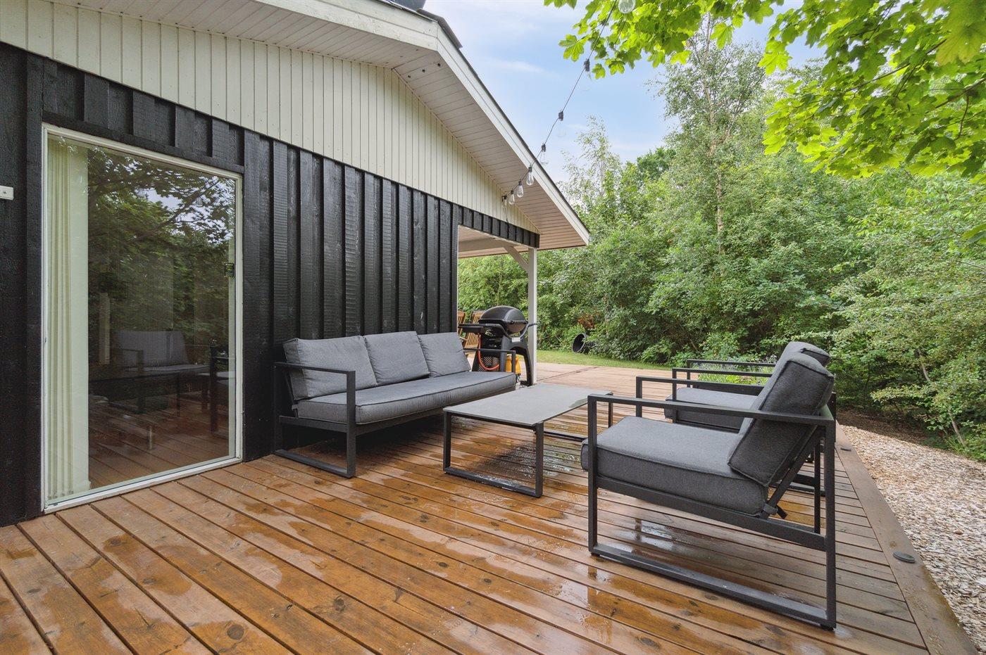 Ferieboligen er beliggende på en 826 m² stor naturgrund. Der er 250 m til havet. Der er 9900 m til fjorden. Nærmeste forretning er beliggende i en afstand af 1100 m. Der er en golfbane i en afstand af 14300 m. Til ferieboligen hører åbent terrasseareal. Desuden er der overdækket terrasse. Rutchebane. Der ligger en legeplads i en afstand af 820 m. Bålsted. Shelter. Grill til rådighed. Parkering ved ferieboligen.
