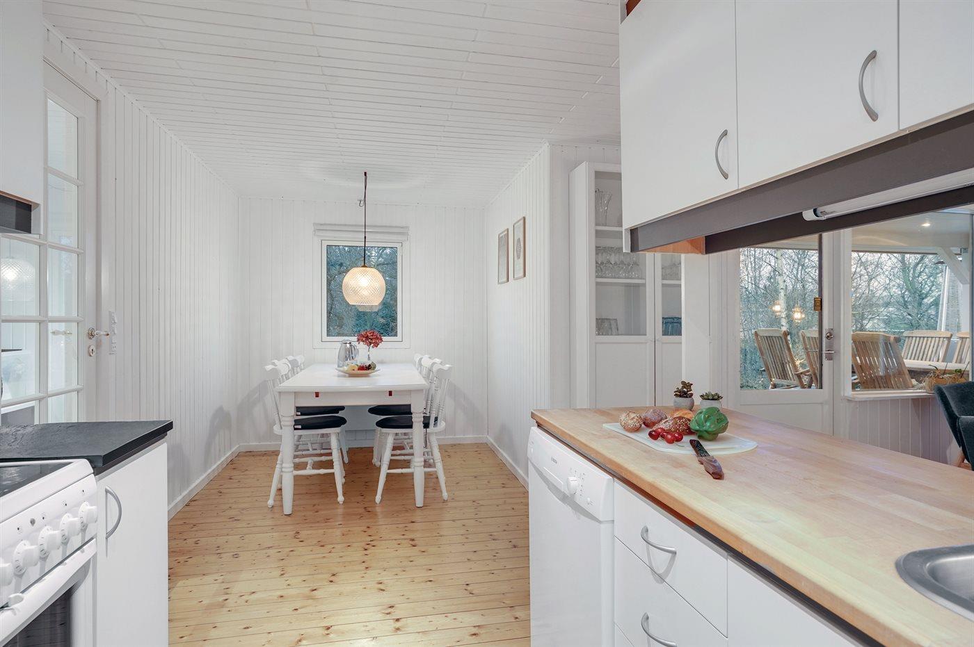 Køkkenet er udstyret med 1 køleskab. Der er 4 keramiske kogeplader, varmluftovn, mikrobølgeovn samt opvaskemaskine.
