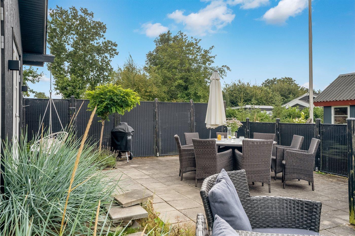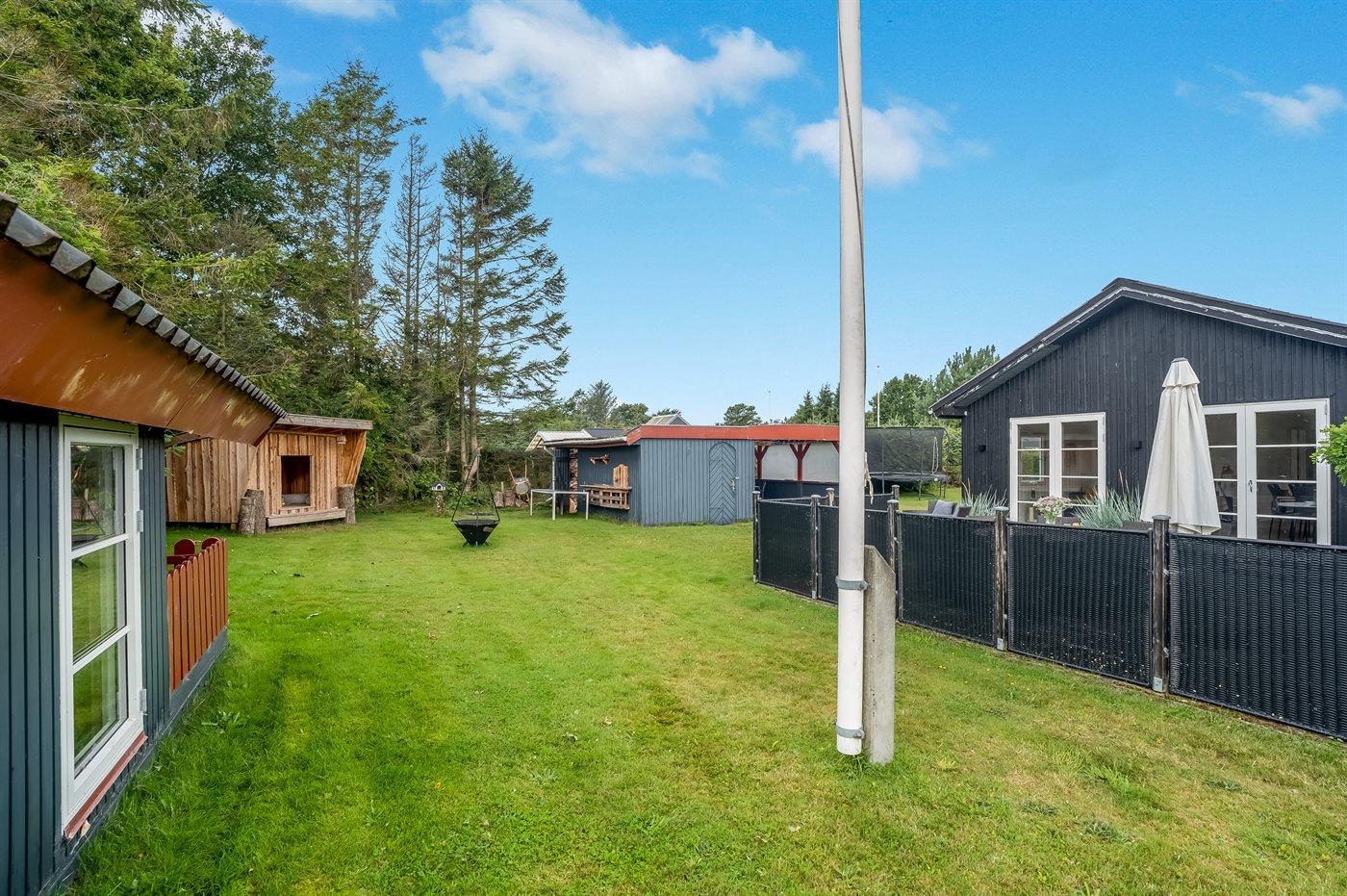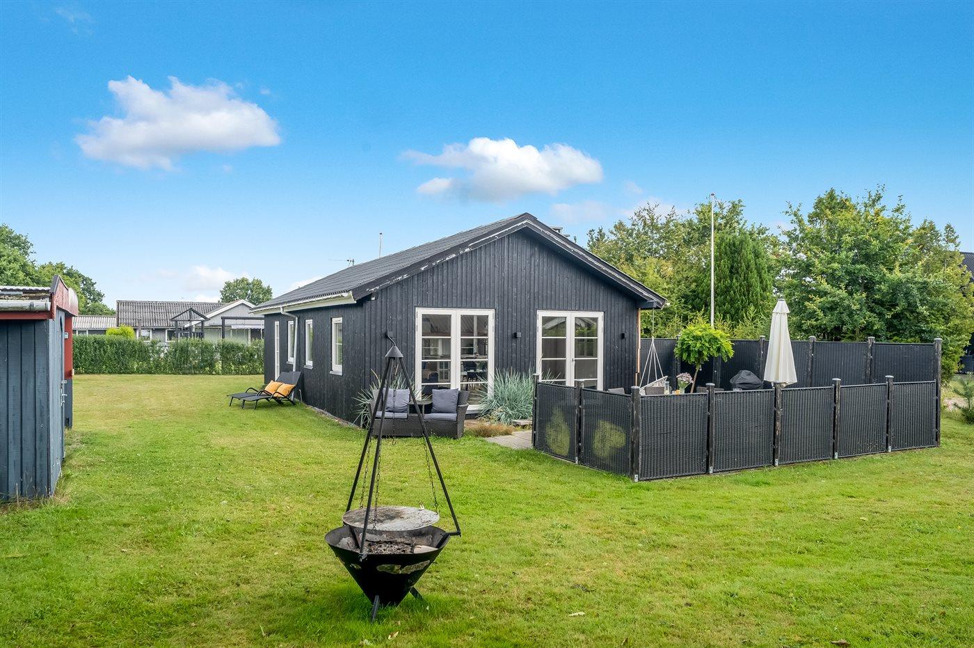 Ferieboligen er beliggende på en 829 m² stor havegrund. Der er 280 m til havet. Der er en badebro i nærheden. Nærmeste forretning er beliggende i en afstand af 2000 m. Til ferieboligen hører 86 m² terrasseareal. Sandkasse. Trampolin. Bålsted. Shelter. Grill til rådighed. Parkering ved ferieboligen.