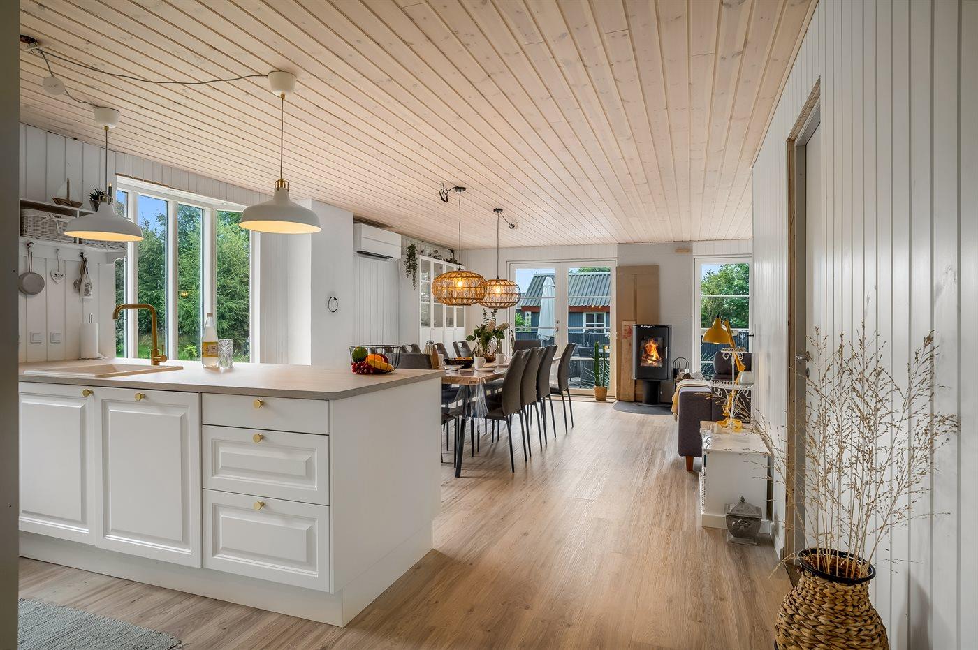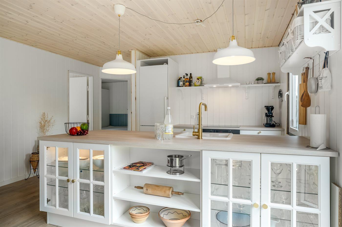 Køkkenet er udstyret med 1 køleskab. Der er 4 keramiske kogeplader, varmluftovn samt opvaskemaskine.