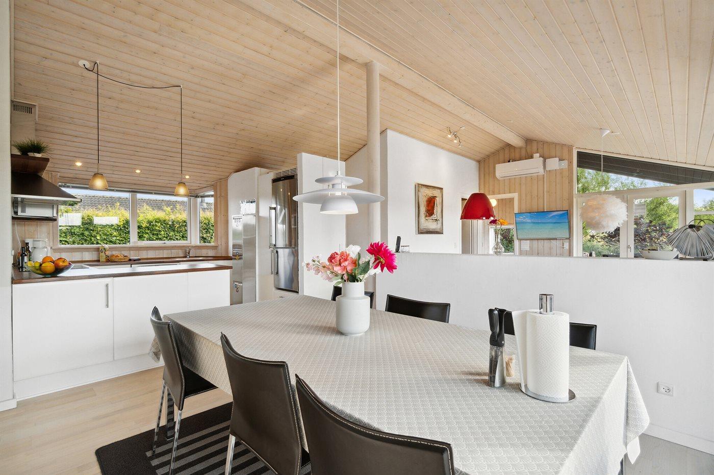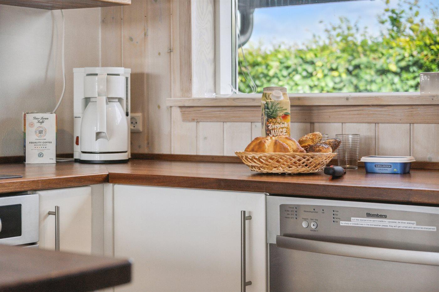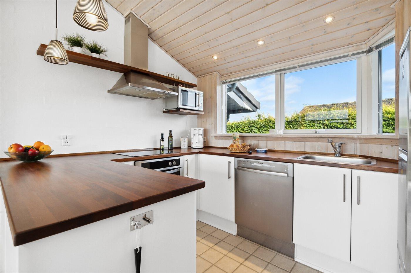 Køkkenet er udstyret med 1 køleskab. Der er 4 keramiske kogeplader, varmluftovn, mikrobølgeovn samt opvaskemaskine.