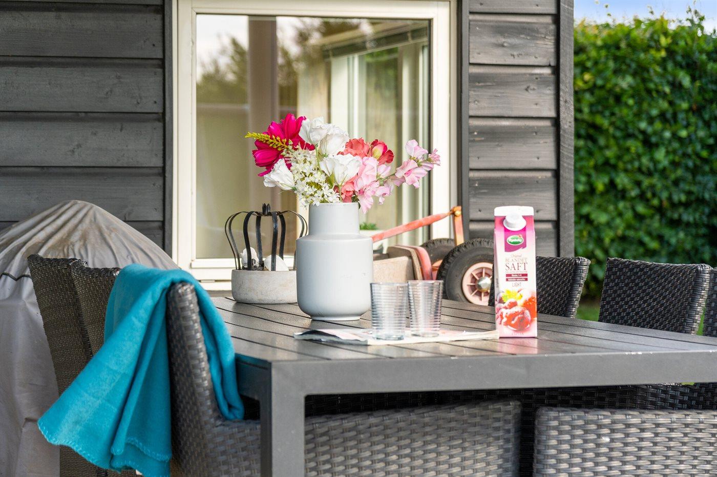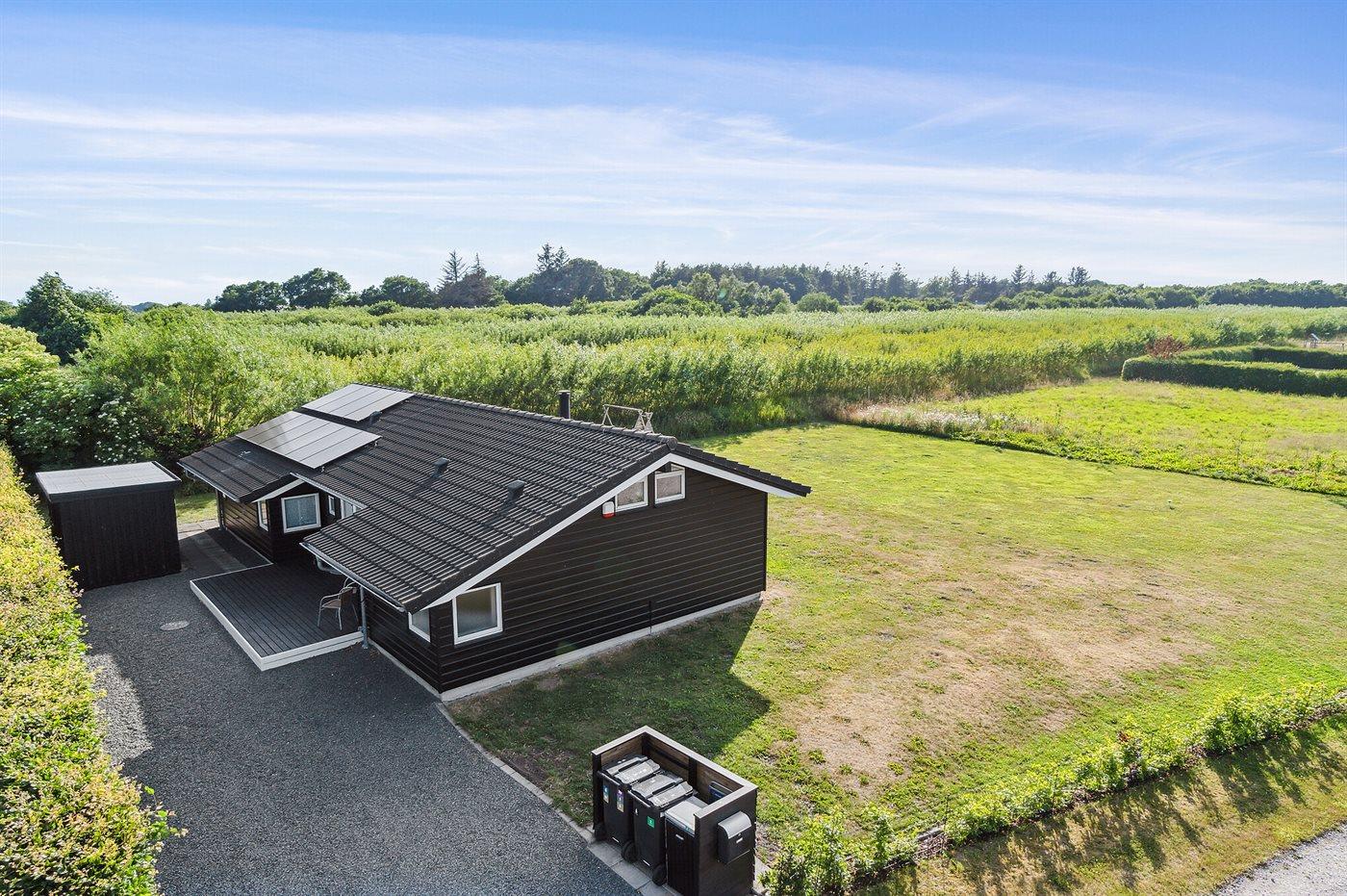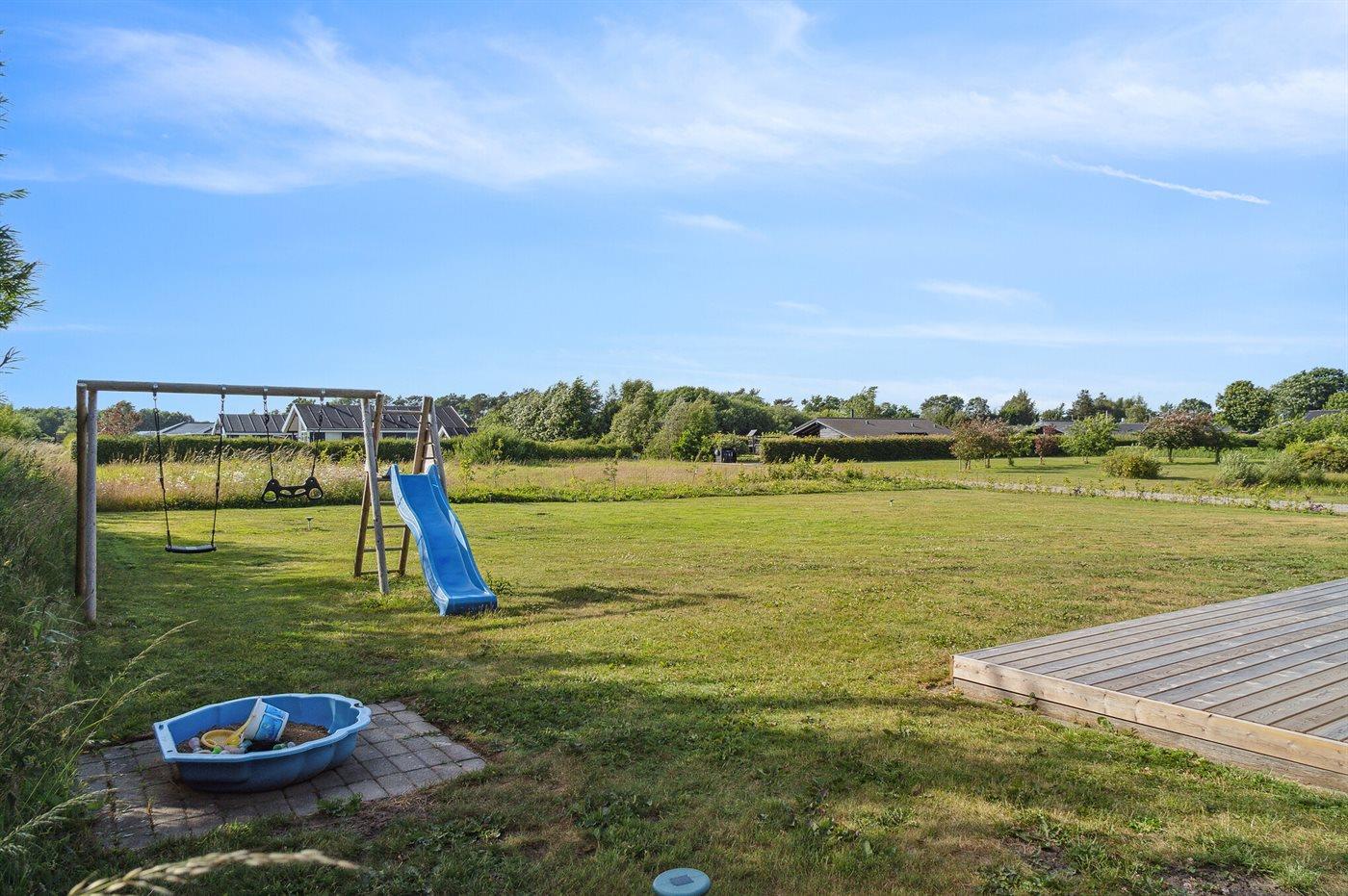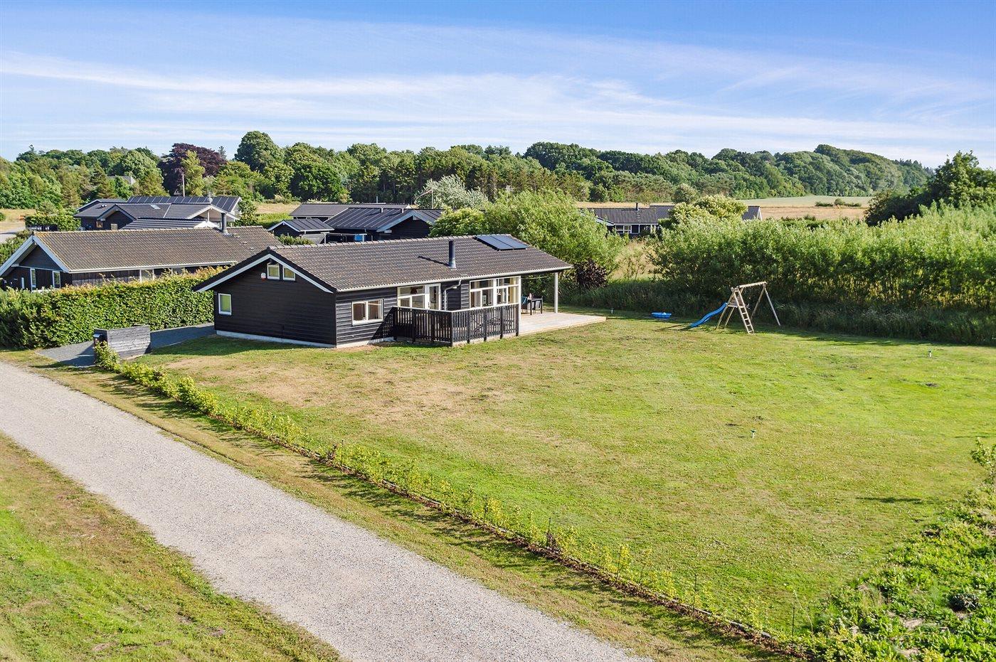 Ferieboligen er beliggende på en 1200 m² stor naturgrund. Der er 400 m til havet. Nærmeste forretning er beliggende i en afstand af 3000 m. Til ferieboligen hører åbent terrasseareal. Desuden er der overdækket terrasse. Gynge. Sandkasse. Rutchebane. Grill til rådighed. Der er installeret stik til opladning af elbil. Type 2 stik. Med 11 kW ladeeffekt. Parkering ved ferieboligen.
