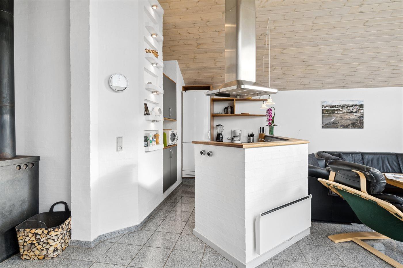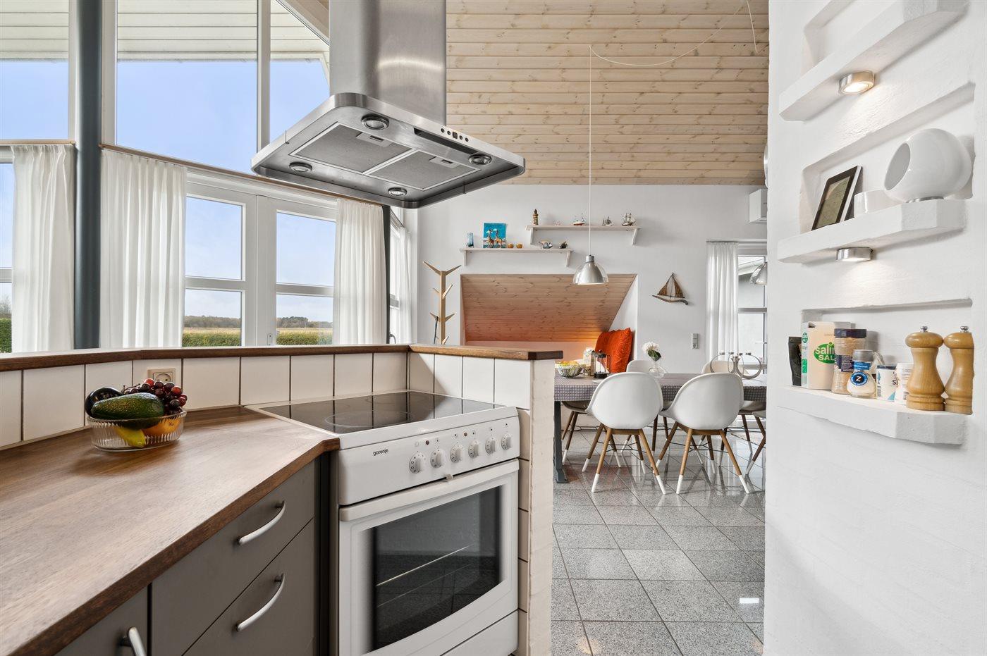 Køkkenet er udstyret med 1 køleskab. Der er 4 keramiske kogeplader, varmluftovn, mikrobølgeovn samt opvaskemaskine Der er gulvvarme i køkkenet.