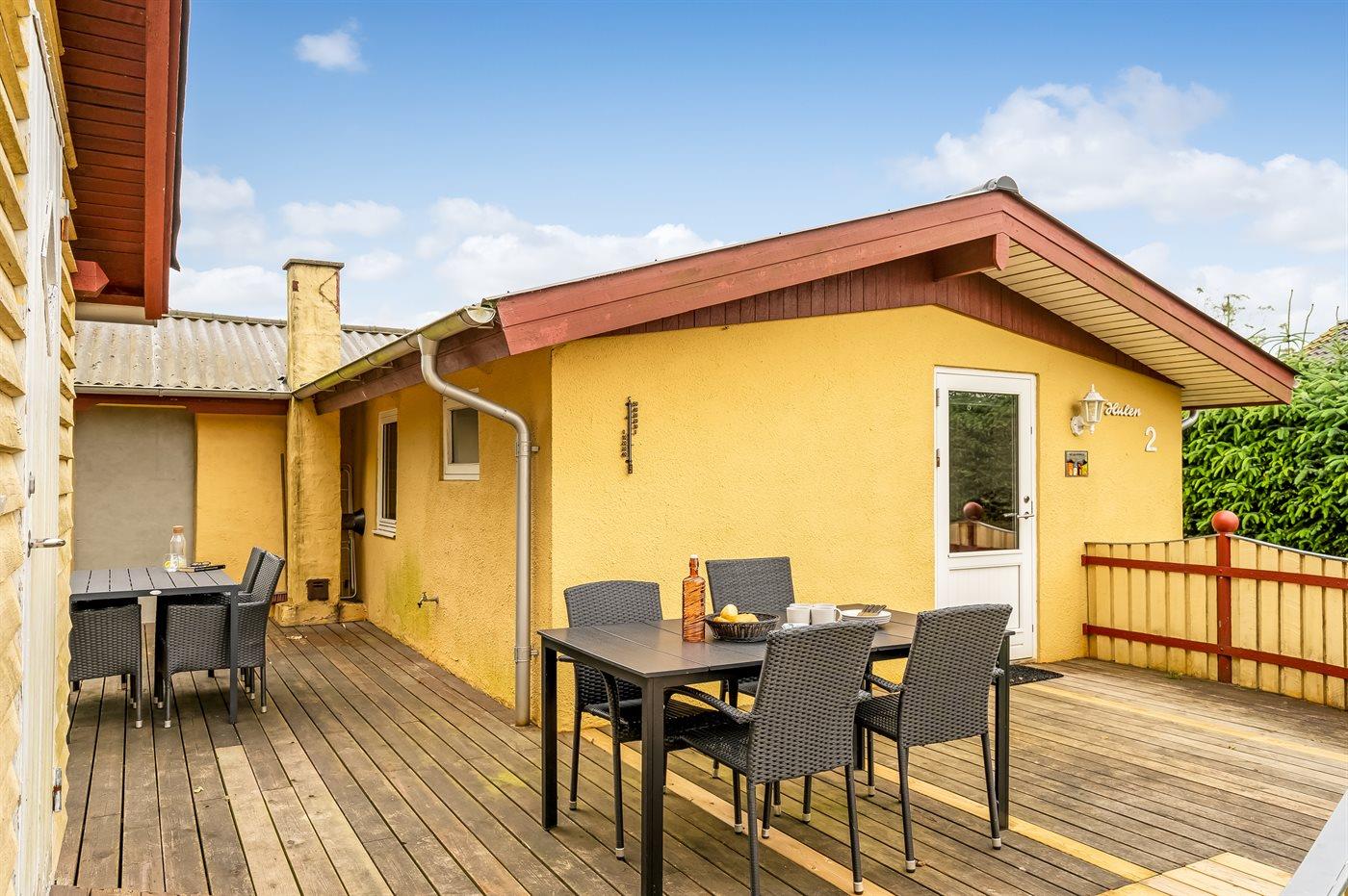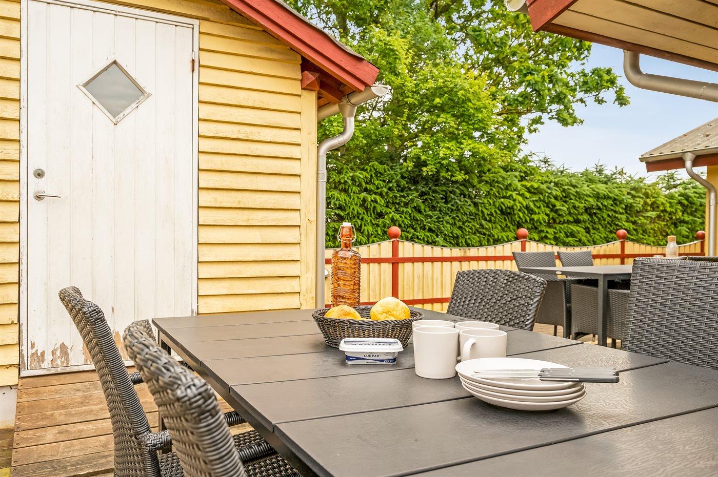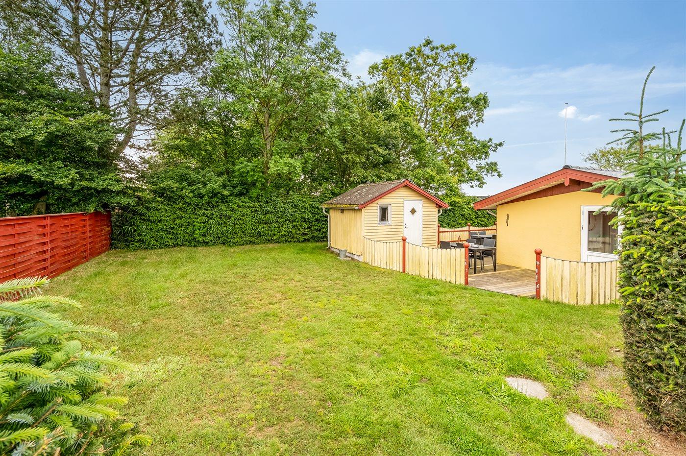 Ferieboligen er beliggende på en 500 m² stor havegrund. Der er 225 m til havet. Nærmeste forretning er beliggende i en afstand af 800 m. Til ferieboligen hører åbent terrasseareal. Desuden er der overdækket terrasse. Grill til rådighed. Parkering ved ferieboligen.