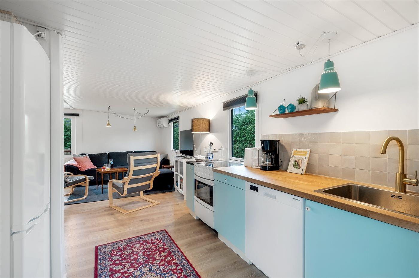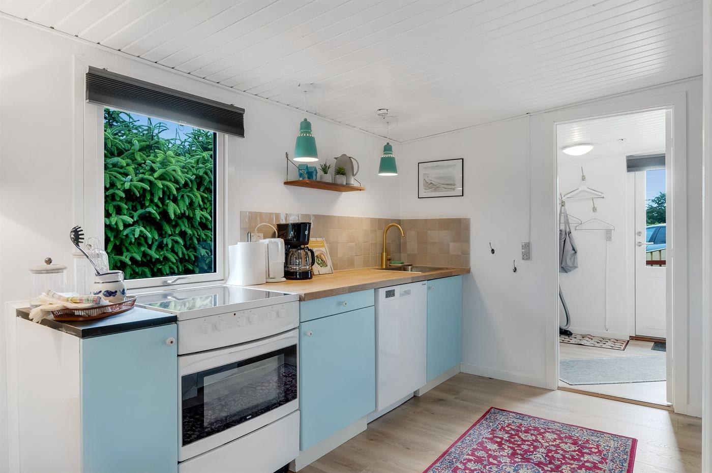 Køkkenet er udstyret med 1 køleskab. Der er 4 keramiske kogeplader, varmluftovn samt opvaskemaskine.