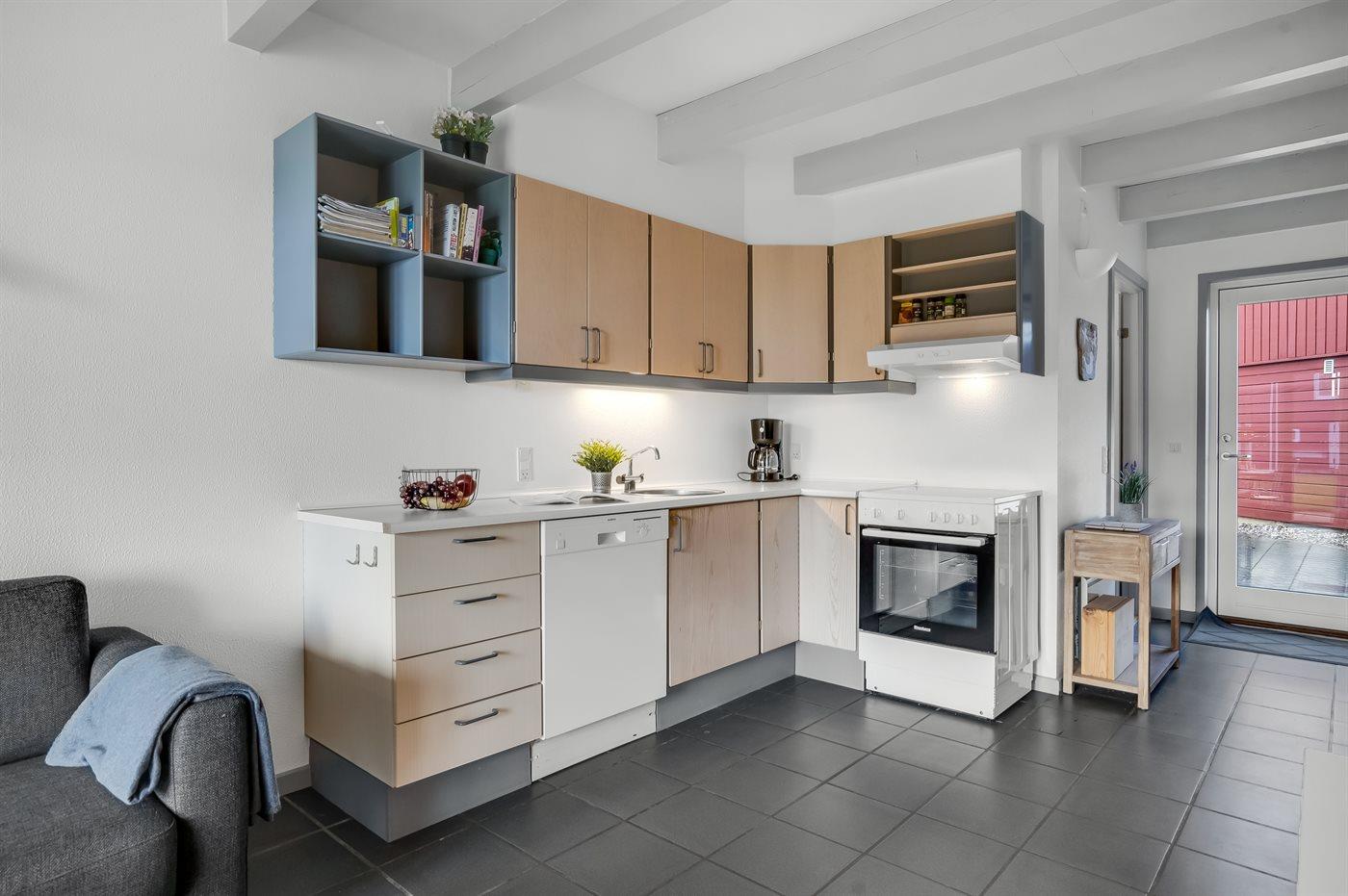 Køkkenet er udstyret med 1 køleskab. Der er 4 keramiske kogeplader, varmluftovn, mikrobølgeovn samt opvaskemaskine Der er gulvvarme i køkkenet.