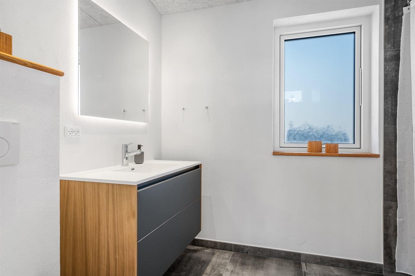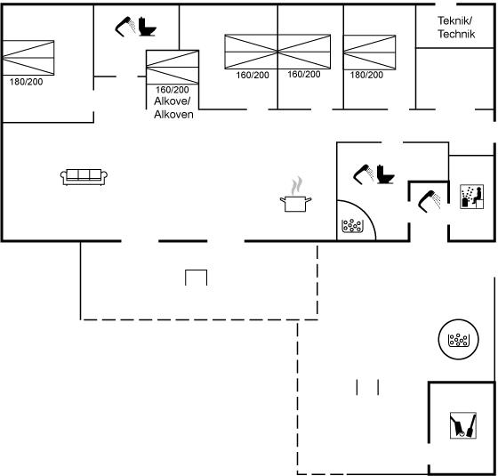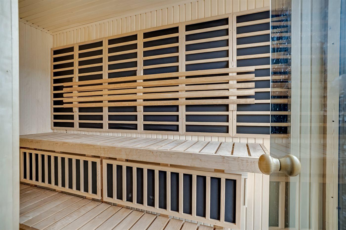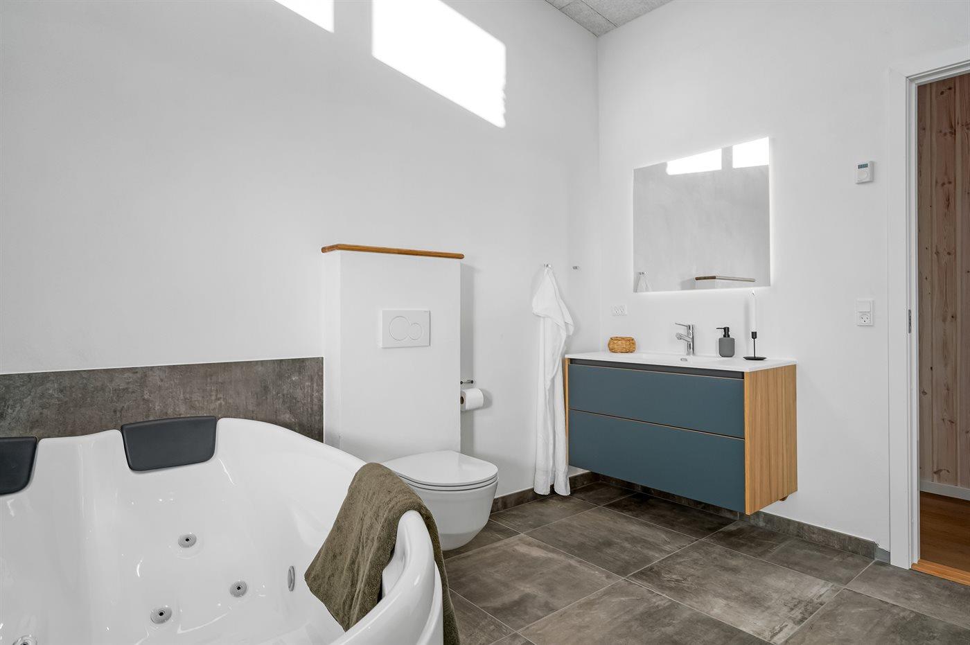 Huset har 2 badeværelser – det ene med bruseniche, og det andet som et luksusbadeværelse med spabad til 2 personer og med adgang til udesauna, udebruser samt til et udendørs standvandsspa til 6 personer. Perfekt til afslapning efter en dag ved stranden eller i naturen.