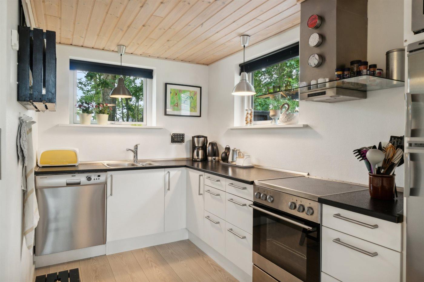 Køkkenet er udstyret med 1 køleskab. Der er 4 keramiske kogeplader, varmluftovn, mikrobølgeovn samt opvaskemaskine.