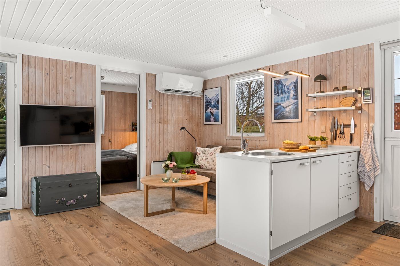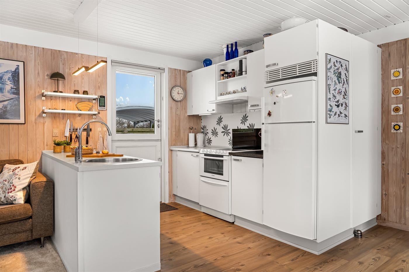 Køkkenet er udstyret med 1 køleskab. Der er 4 keramiske kogeplader, varmluftovn, mikrobølgeovn, Airfryer samt opvaskemaskine.