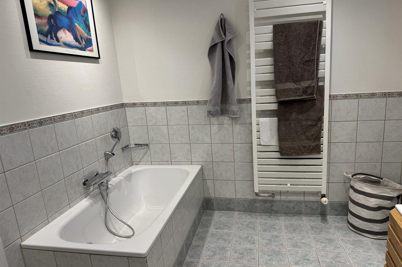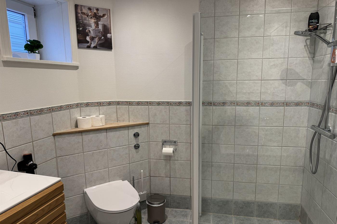 Der er 1 badeværelse med gulvvarme, bruseniche, badekar og toilet. Desuden findes der 1 gæstetoilet ligeledes med gulvvarme.