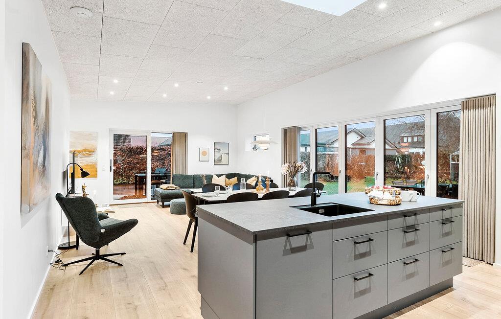 Kun en kort gåtur fra Øster Hurups lange sandstrand venter dette smagfuldt indrettede feriehus på jer. Tilbered friskfanget fisk sammen i det rummelige, åbne køkken-alrum og server resultatet i den stilfulde spiseplads. Tilbring afslappende filmaftener i det komfortable sofaområde eller hel jer til en god læsning i den hyggelige atmosfære, som I ikke har tid til i hverdagen.