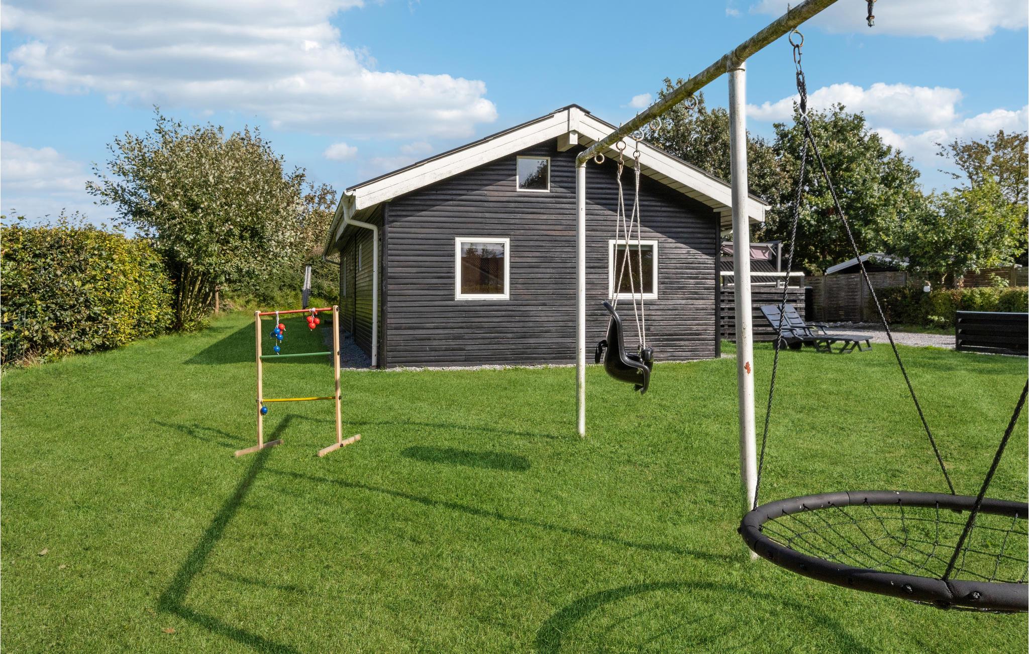 Hyggeligt træhus nær Øster Hurup strand med sauna, spabad og stor terrasse til afslapning og leg.
