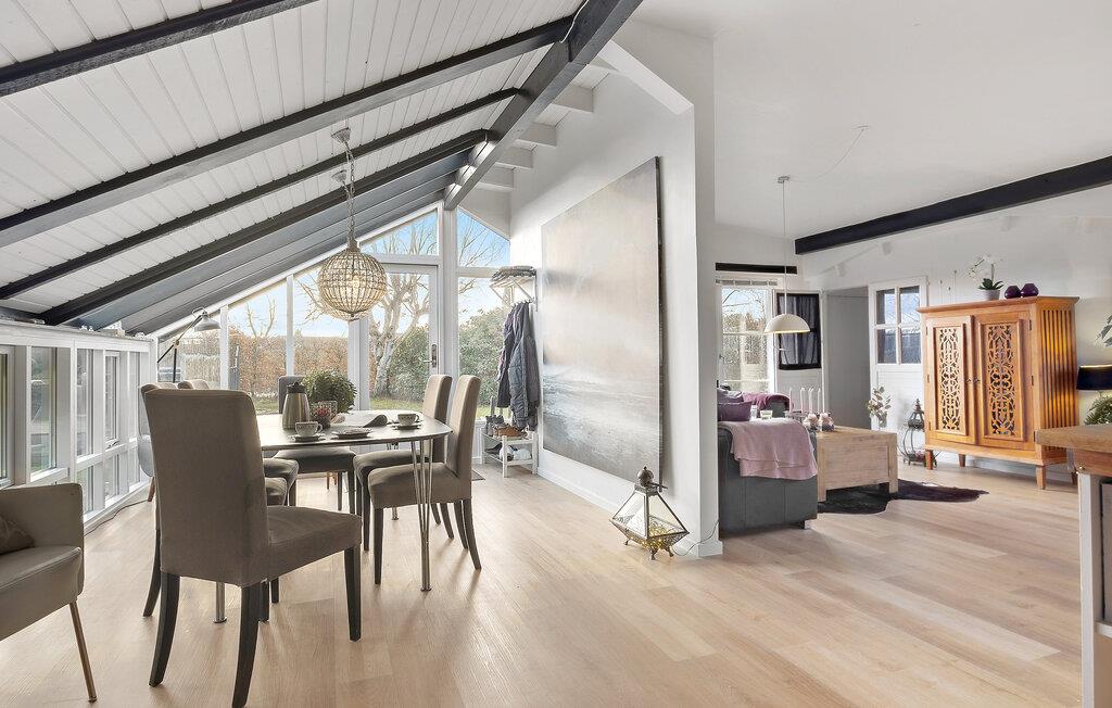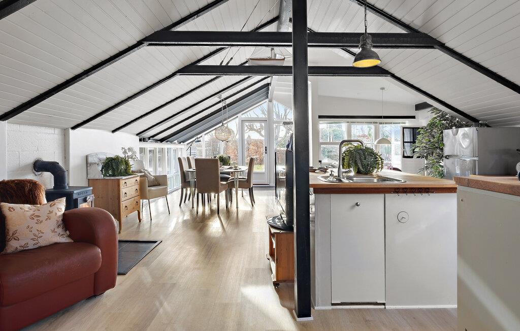 Lad turen gå til Øster Hurup, hvor der venter jer en afslappende ferie med familien i dette smukke hus, som fremstår særdeles charmerende med sine mørke træbjælker og åbne planløsning. Det naturlige lys siver ind gennem de store vinduespartier i stuen, hvor I kan glæde jer til mange hyggelige stunder i de behagelige møbler ved brændeovnen. I det åbne, veludstyrede køkkener kan I piske familiens livretter sammen og nyde dem ved spisebordet med udsigt til haven.