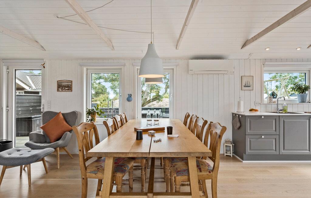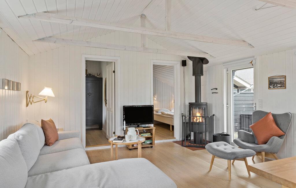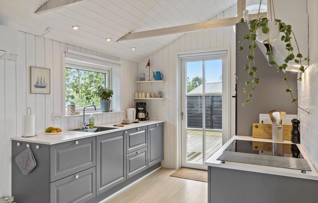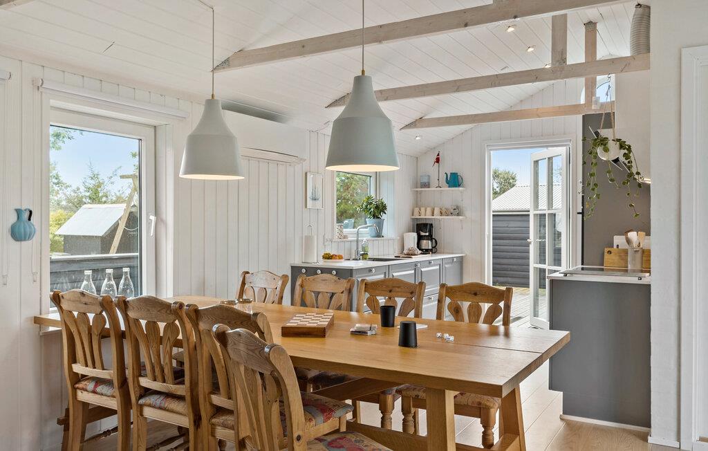 Velkommen til et lyst og lækkert sommerhus, hvor I kan tilbringe nogle herlige feriedage på den nordjyske østkyst. Her er der gode rammer til, at alle kan hygge sig. Opholdsstuen er elegant og smagfuld med flot kig til trækonstruktionen i loftet og en brændeovn, som er skærmet af for små nysgerigge fingre. Der er basis for en masse afslappende stunder, hvor alle sidder med hver deres sysler i samme rum, har ro til måltiderne og giver sig tid til kuliniariske udfoldelser i køkkenet.