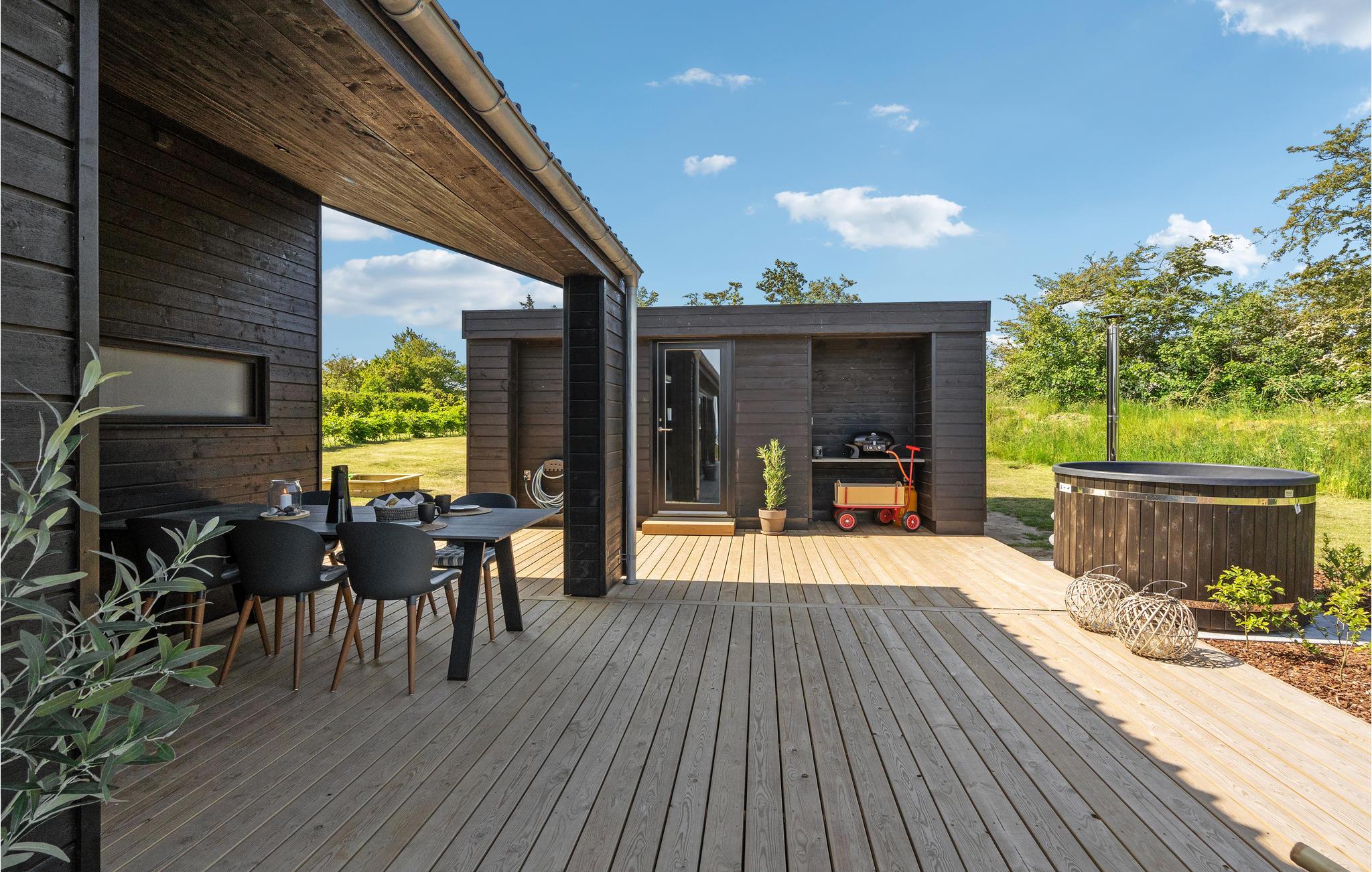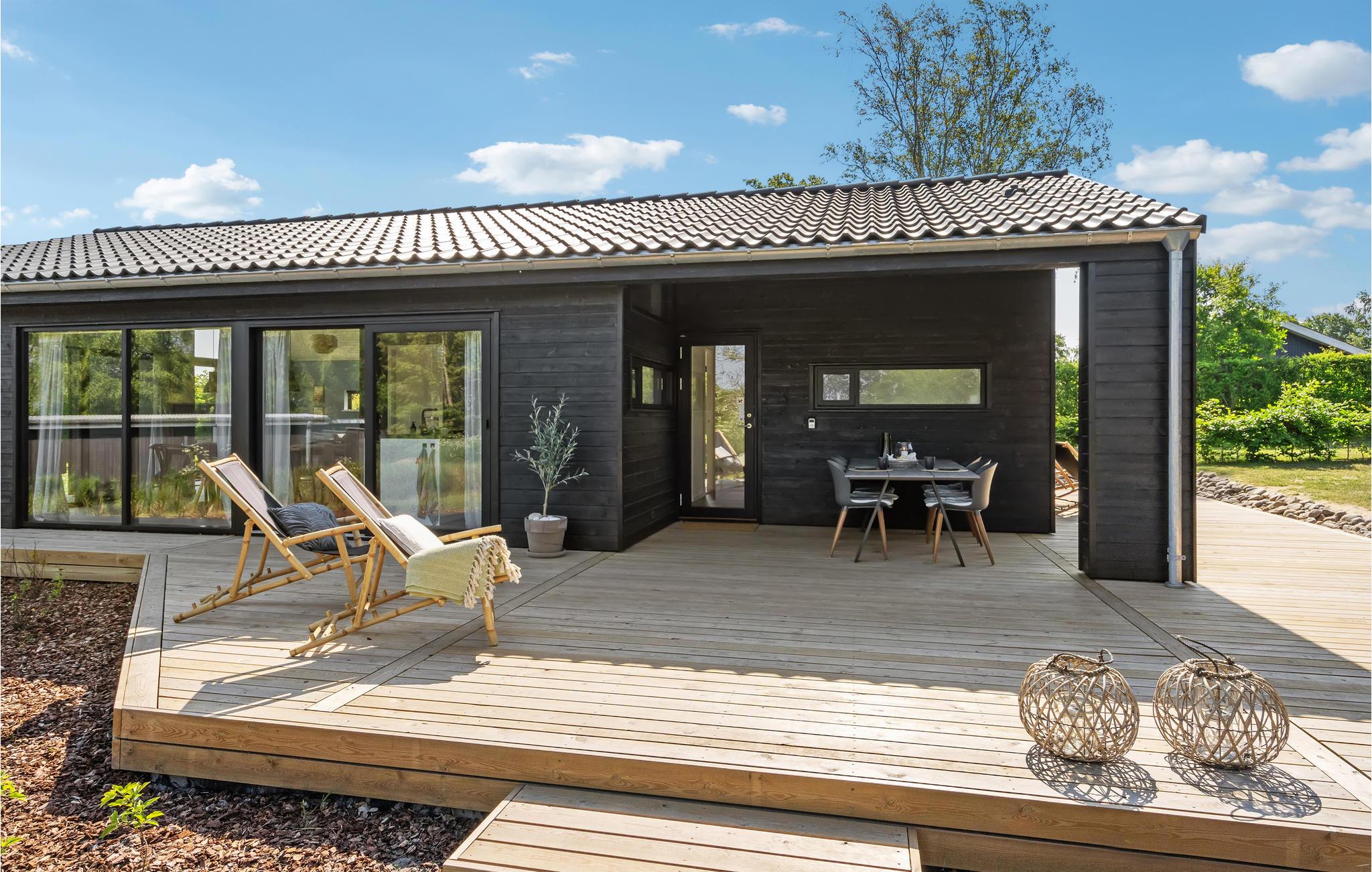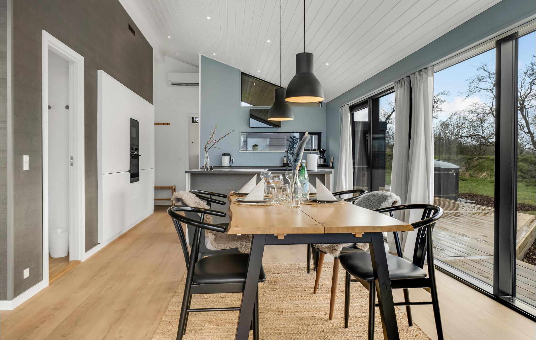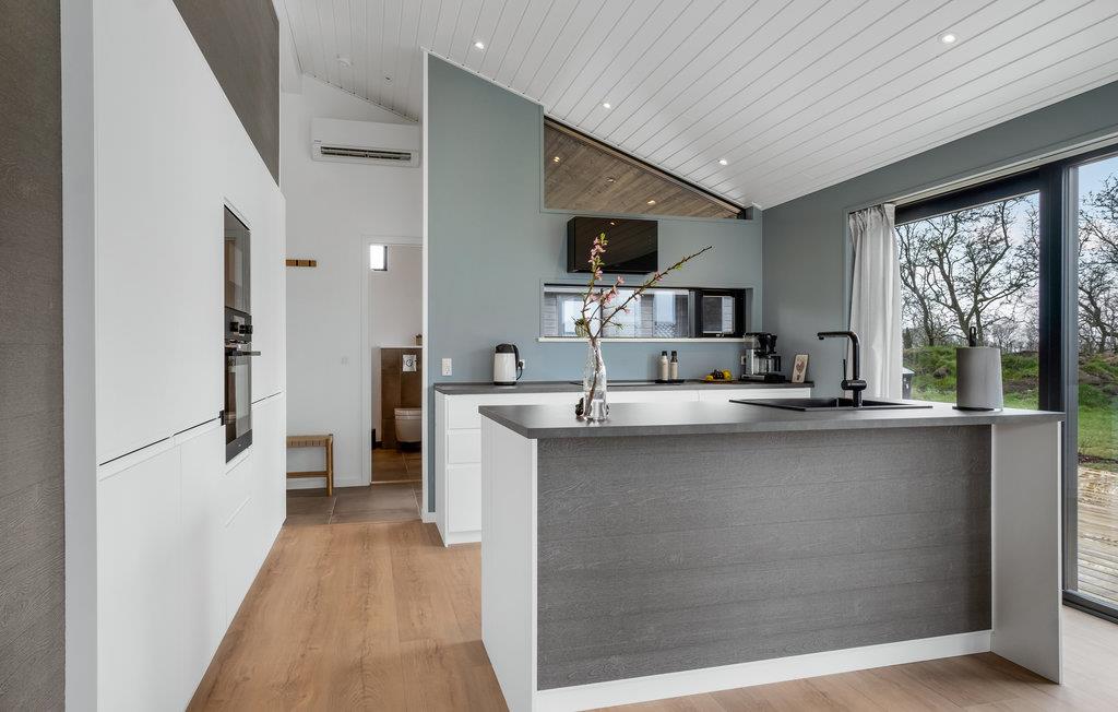 I ugenerte rammer for enden af en vej finder I dette helt igennem skønne hus, som kan blive rammen om jeres næste ferie. Ud over boligens høje komfort er der også lagt vægt på energivenlige løsninger. Stuen er et helt særligt rum at samles i, for her mærker man især, hvordan ingen detaljer i boligen er tilfældige. Både, når I laver mad, nyder dagens måltider og hygger jer med brætspil, bidrager rummet med en vidunderlig atmosfære, der er båret af de store vinduespartier ud mod grunden og de lækre materialer, som indgår i indretningen. Om morgenen kan I dagens første kop kaffe på terrassen og se ud over vandet.