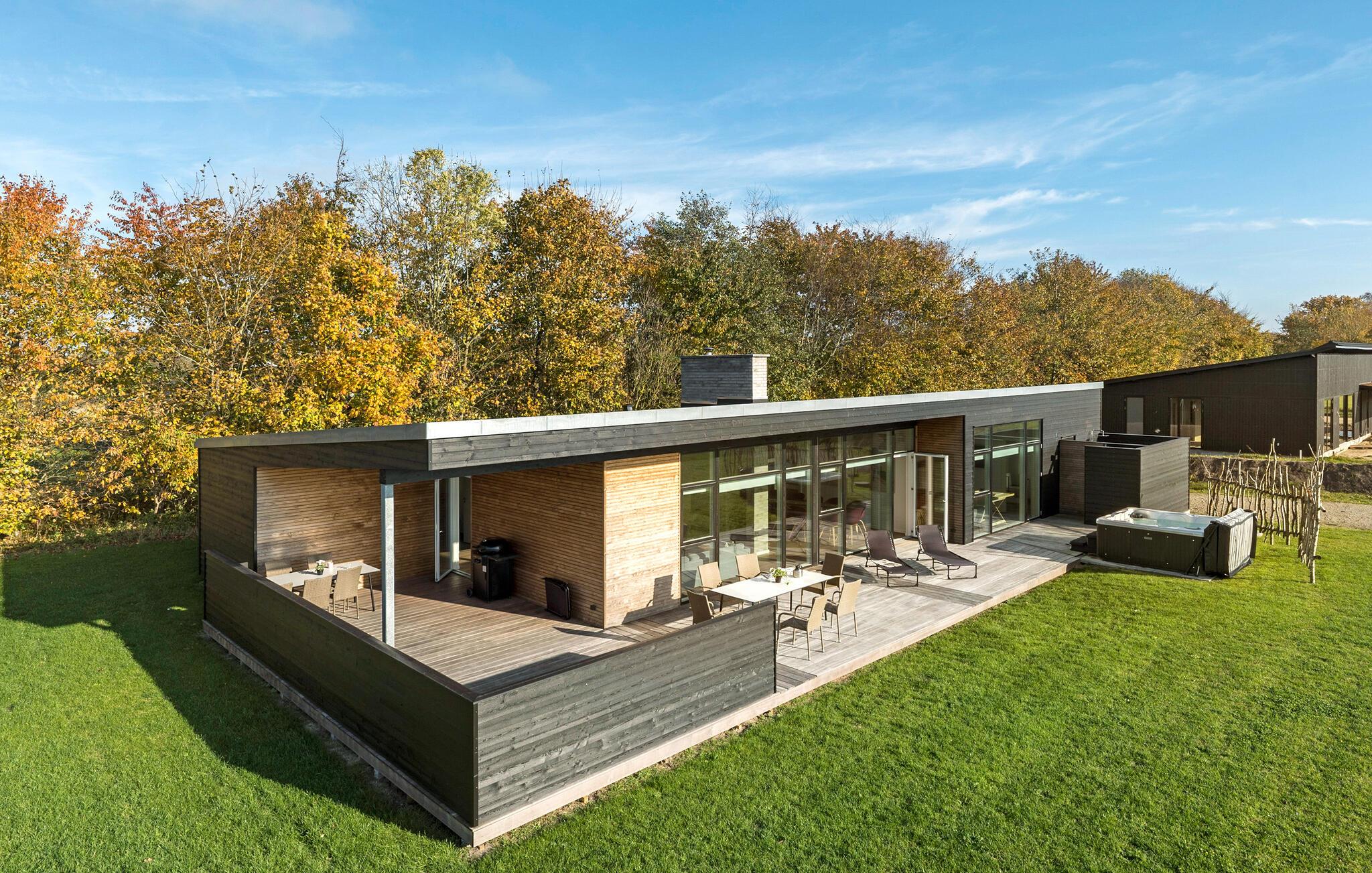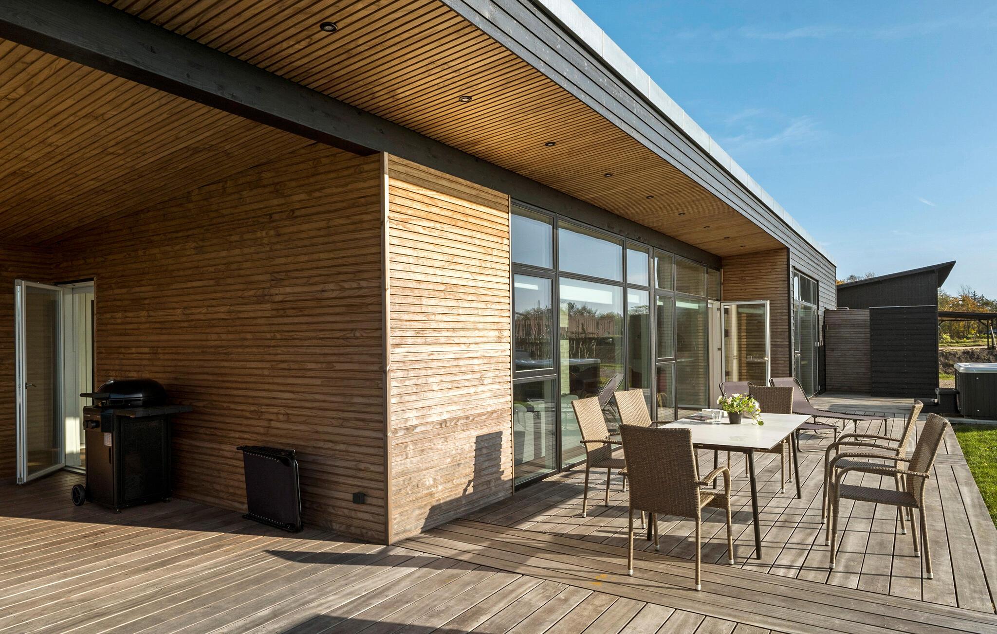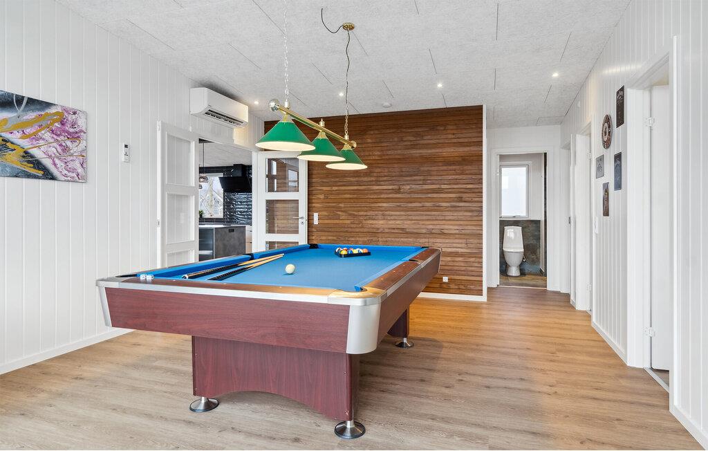 Velkommen til dette vidunderlige feriehus, hvor I får alt, hvad I drømmer om. Ikke bare er huset både moderne og komfortabelt; det er også stort nok til, at I kan tage den udvidede familie eller en større vennegruppe med på en herlig ferie. Huset er særdeles smagfuldt indrettet med store, flotte vinduespartier, som lader opholds- og spisestuen fylde op med dagslys og giver en skøn udsigt til haven. I det store, åbne opholdsrum vil I opleve en dejlig atmosfære, der accentueres af den behagelige knitren fra brændeovnen. I finder også et aktivitetsrum, hvor I blandt andet kan udfordre hinanden til et slag bordtennis. Og hvis I får lyst til at gøre det lækkert for jer selv, kan I nyde en wellness-oplevelse i saunaen eller i spabadet under den betagende stjernehimmel.