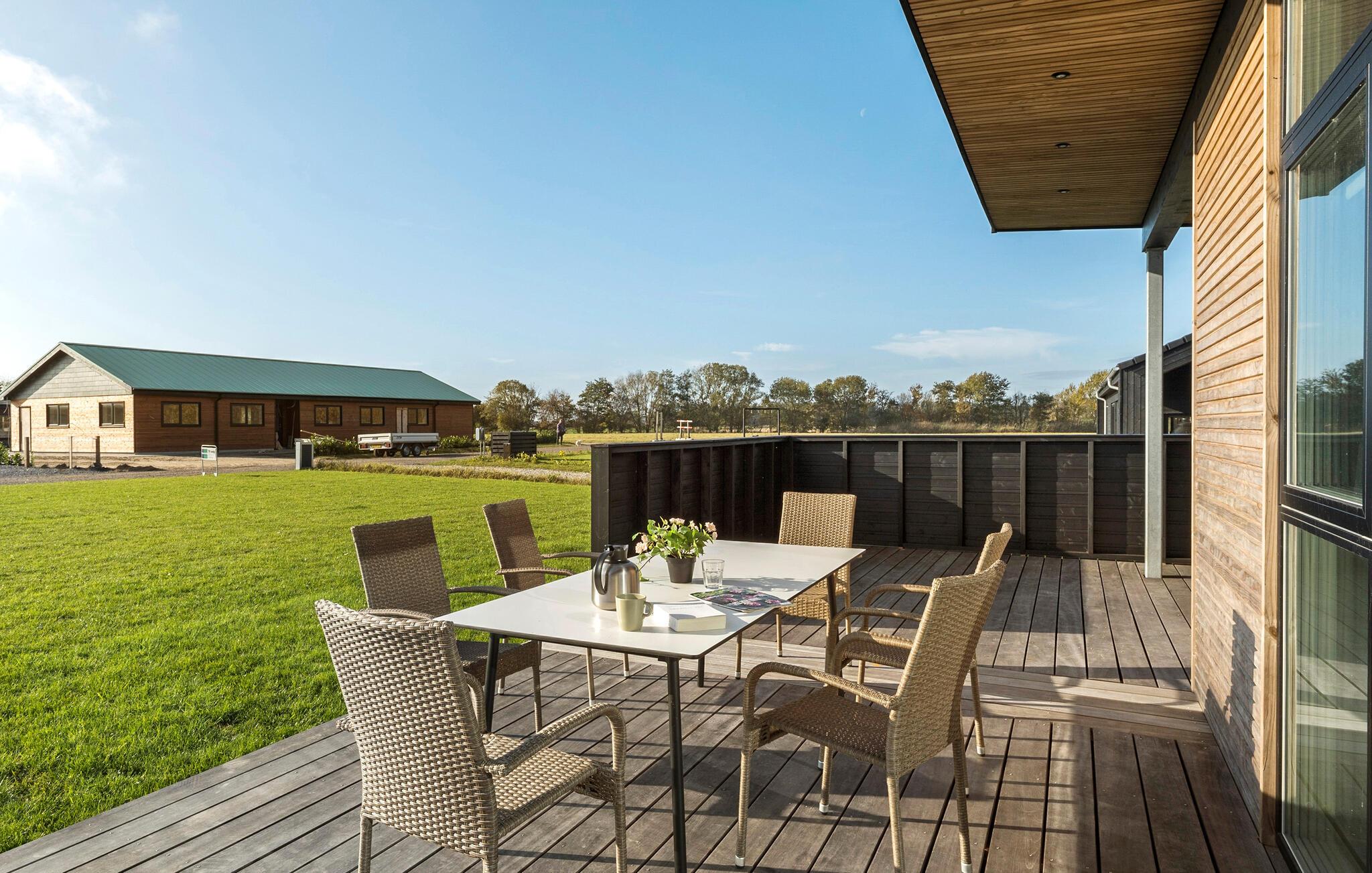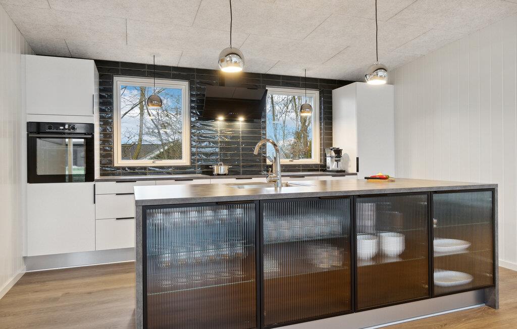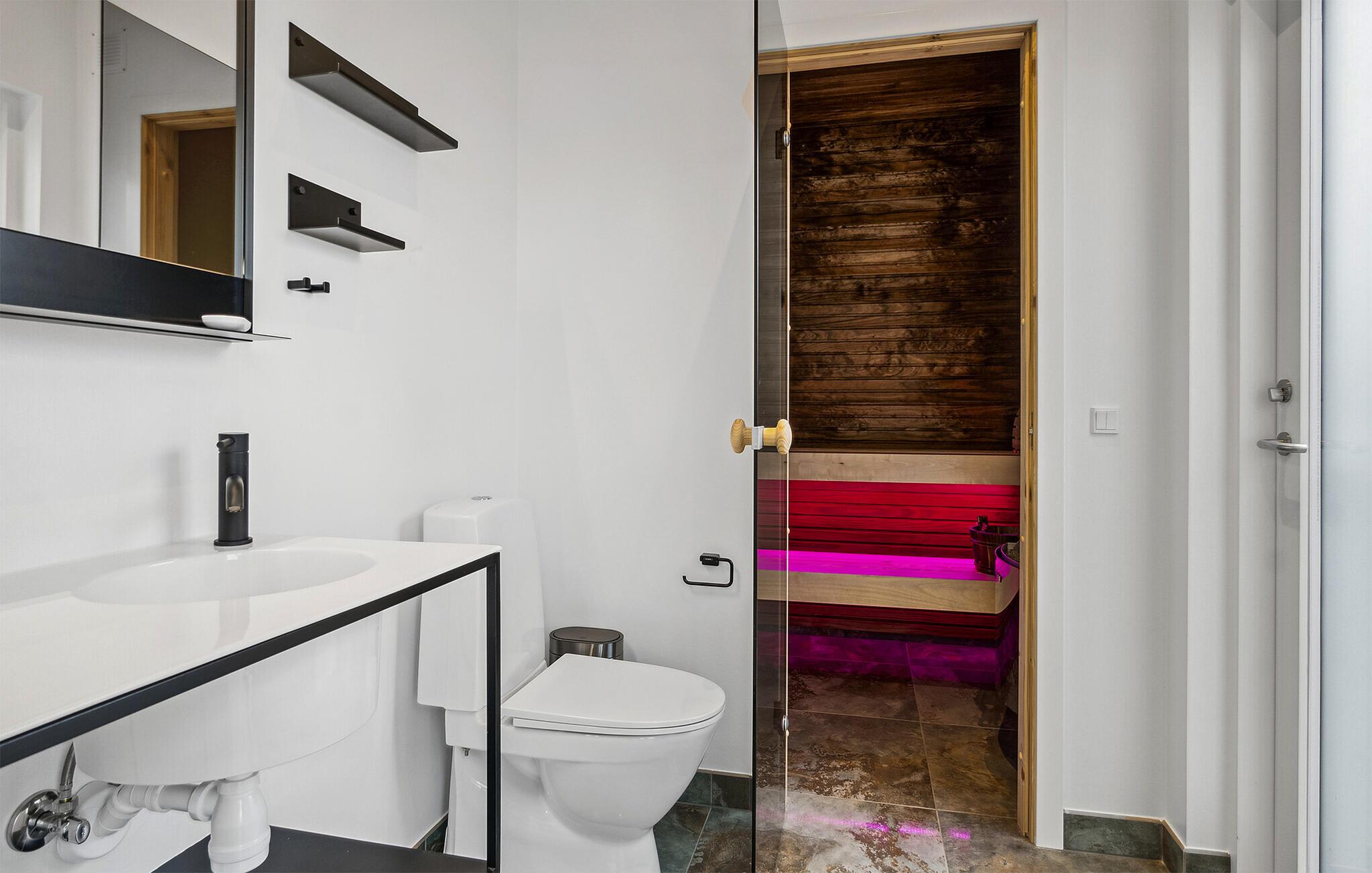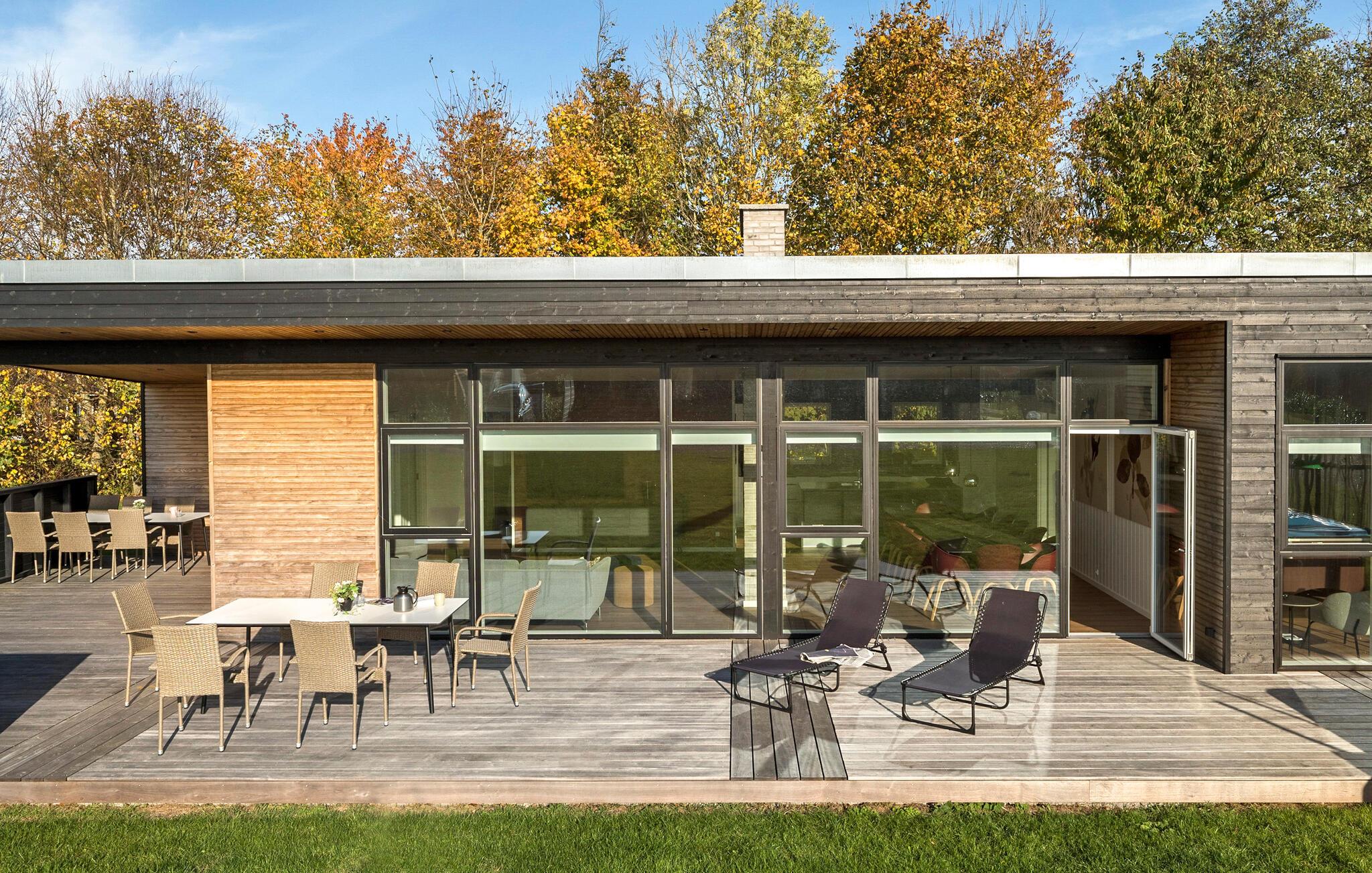 Velkommen til dette vidunderlige feriehus, hvor I får alt, hvad I drømmer om. Ikke bare er huset både moderne og komfortabelt; det er også stort nok til, at I kan tage den udvidede familie eller en større vennegruppe med på en herlig ferie. Huset er særdeles smagfuldt indrettet med store, flotte vinduespartier, som lader opholds- og spisestuen fylde op med dagslys og giver en skøn udsigt til haven. I det store, åbne opholdsrum vil I opleve en dejlig atmosfære, der accentueres af den behagelige knitren fra brændeovnen. I finder også et aktivitetsrum, hvor I blandt andet kan udfordre hinanden til et slag bordtennis. Og hvis I får lyst til at gøre det lækkert for jer selv, kan I nyde en wellness-oplevelse i saunaen eller i spabadet under den betagende stjernehimmel.