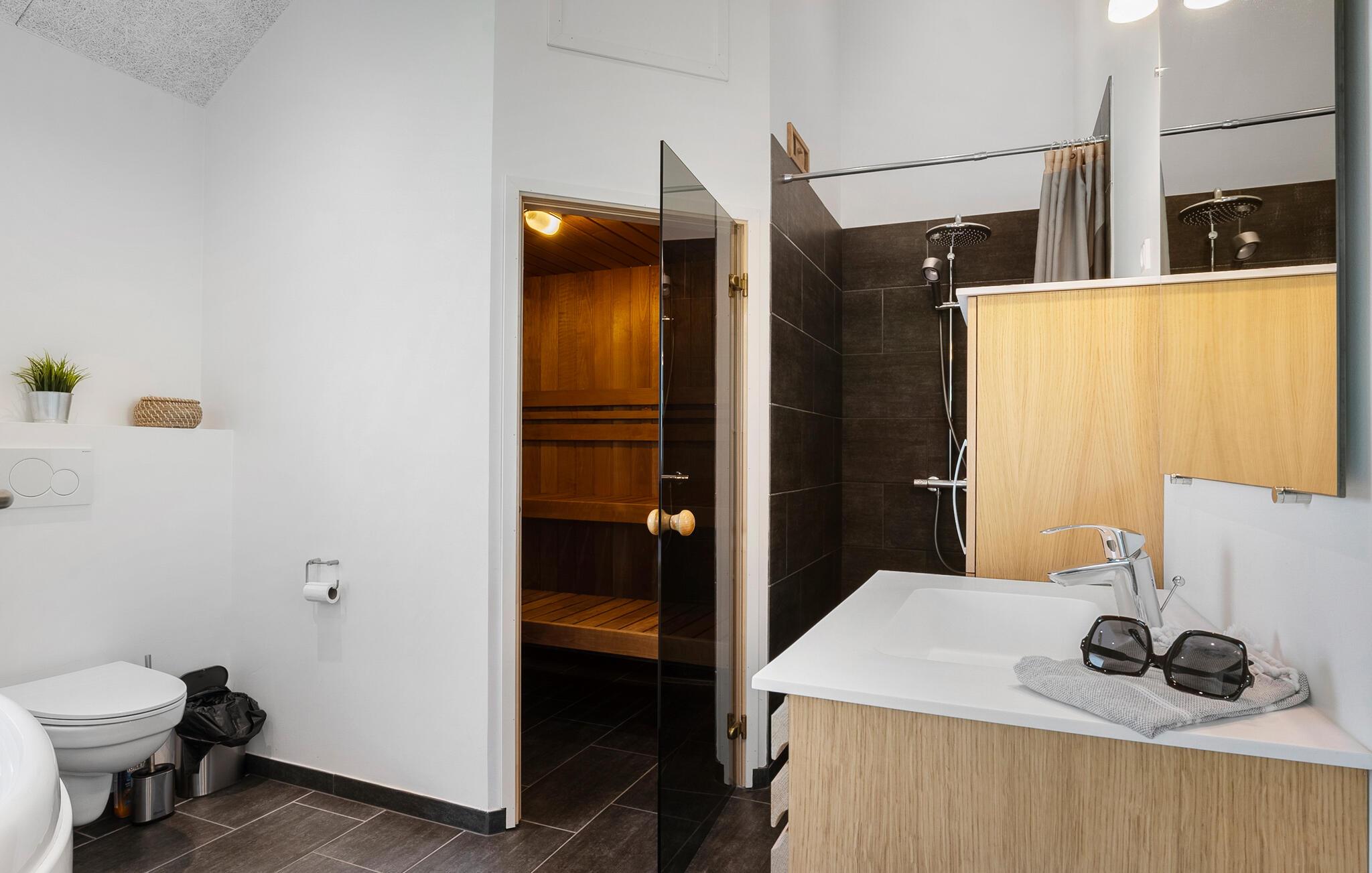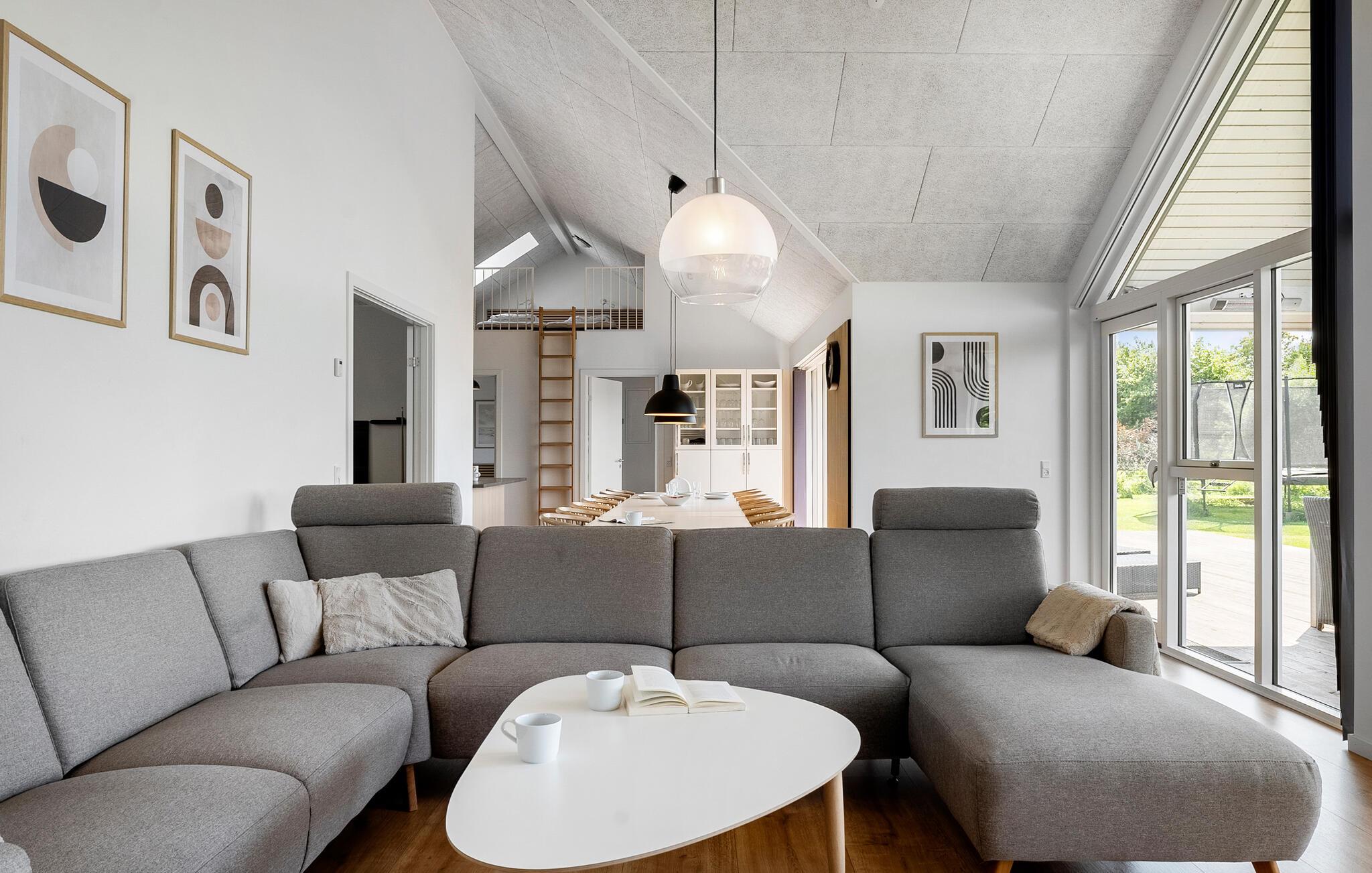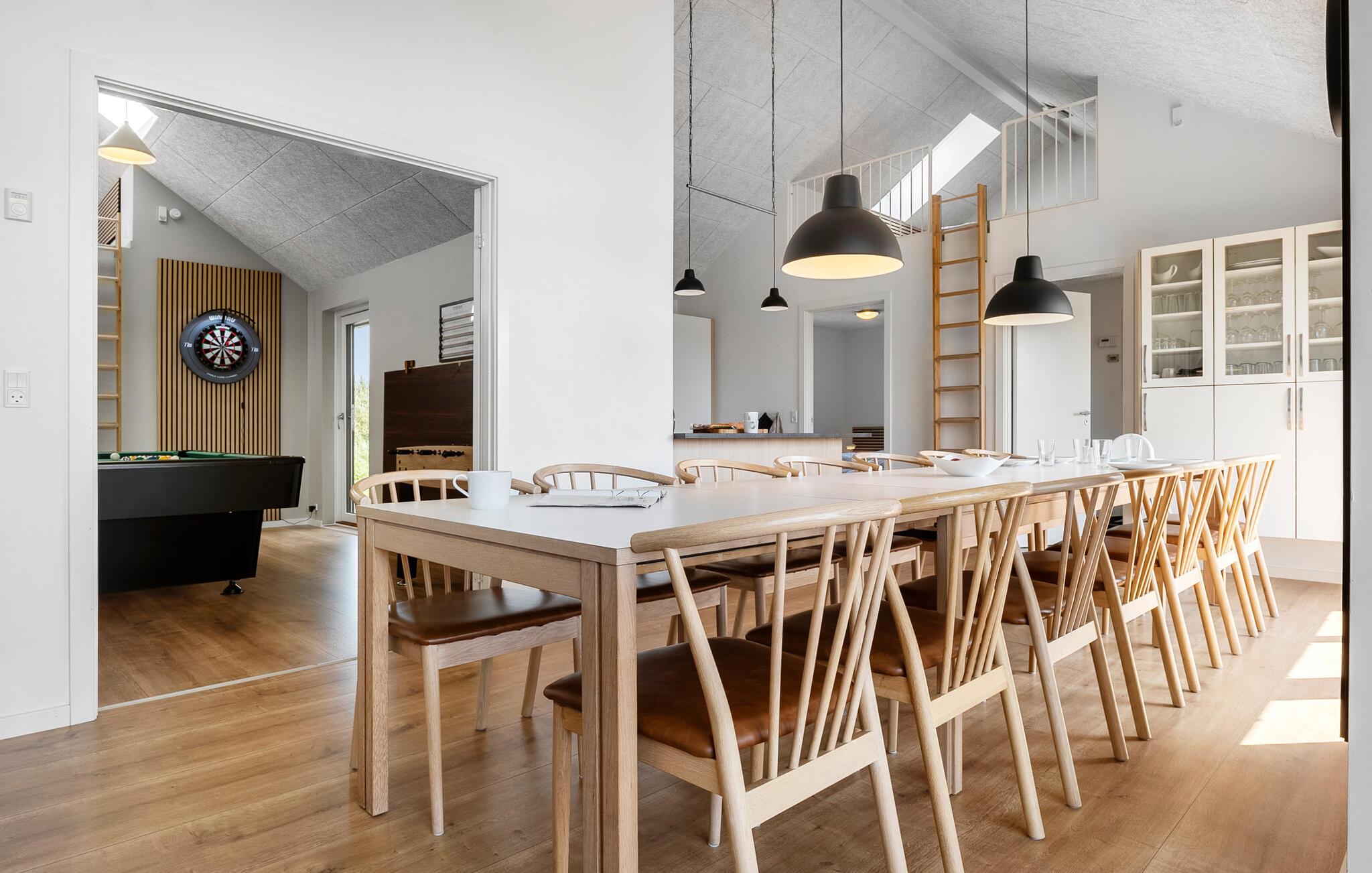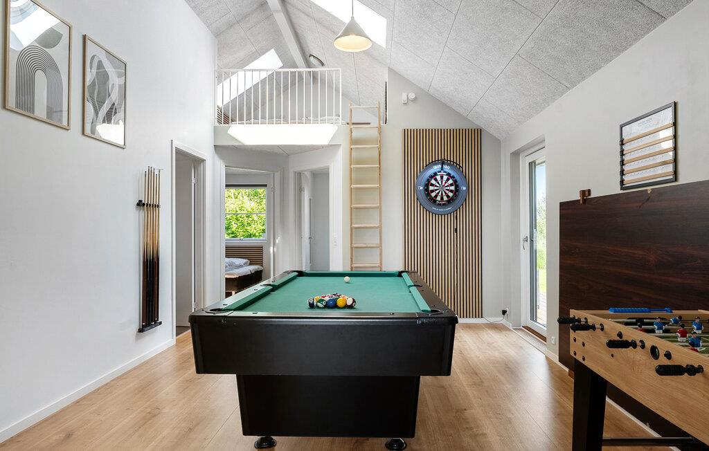 Glæd jer til en afslappende og uforglemmelig familieferie i dette smukke og komfortable hus med god plads – også til den større familie. Nyd udsigten til det fri allerede fra morgenstunden i de hyggelige soveværelser eller det lyse hemseområde. Elsker I wellness, kan I slappe af i saunaen eller spabadet og lade sjælen finde ro. Udfordr hinanden i familieturneringer med billard, bordtennis eller dart, og nyd tiden sammen.