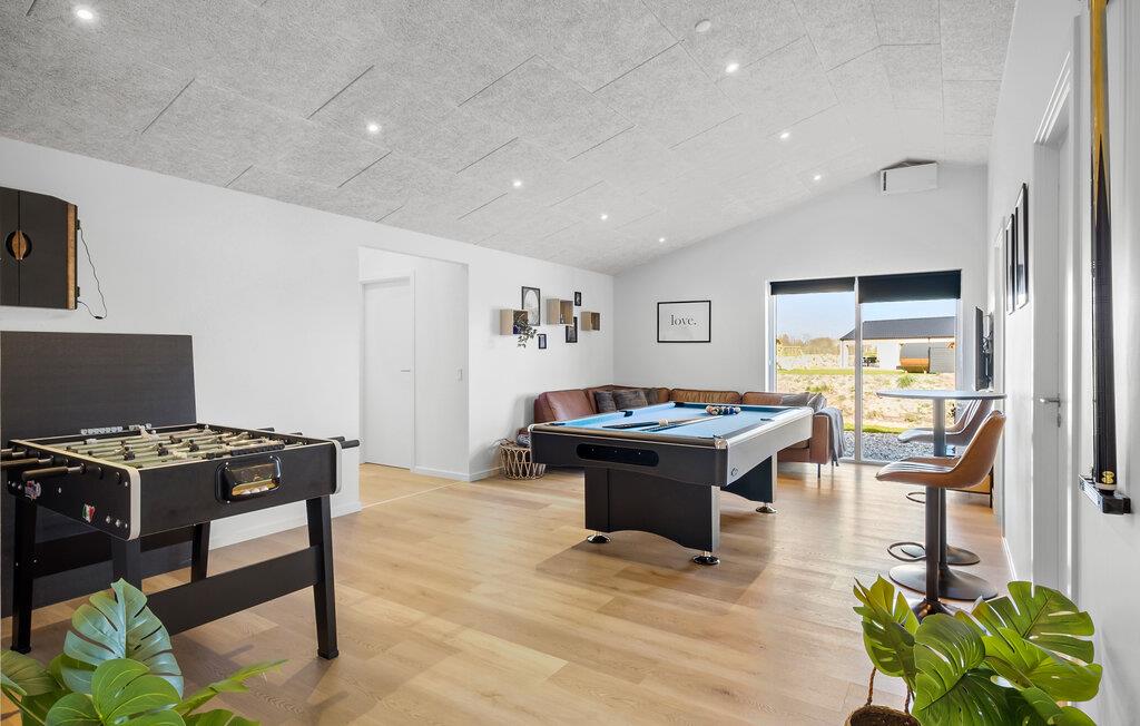 Velkommen til dette vidunderlige hus, hvor I får den perfekte base til årets store sammenkomst med hele familien på tværs af generationerne. Indretningen fremtræder flot og stilrent over hele linjen med dé faciliteter, I behøver for at kunne tilberede nogle lækre måltider og nyde dem ved det lange spisebord med plads til alle. Ingen kommer til at kede sig her, ej heller på en gråvejrsdag. Børnene kan plaske rundt i den indendørs pool, mens andre duellerer i et spil dart, pool eller bordfodbold. Og måske I skal runde dagen af med en tur i spabadet eller tøndesaunaen?