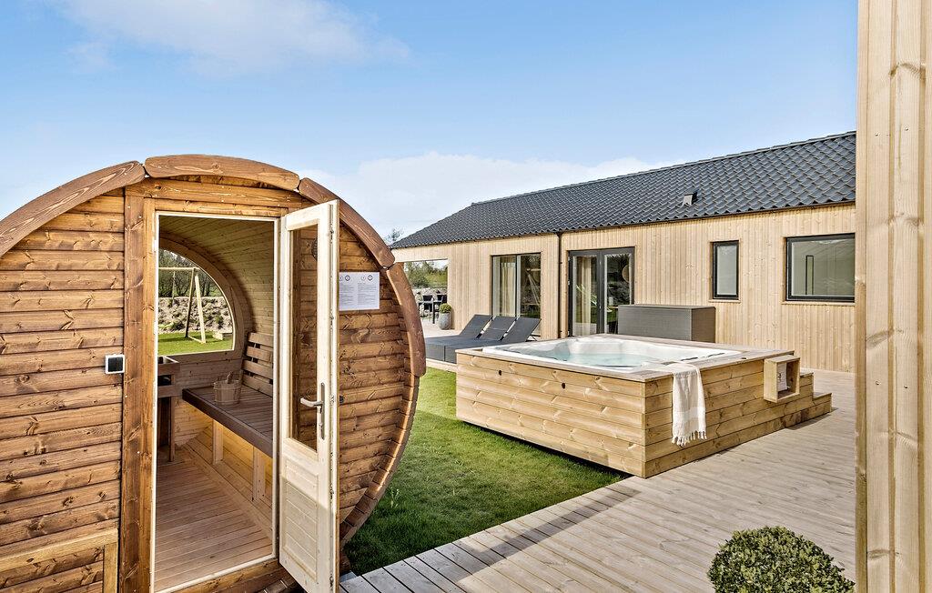 Udearealet er tilsvarende lækkert, og her kan I nyde solen fra morgen til aften. Børnene får masser af plads og deres helt egen legeplads at boltre sig på, mens de voksne kan nyde solen på terrassen med en bog og en god kop kaffe, inden der tændes op i grillen. Og måske I skal runde aftenen af med en tur i tøndesaunaen eller spabadet for lidt ekstra wellness?